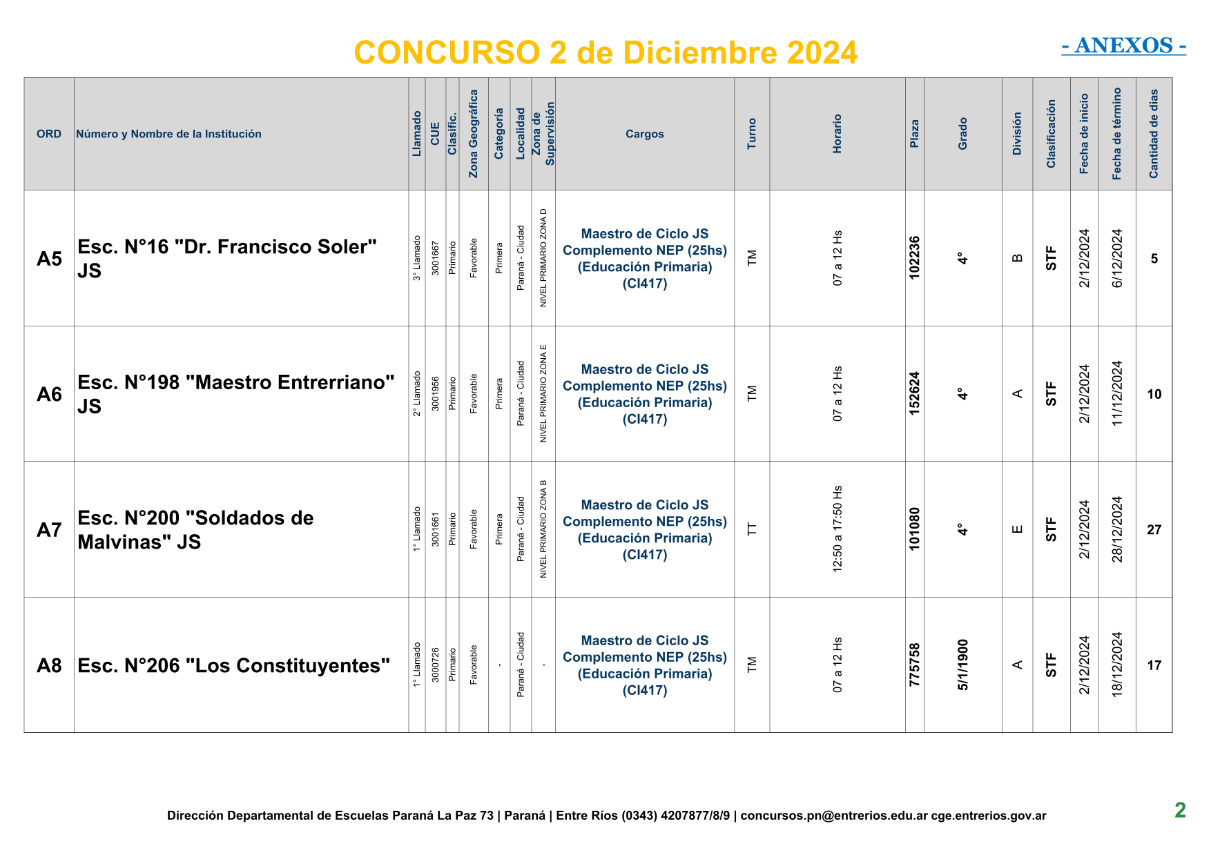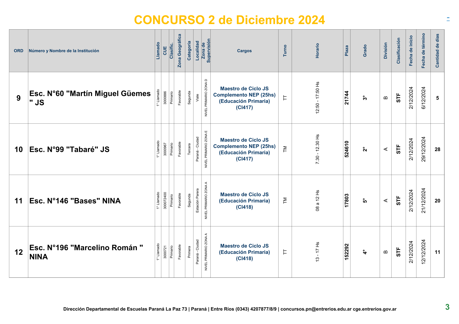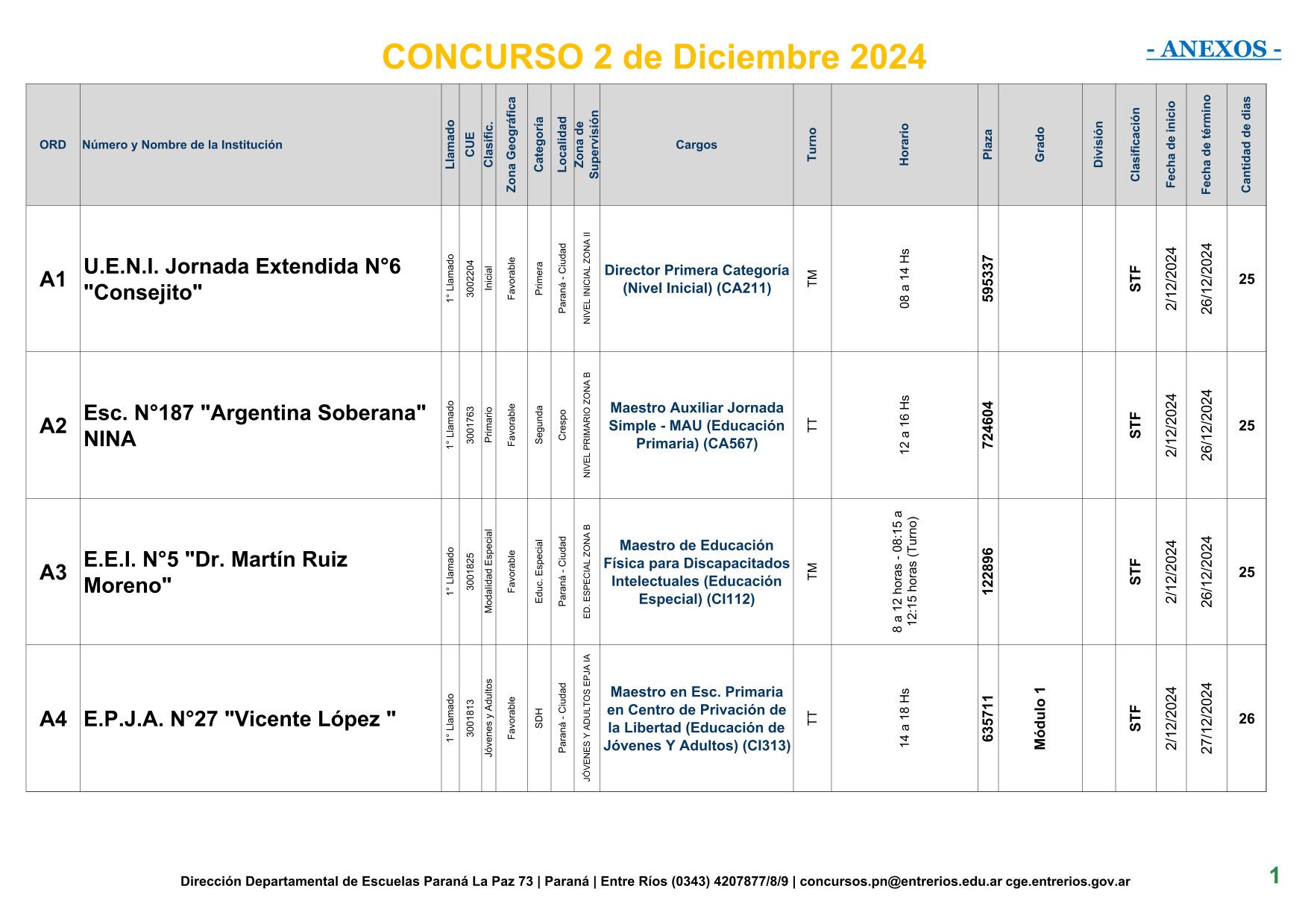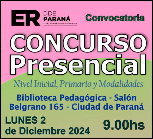 La Dirección Departamental de Escuelas Paraná Convoca a concurso presencial para el día 2 de Diciembre de 2024 a las 9.00 hs, en las instalaciones de la BIBLIOTECA PEDAGÓGICA , sito en calle BELGRANO Nº165 de la Ciudad de Paraná, para la cobertura de Cargos de Ascenso de Nivel Inicial – Primario y Modalidades. En el marco del Acuerdo Paritario /Reglamento de Concursos Resolución Ministerial Nº 783 M.T. (Res. 1000/13) –Circular Nº 1-24 JC procedimientos Listado Complementario – Resolución Nº 0691/21 CGE y sus modificatorias,- De Director, Resolución Nº 1200/22 C.G.E. y modificatorias – De Vicedirector, Resolución Nº 1200/22 C.G.E. y modificatorias – Listado de Suplencias vigentes: Listado de Suplencias de Ascenso Nº 188 y el Listado de Suplencias de Ingreso Nº 188. – Circular-Nº-04-22-CGE-Designaciones-personal-docente-por-Artículo-40 – Designaciones por Art80: Resolucion-1882-24-CGE-Ordenamiento-Extraordinario-para-Adjudicacion-de-Cargos-de-Maestro-de-Ciclo-Jornada-Simple-Dpto-Uruguay – 3395-24 CGE Modifica Res. 1882-24 CGE nombramientos de suplencias