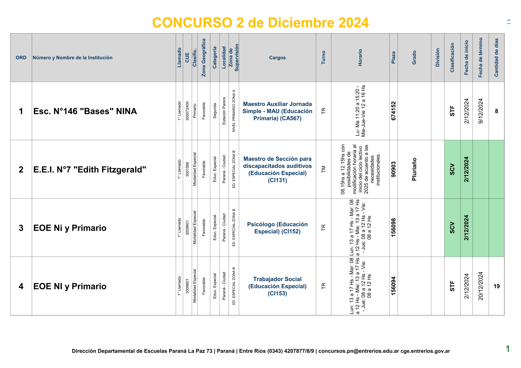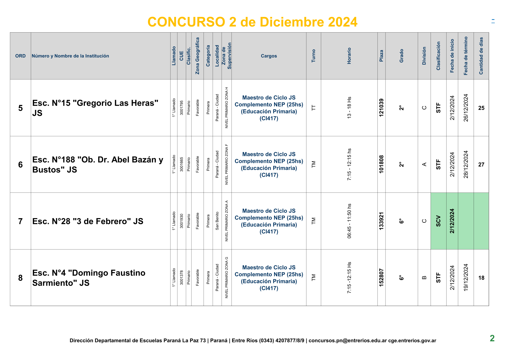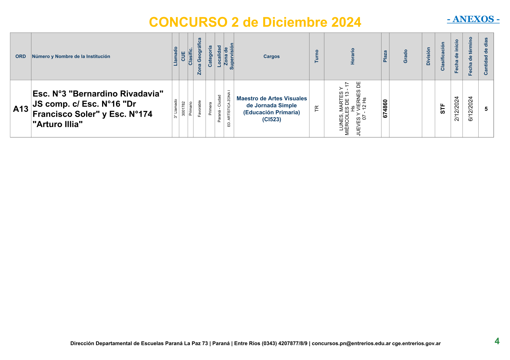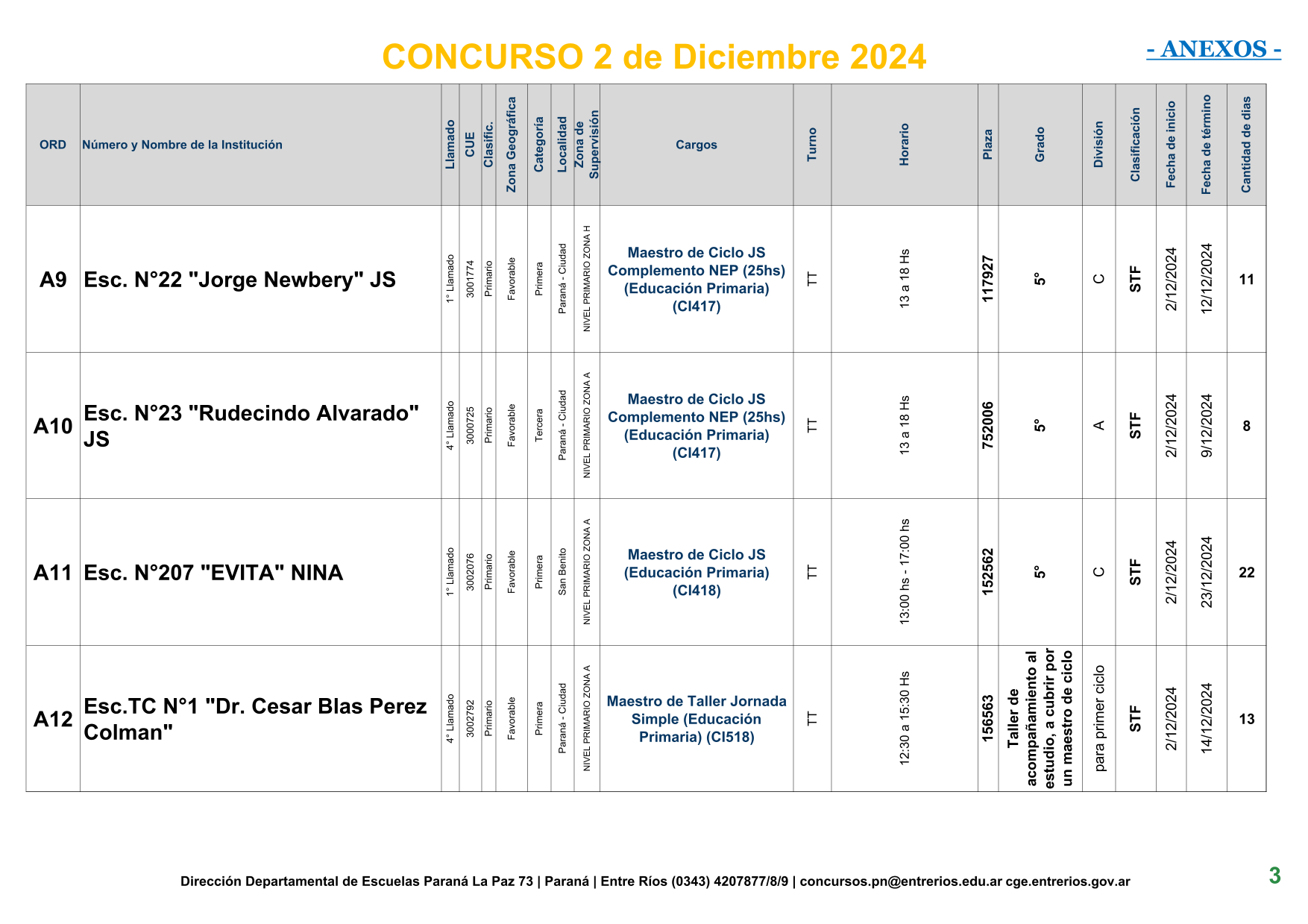 La Dirección Departamental de Escuelas Paraná Convoca a concurso presencial para el día 2 de Diciembre de 2024 a las 9.00 hs, en las instalaciones de la BIBLIOTECA PEDAGÓGICA , sito en calle BELGRANO Nº165 de la Ciudad de Paraná, para la cobertura de Cargos de Ascenso de Nivel Inicial – Primario y Modalidades. En el marco del Acuerdo Paritario /Reglamento de Concursos Resolución Ministerial Nº 783 M.T. (Res. 1000/13) –Circular Nº 1-24 JC procedimientos Listado Complementario – Resolución Nº 0691/21 CGE y sus modificatorias,- De Director, Resolución Nº 1200/22 C.G.E. y modificatorias – De Vicedirector, Resolución Nº 1200/22 C.G.E. y modificatorias – Listado de Suplencias vigentes: Listado de Suplencias de Ascenso Nº 188 y el Listado de Suplencias de Ingreso Nº 188. – Circular-Nº-04-22-CGE-Designaciones-personal-docente-por-Artículo-40 – Designaciones por Art80: Resolucion-1882-24-CGE-Ordenamiento-Extraordinario-para-Adjudicacion-de-Cargos-de-Maestro-de-Ciclo-Jornada-Simple-Dpto-Uruguay – 3395-24 CGE Modifica Res. 1882-24 CGE nombramientos de suplencias
