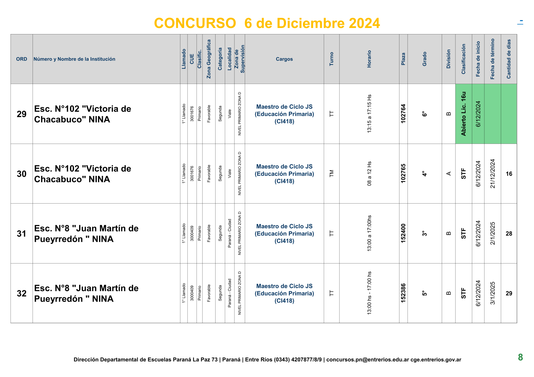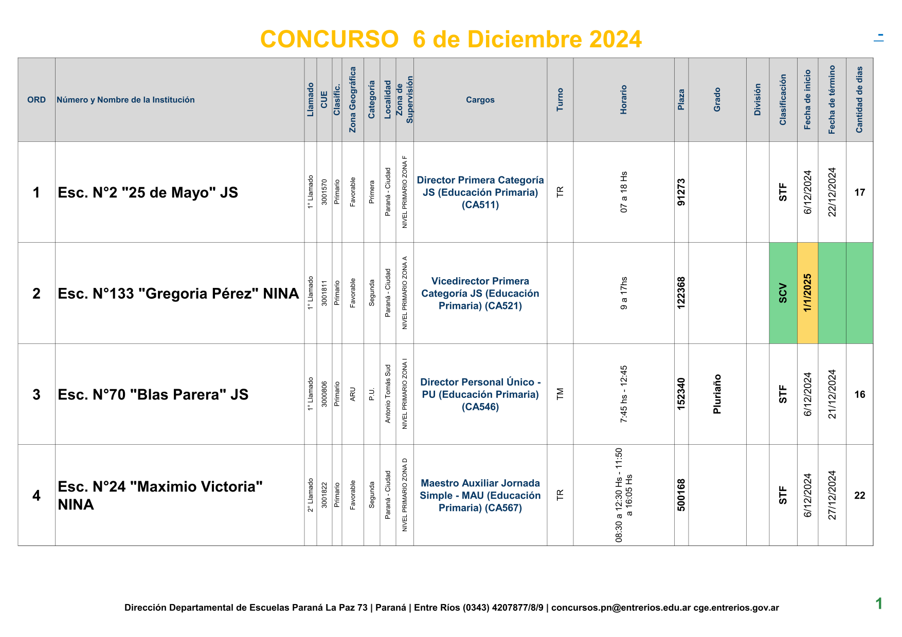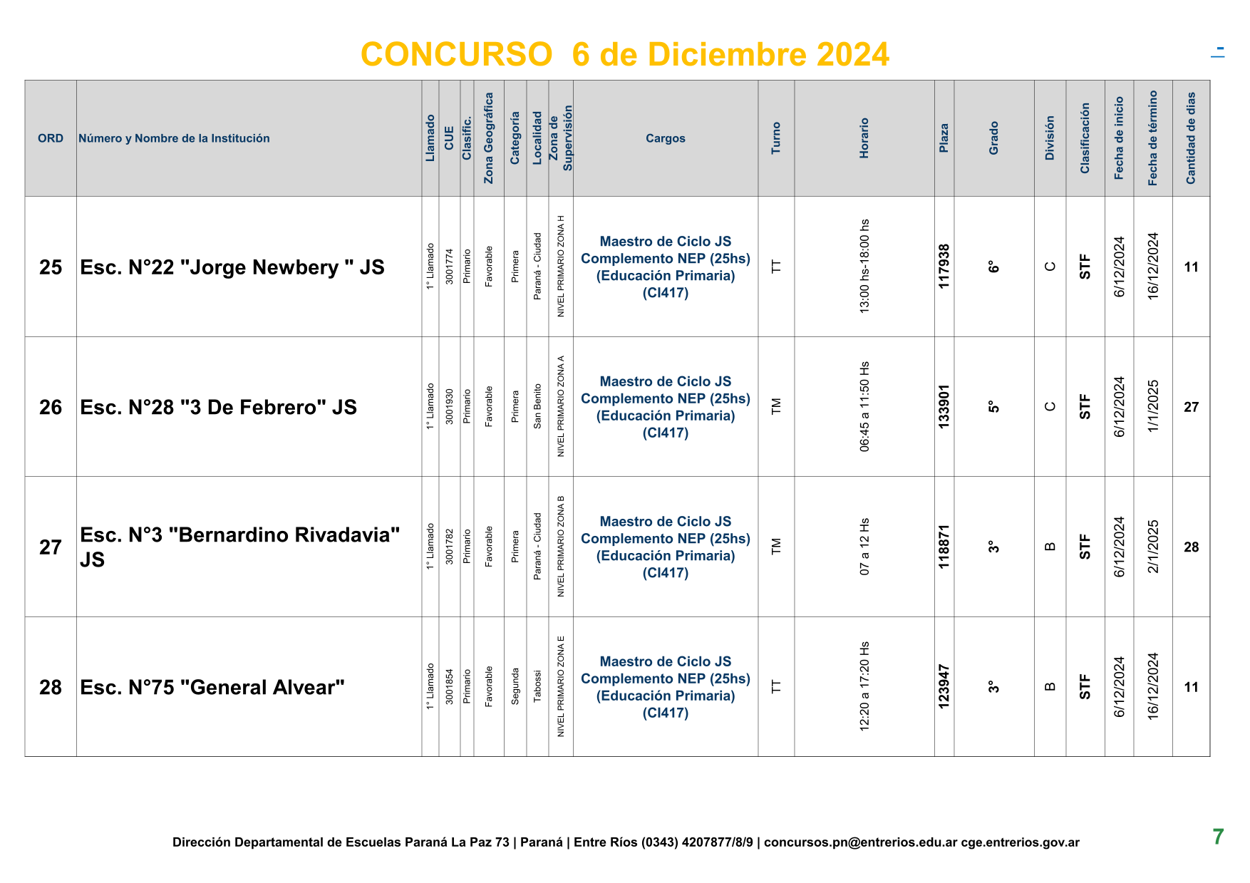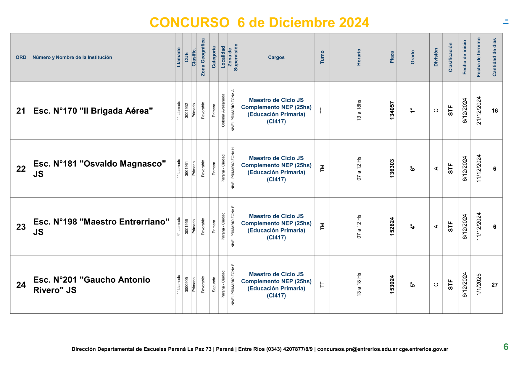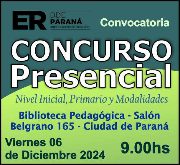 La Dirección Departamental de Escuelas Paraná Convoca a concurso presencial para el día 6 de Diciembre de 2024 a las 9.00 hs, en las instalaciones de la BIBLIOTECA PEDAGÓGICA , sito en calle BELGRANO Nº165 de la Ciudad de Paraná, para la cobertura de Cargos de Ascenso de Nivel Inicial – Primario y Modalidades. En el marco del Acuerdo Paritario /Reglamento de Concursos Resolución Ministerial Nº 783 M.T. (Res. 1000/13) –Circular Nº 1-24 JC procedimientos Listado Complementario – Resolución Nº 0691/21 CGE y sus modificatorias,- De Director, Resolución Nº 1200/22 C.G.E. y modificatorias – De Vicedirector, Resolución Nº 1200/22 C.G.E. y modificatorias – Listado de Suplencias vigentes: Listado de Suplencias de Ascenso Nº 188 y el Listado de Suplencias de Ingreso Nº 188. – Circular-Nº-04-22-CGE-Designaciones-personal-docente-por-Artículo-40 – 3100-24-CGE-Autodesplazamiento – Designaciones por Art80: Resolucion-1882-24-CGE-Ordenamiento-Extraordinario-para-Adjudicacion-de-Cargos-de-Maestro-de-Ciclo-Jornada-Simple-Dpto-Uruguay – 3395-24 CGE Modifica Res. 1882-24 CGE nombramientos de suplencias