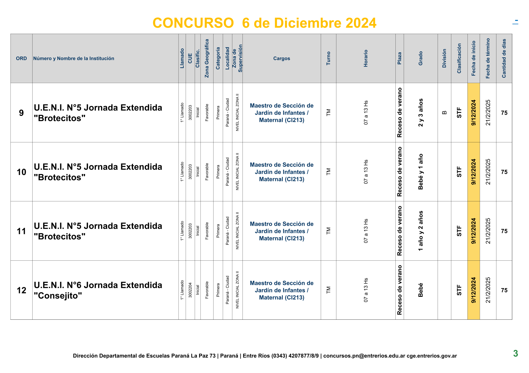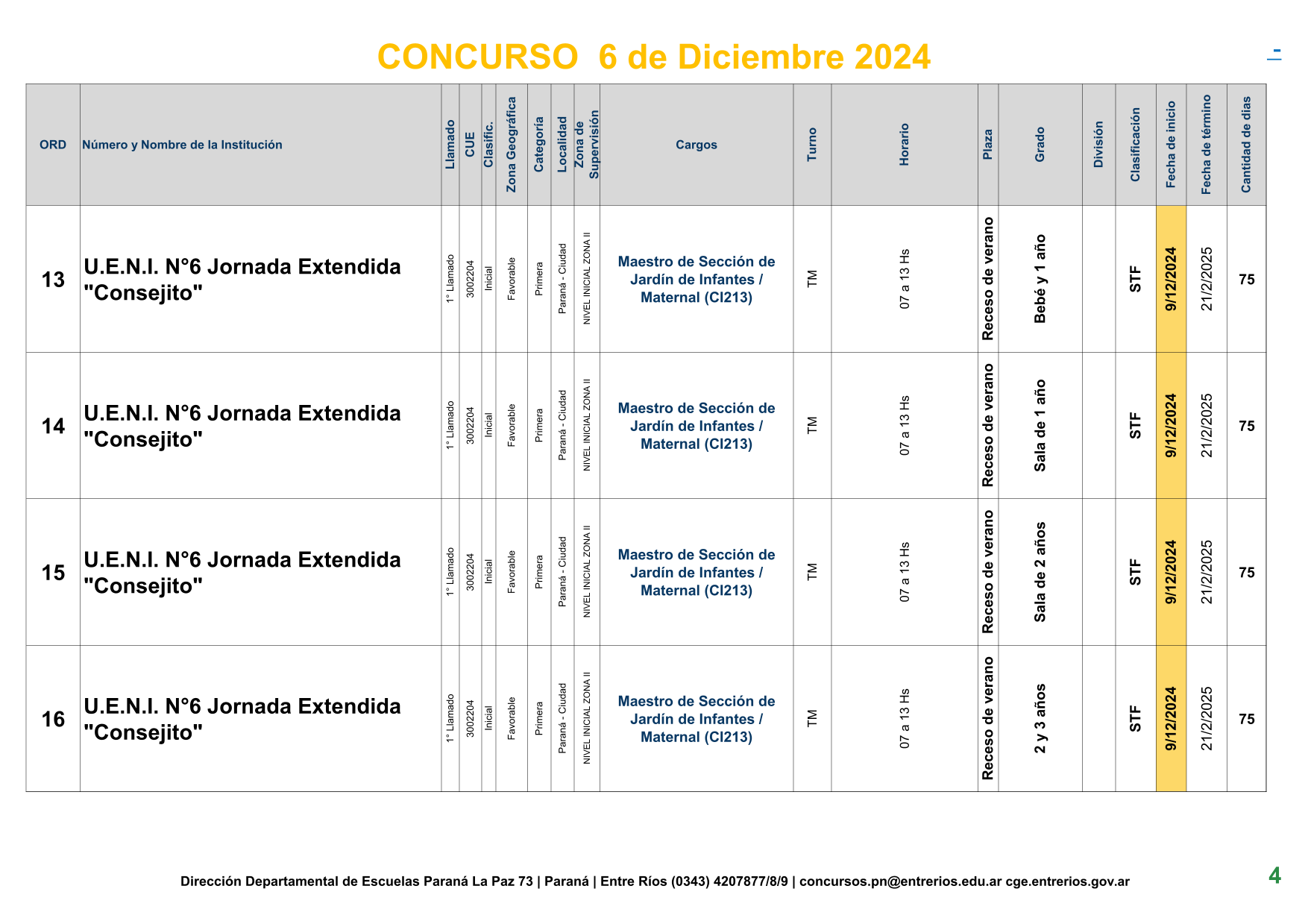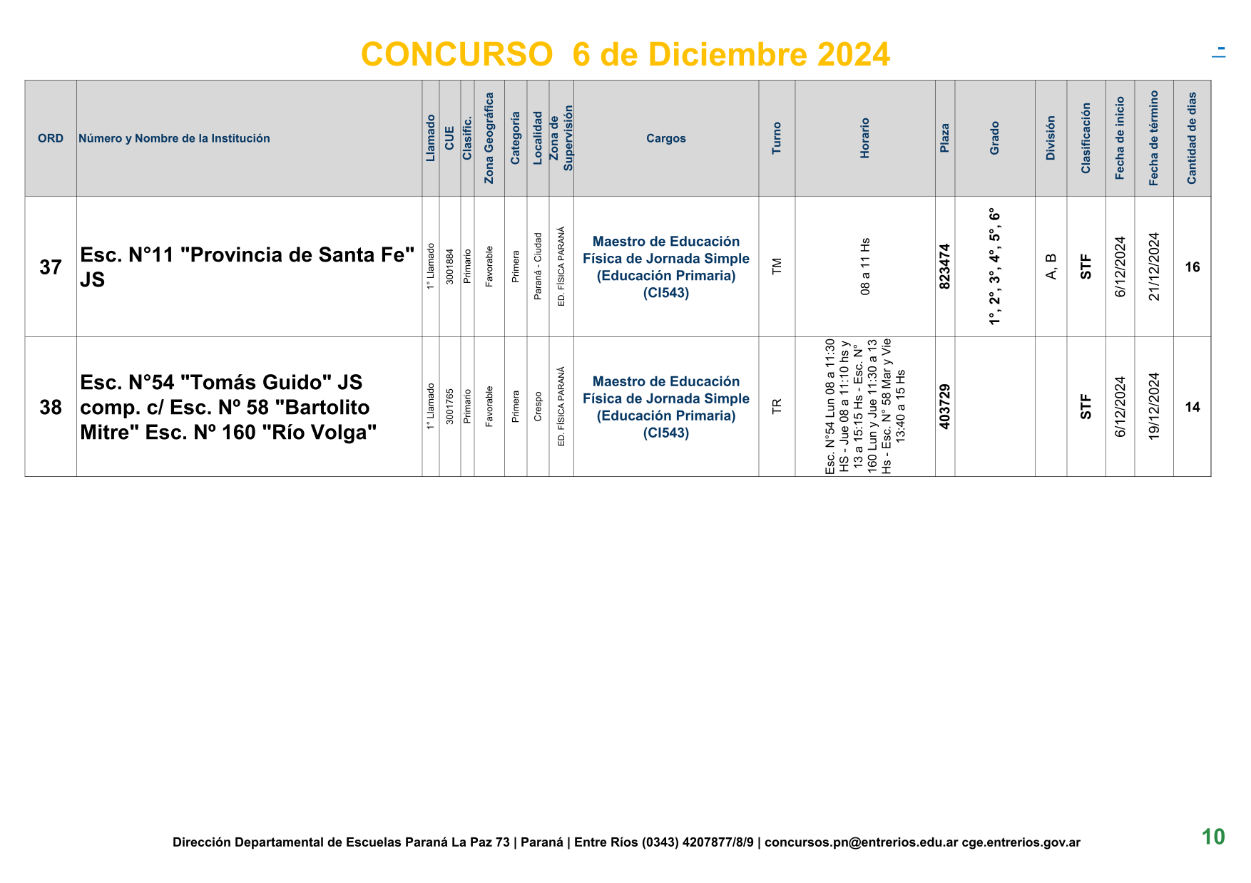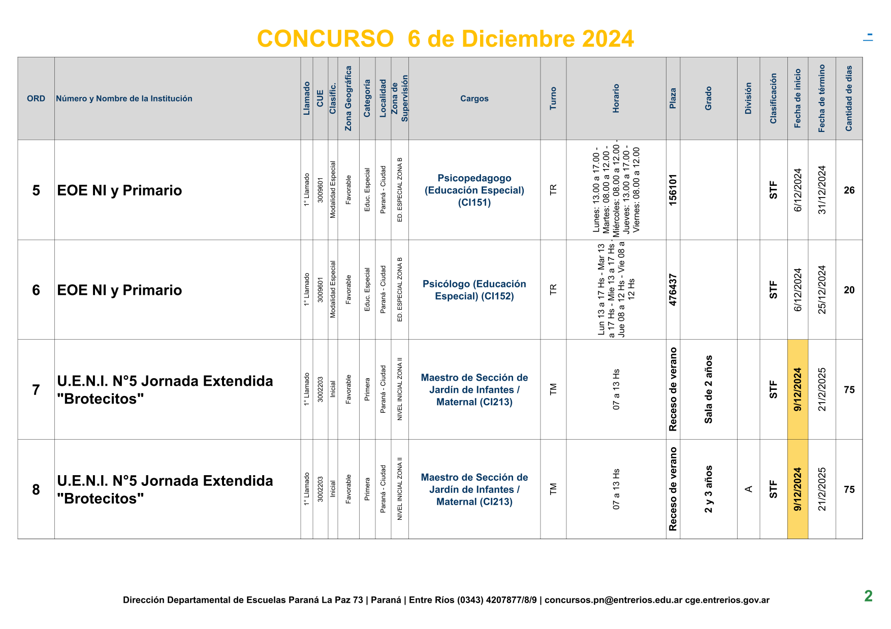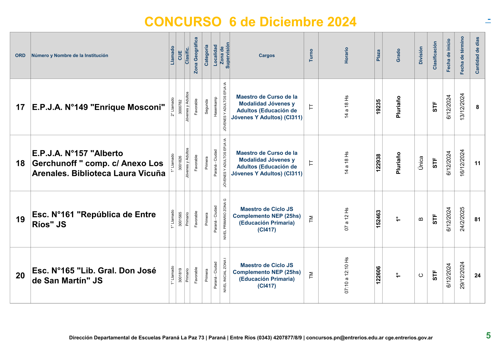 La Dirección Departamental de Escuelas Paraná Convoca a concurso presencial para el día 6 de Diciembre de 2024 a las 9.00 hs, en las instalaciones de la BIBLIOTECA PEDAGÓGICA , sito en calle BELGRANO Nº165 de la Ciudad de Paraná, para la cobertura de Cargos de Ascenso de Nivel Inicial – Primario y Modalidades. En el marco del Acuerdo Paritario /Reglamento de Concursos Resolución Ministerial Nº 783 M.T. (Res. 1000/13) –Circular Nº 1-24 JC procedimientos Listado Complementario – Resolución Nº 0691/21 CGE y sus modificatorias,- De Director, Resolución Nº 1200/22 C.G.E. y modificatorias – De Vicedirector, Resolución Nº 1200/22 C.G.E. y modificatorias – Listado de Suplencias vigentes: Listado de Suplencias de Ascenso Nº 188 y el Listado de Suplencias de Ingreso Nº 188. – Circular-Nº-04-22-CGE-Designaciones-personal-docente-por-Artículo-40 – 3100-24-CGE-Autodesplazamiento – Designaciones por Art80: Resolucion-1882-24-CGE-Ordenamiento-Extraordinario-para-Adjudicacion-de-Cargos-de-Maestro-de-Ciclo-Jornada-Simple-Dpto-Uruguay – 3395-24 CGE Modifica Res. 1882-24 CGE nombramientos de suplencias