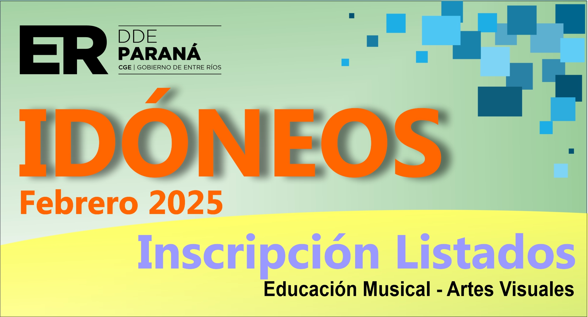 Desde el día miércoles 12 al martes 18 de febrero de 2.025, en el horario de 8:00 a 13:00 hs., se reciben las Inscripciones y los proyectos en 2do. Piso de D.D.E. Paraná, oficina Supervisión Nivel Primario de los aspirantes en carácter de idóneos para cubrir suplencias en los cargos de Maestro de Educación Musical y Artes Visuales para el Nivel Primario.