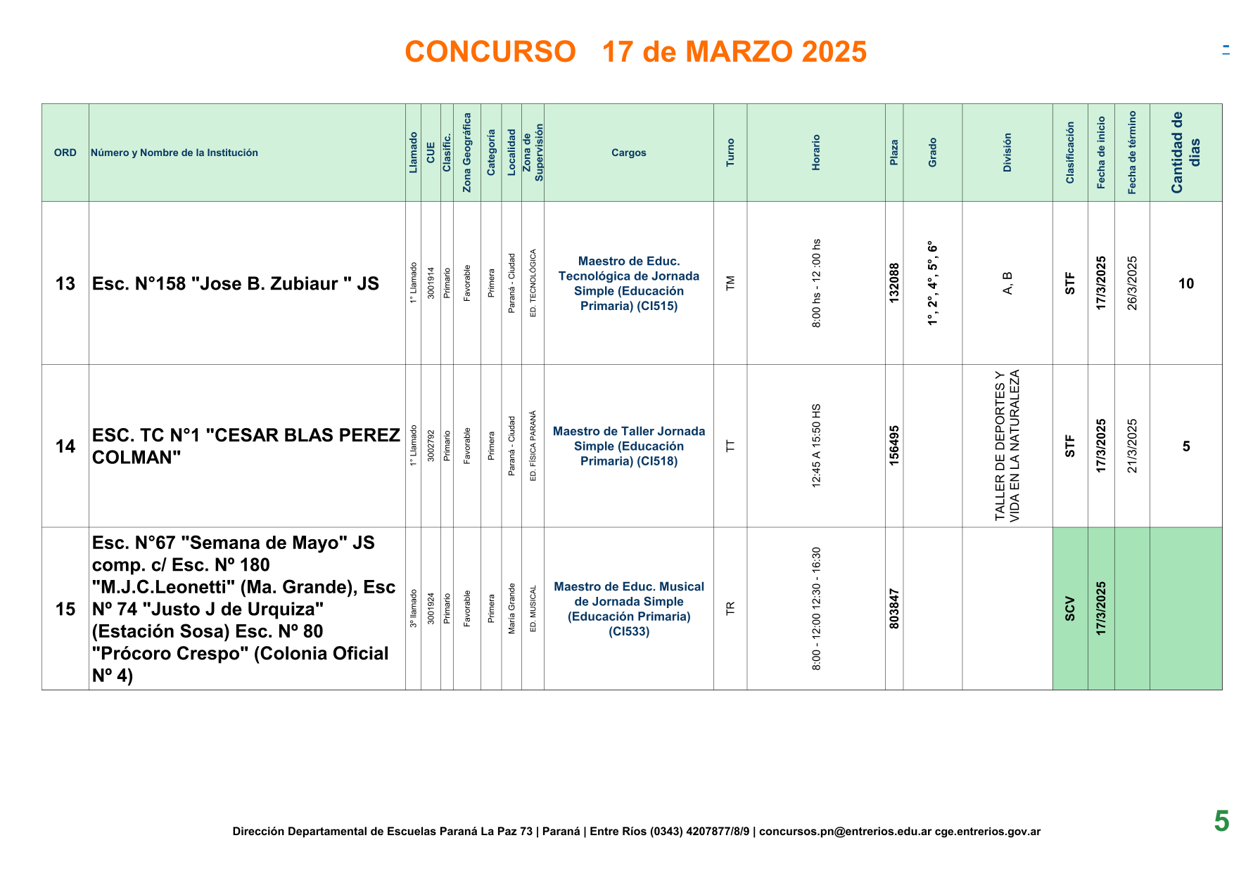 Cargo Nº 14 Esc. N°67 “Semana de Mayo” JS comp. c/ Esc. Nº 180 “M.J.C.Leonetti” (Ma. Grande), Esc Nº 74 “Justo J de Urquiza” (Estación Sosa) Esc. Nº 80 “Prócoro Crespo” (Colonia Oficial Nº 4) CORRESPONDE 1° Llamado y es Abierto 16 U.