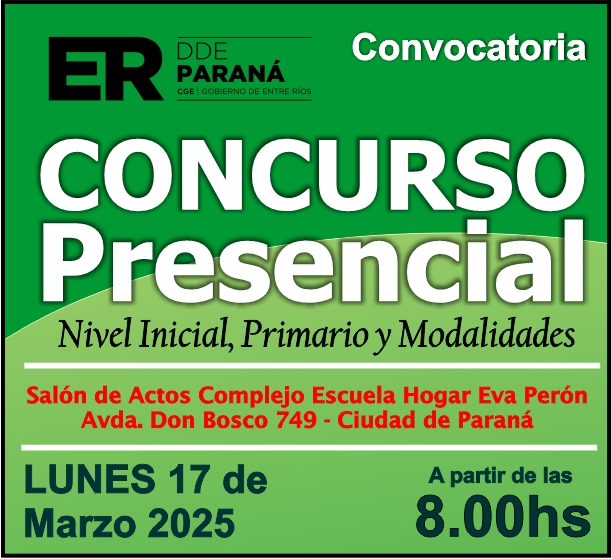 La Dirección Departamental de Escuelas Paraná Convoca a concurso presencial para el día 17 de Marzo 2025 a partir de las 8.00 hs, en las instalaciones del Salón de Actos del Complejo Escuela Hogar Eva Perón, Sito en Avenida Don Bosco 749 – De la Ciudad de Paraná, para la cobertura de Cargos de Ascenso e Ingresao de Nivel Inicial – Primario y Modalidades. En el marco del Acuerdo Paritario /Reglamento de Concursos Resolución Ministerial Nº 783 M.T. (Res. 1000/13) – Resolución Nº 0691/21 CGE y sus modificatorias,- De Director, Resolución Nº 1200/22 C.G.E. y modificatorias – De Vicedirector, Resolución Nº 1200/22 C.G.E. y modificatorias – Listado de Suplencias vigentes: Listado de Suplencias de Ascenso Nº 188 y el Listado de Suplencias de Ingreso Nº 188. Resol. 3100-24-CGE-Autodesplazamiento.-