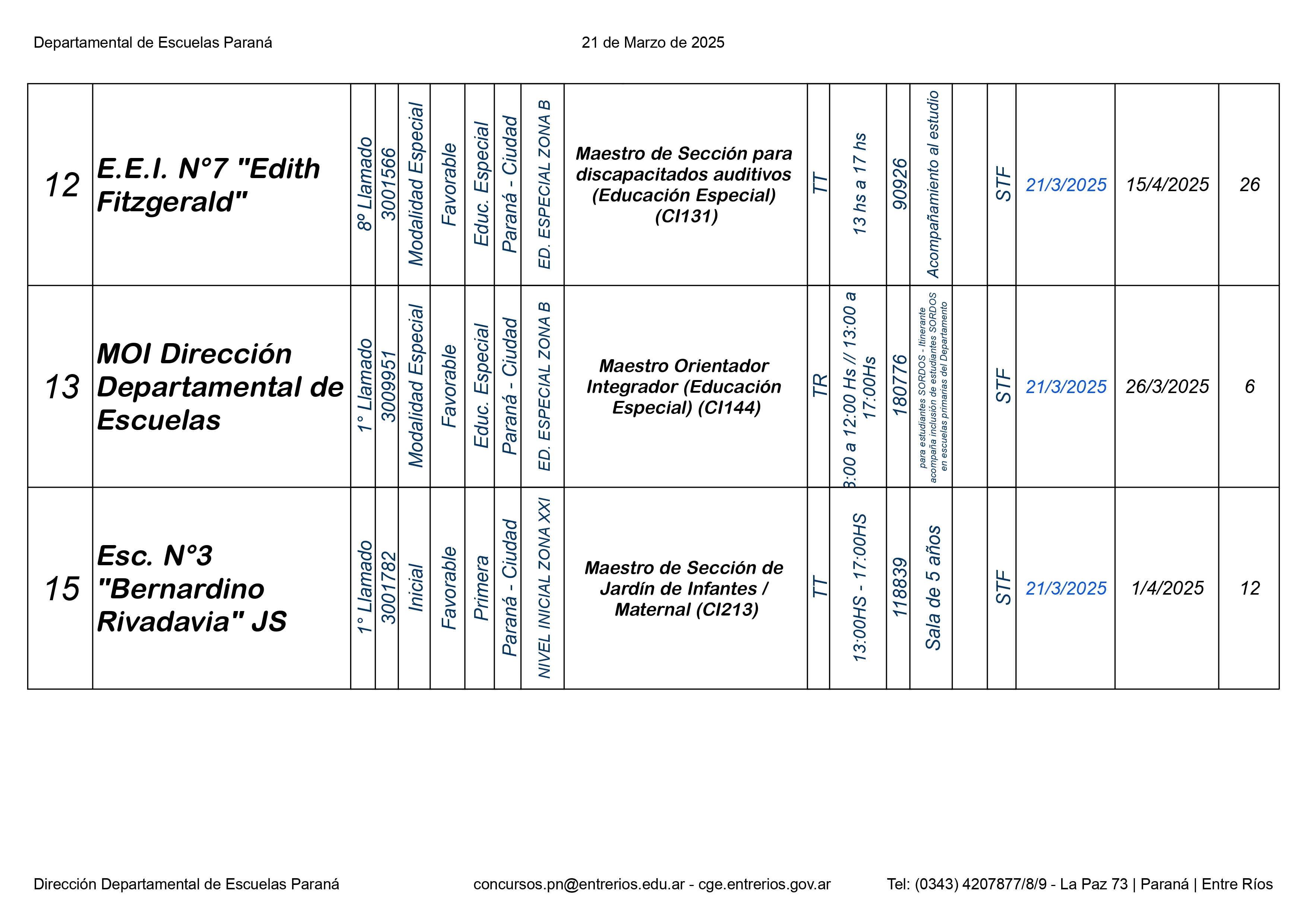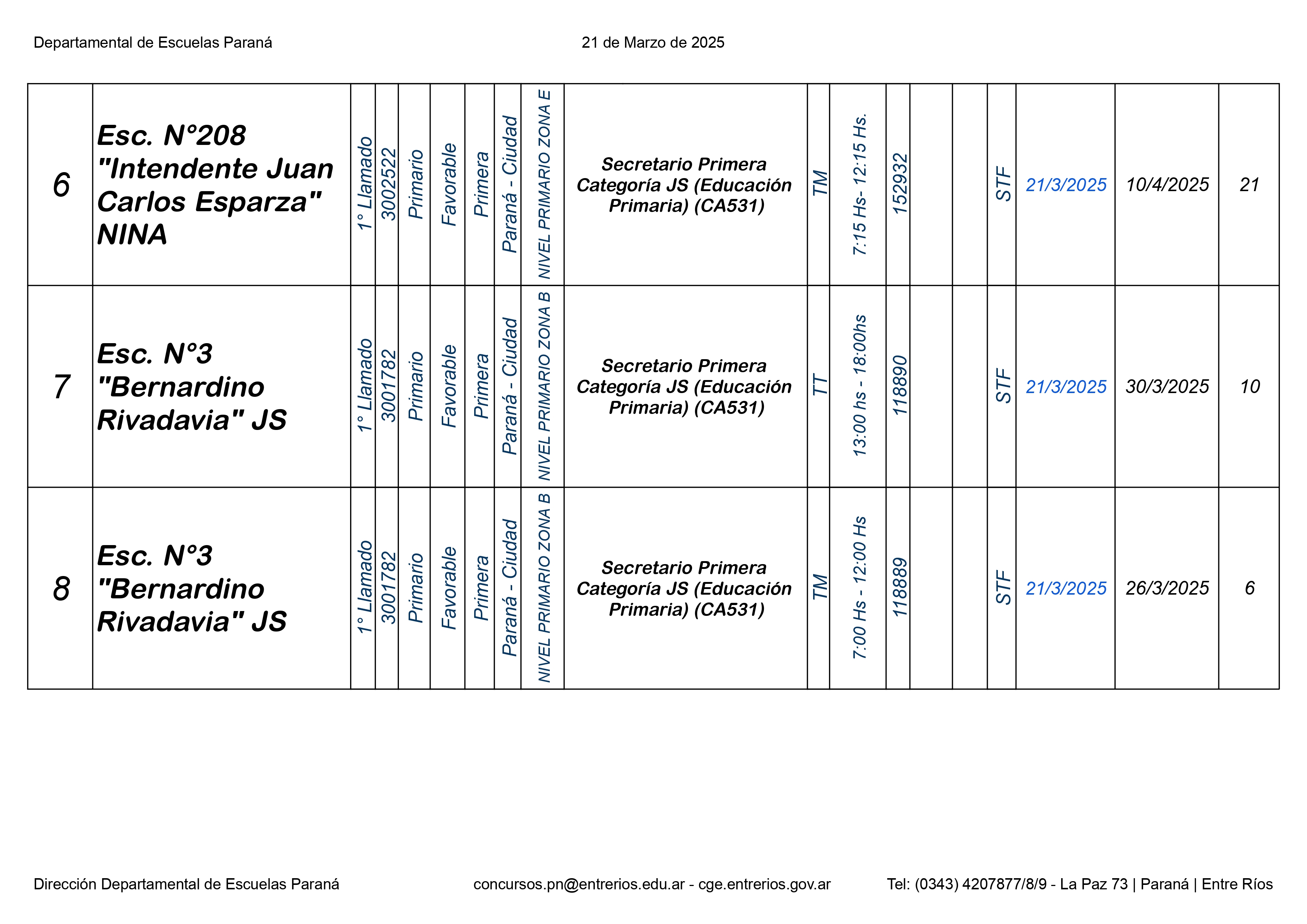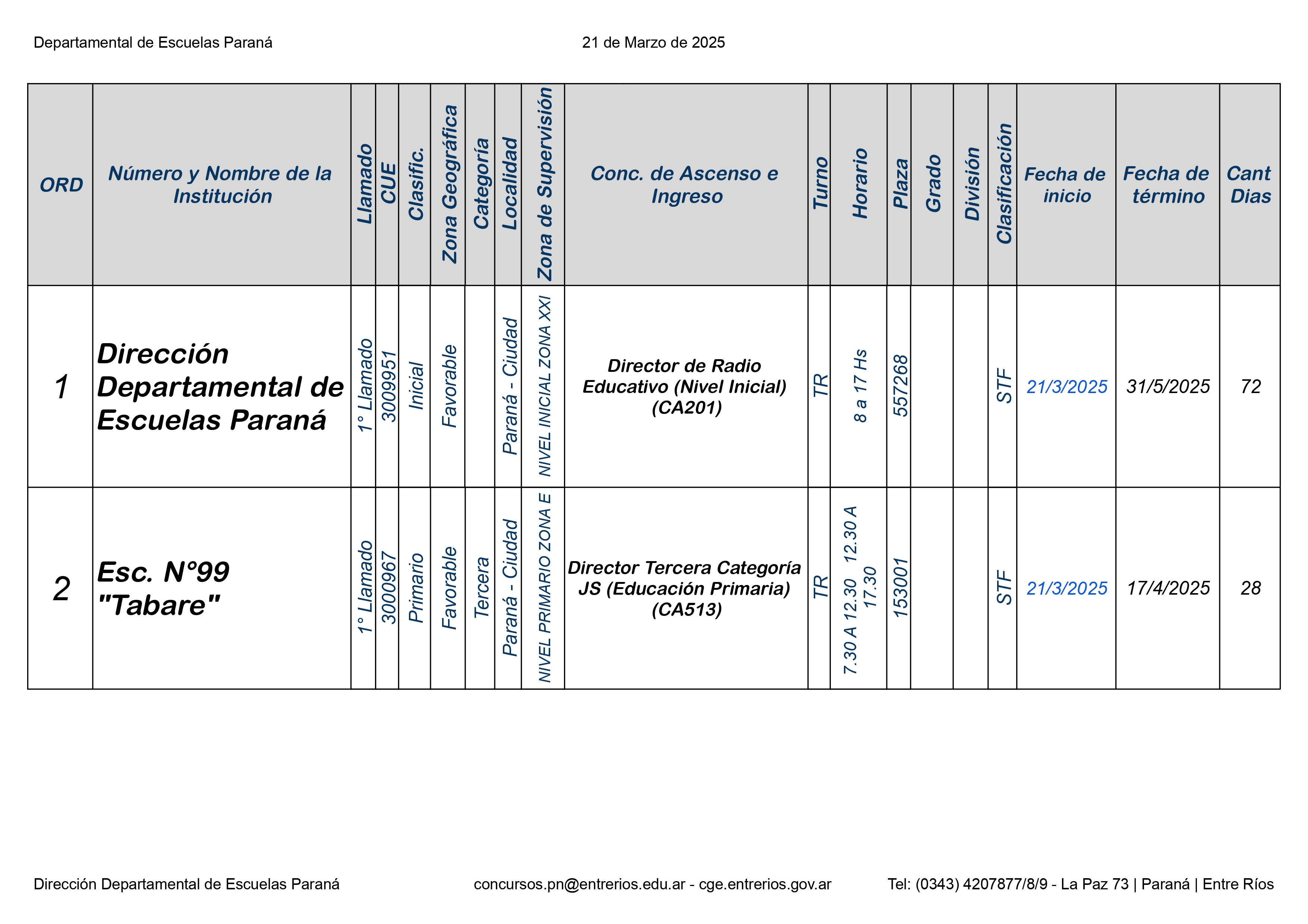 La Dirección Departamental de Escuelas Paraná Convoca a concurso presencial para el día 21 de Marzo 2025 a partir de las 8.00 hs, en las instalaciones Biblióteca Pedagógica, sita en calle Belgrano 165 – De la Ciudad de Paraná, para la cobertura de Cargos de Ascenso e Ingresao de Nivel Inicial – Primario y Modalidades. En el marco del Acuerdo Paritario /Reglamento de Concursos Resolución Ministerial Nº 783 M.T. (Res. 1000/13) – Resolución Nº 0691/21 CGE y sus modificatorias,- De Director, Resolución Nº 1200/22 C.G.E. y modificatorias – De Vicedirector, Resolución Nº 1200/22 C.G.E. y modificatorias – Listado de Suplencias vigentes: Listado de Suplencias de Ascenso Nº 188 y el Listado de Suplencias de Ingreso Nº 188. Resol. 3100-24-CGE-Autodesplazamiento.-