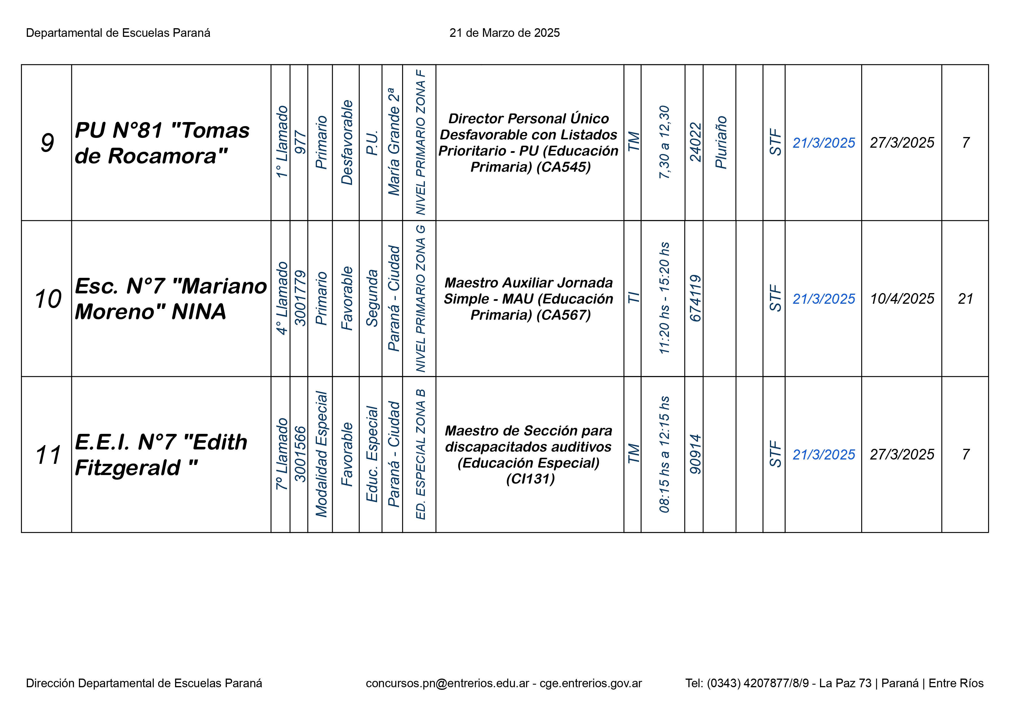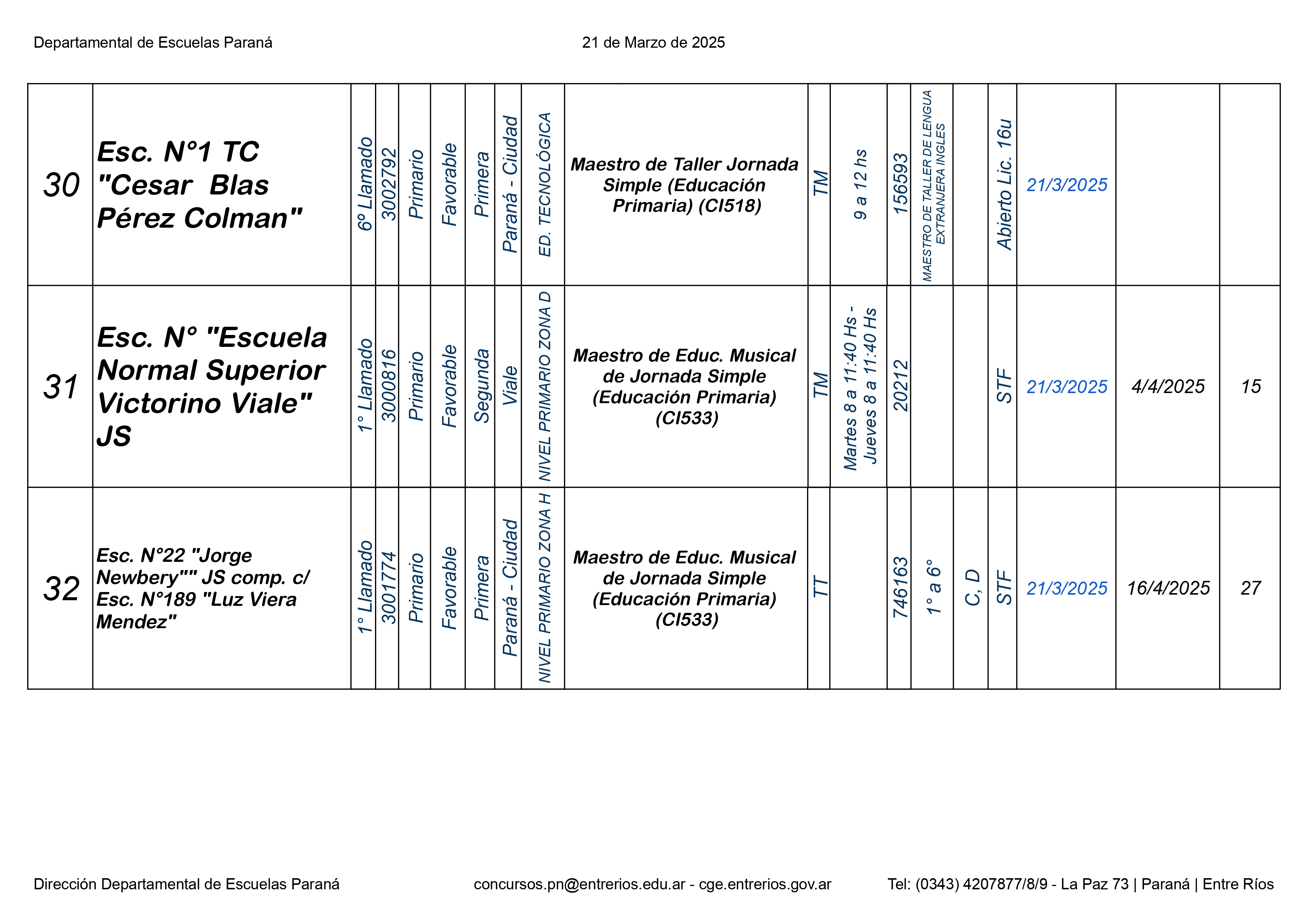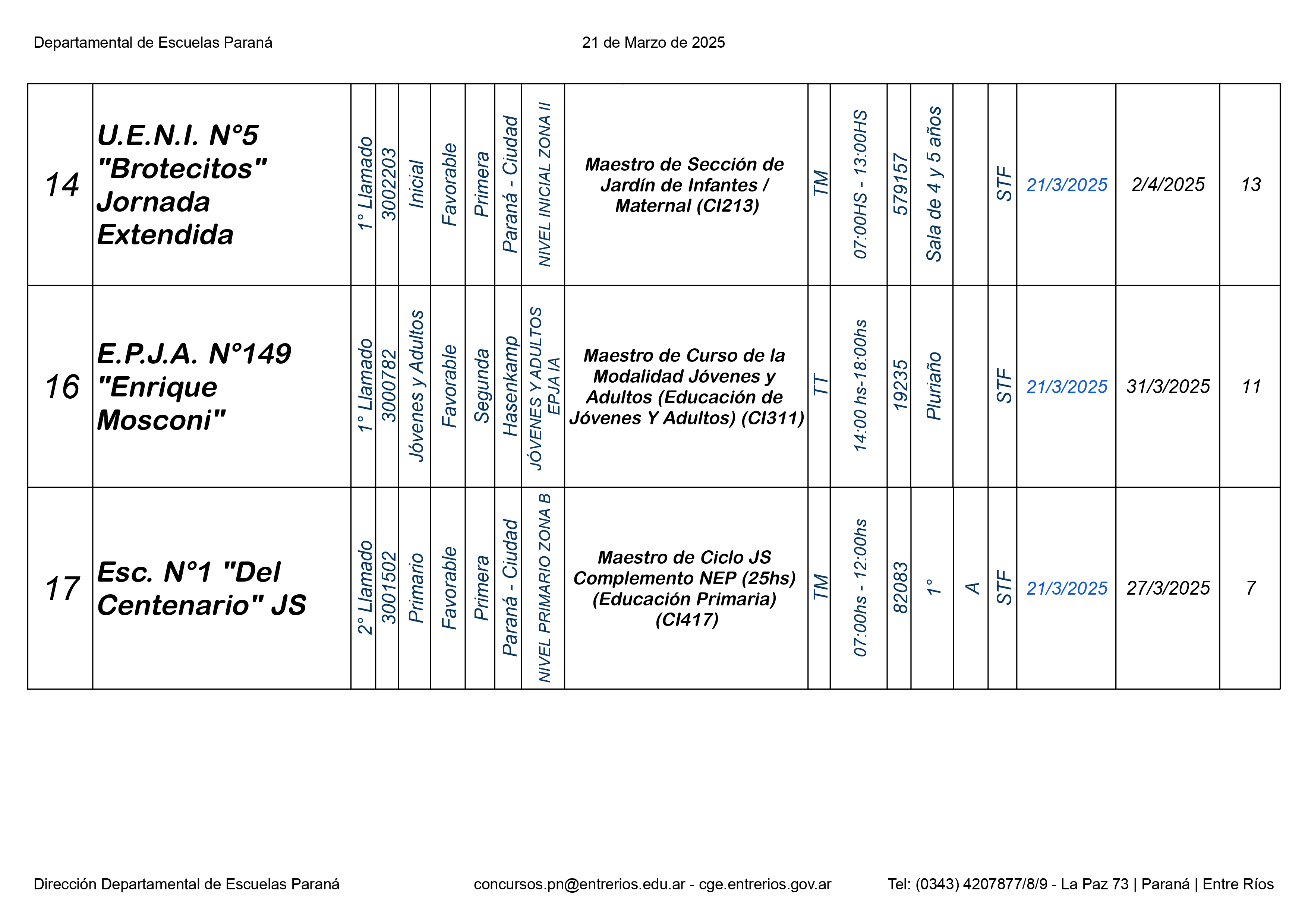 La Dirección Departamental de Escuelas Paraná Convoca a concurso presencial para el día 21 de Marzo 2025 a partir de las 8.00 hs, en las instalaciones Biblióteca Pedagógica, sita en calle Belgrano 165 – De la Ciudad de Paraná, para la cobertura de Cargos de Ascenso e Ingresao de Nivel Inicial – Primario y Modalidades. En el marco del Acuerdo Paritario /Reglamento de Concursos Resolución Ministerial Nº 783 M.T. (Res. 1000/13) – Resolución Nº 0691/21 CGE y sus modificatorias,- De Director, Resolución Nº 1200/22 C.G.E. y modificatorias – De Vicedirector, Resolución Nº 1200/22 C.G.E. y modificatorias – Listado de Suplencias vigentes: Listado de Suplencias de Ascenso Nº 188 y el Listado de Suplencias de Ingreso Nº 188. Resol. 3100-24-CGE-Autodesplazamiento.-