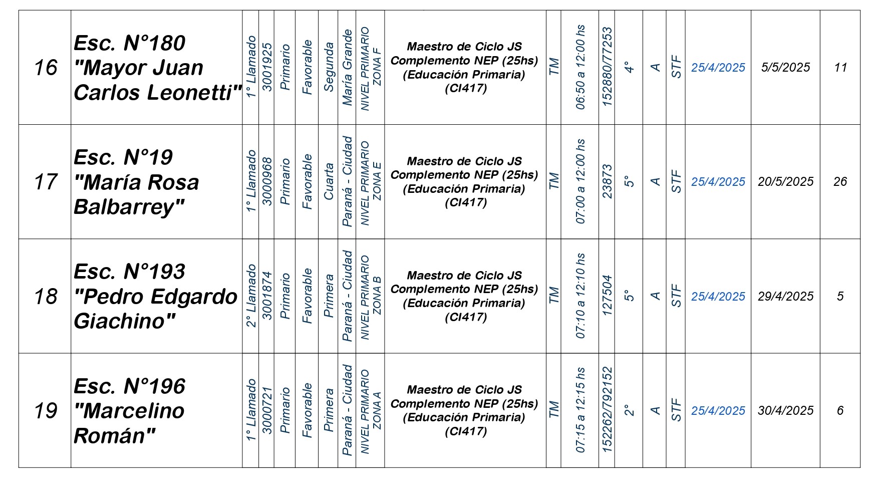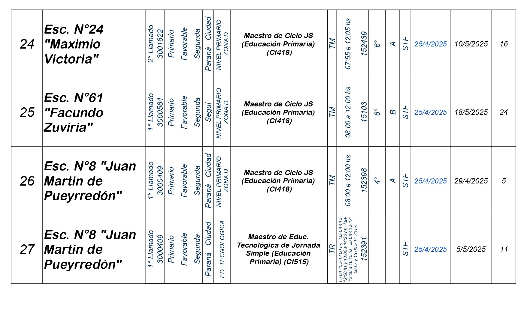 La Dirección Departamental de Escuelas Paraná Convoca a concurso presencial para el día VIERNES 25 de Abril de 2025 a partir de las 08:00 hs, en las instalaciones de la Biblióteca Pedagógica, sita en calle Belgrano 165 – De la Ciudad de Paraná, para la cobertura de Cargos de Ascenso e Ingresao de Nivel Inicial – Primario y Modalidades. En el marco del Acuerdo Paritario /Reglamento de Concursos Resolución Ministerial Nº 783 M.T. (Res. 1000/13) – Resolución Nº 0691/21 CGE y sus modificatorias,- De Director, Resolución Nº 1200/22 C.G.E. y modificatorias – De Vicedirector, Resolución Nº 1200/22 C.G.E. y modificatorias – Listado de Suplencias vigentes: Listado de Suplencias de Ascenso Nº 188 y el Listado de Suplencias de Ingreso Nº 188. Resol. 3100-24-CGE-Autodesplazamiento.-