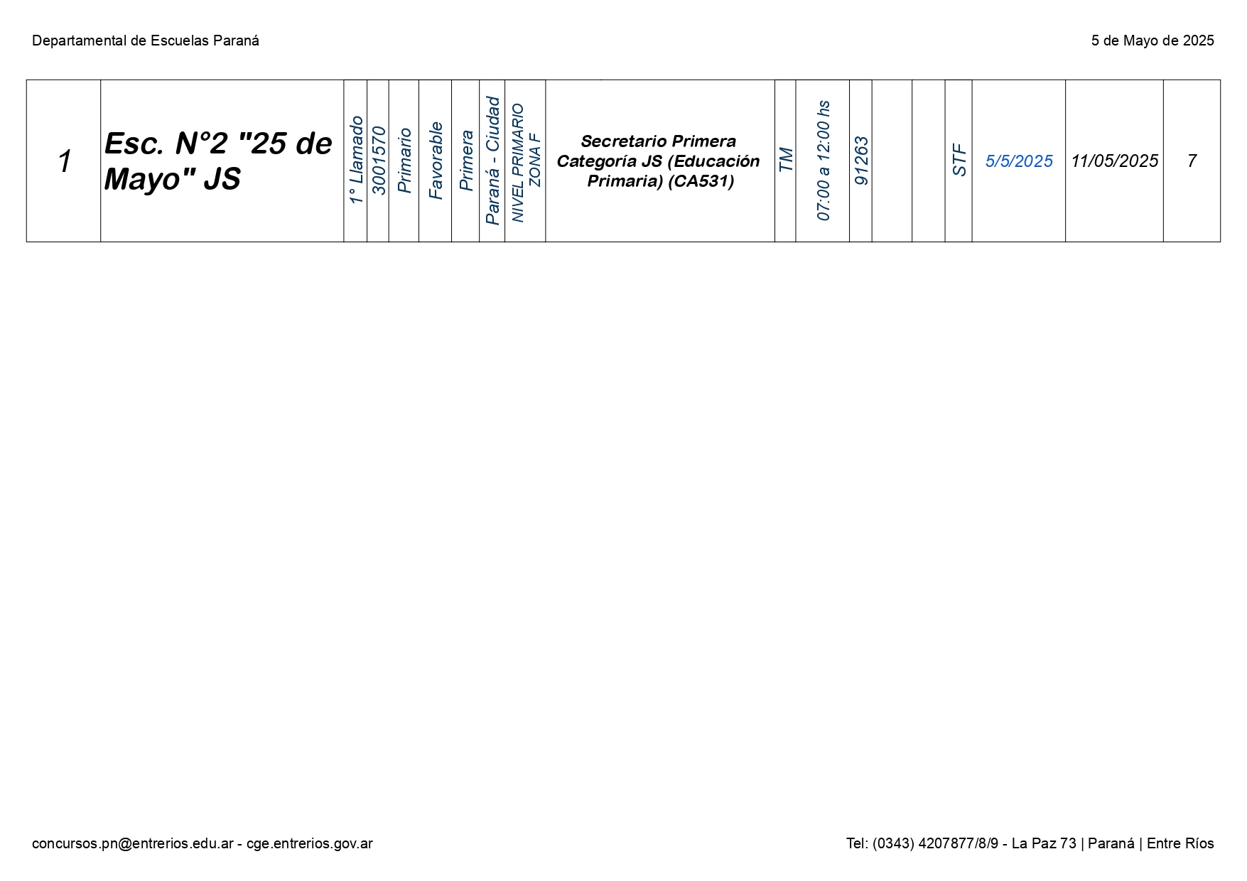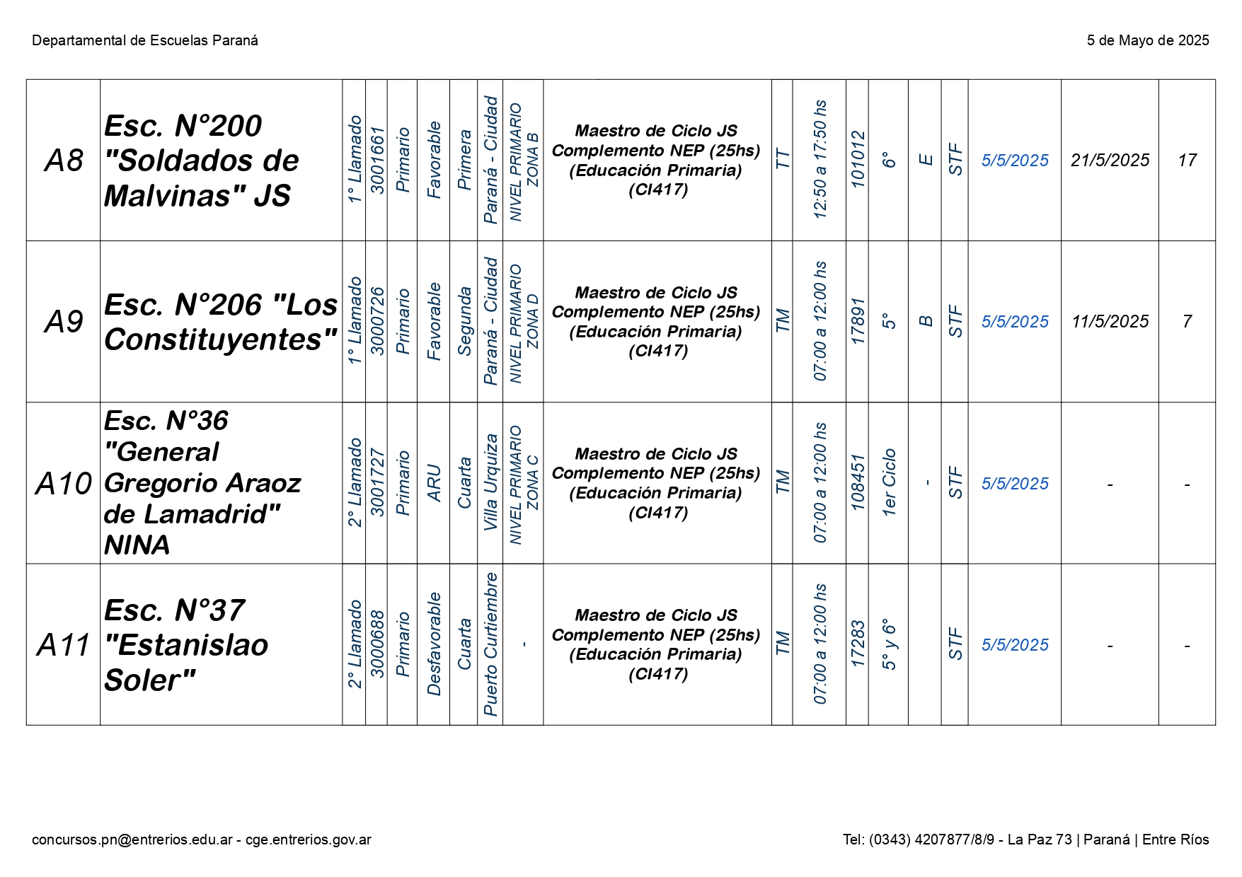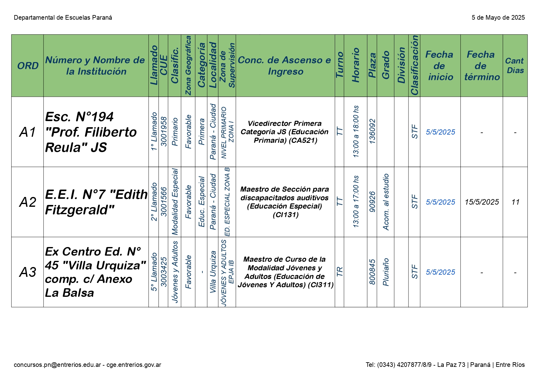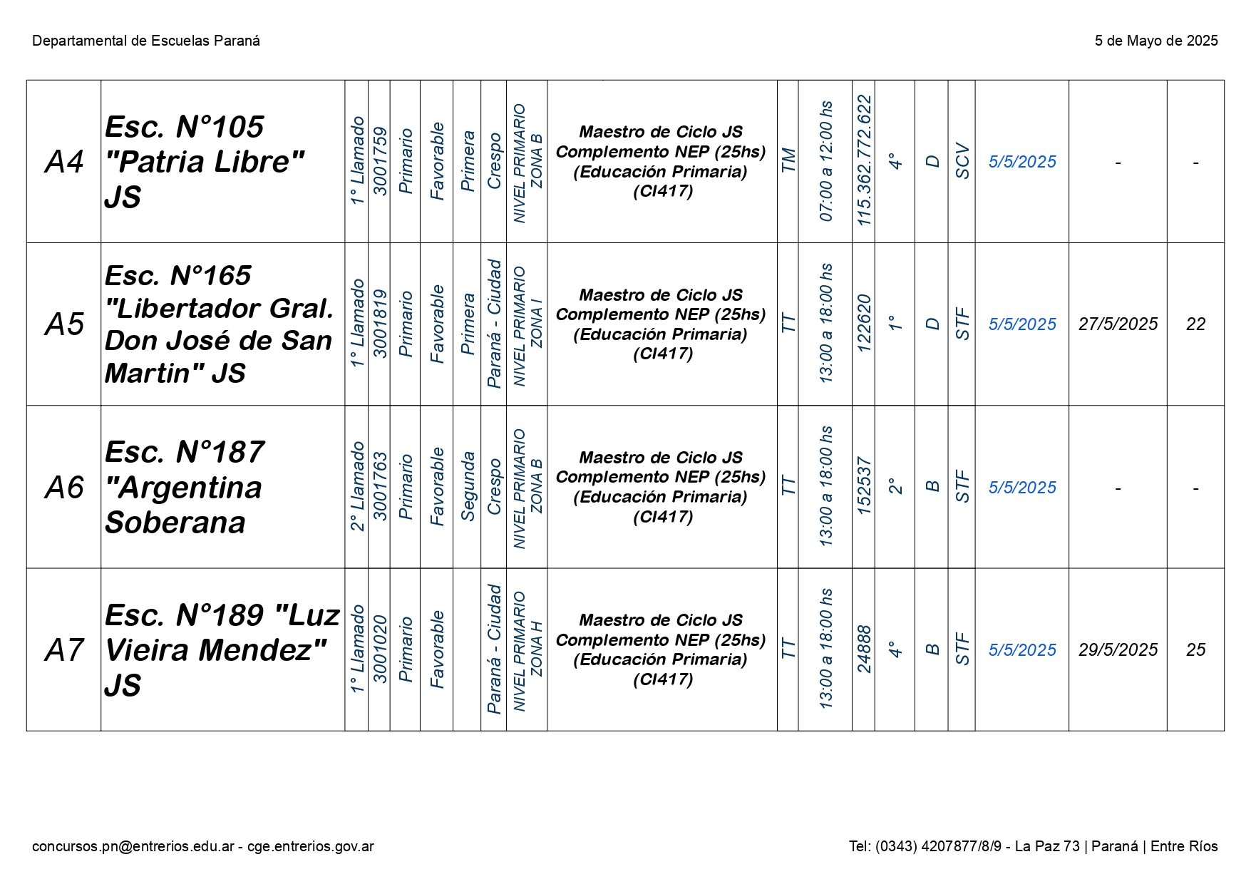 La Dirección Departamental de Escuelas Paraná Convoca a concurso presencial para el día LUNES 05 de MAYO de 2025 a partir de las 08:00 hs, en las instalaciones de la Biblióteca Pedagógica, sita en calle Belgrano 165 – De la Ciudad de Paraná, para la cobertura de Cargos de Ascenso e Ingresao de Nivel Inicial – Primario y Modalidades. En el marco del Acuerdo Paritario /Reglamento de Concursos Resolución Ministerial Nº 783 M.T. (Res. 1000/13) – Resolución Nº 0691/21 CGE y sus modificatorias,- De Director, Resolución Nº 1200/22 C.G.E. y modificatorias – De Vicedirector, Resolución Nº 1200/22 C.G.E. y modificatorias – Listado de Suplencias vigentes: Listado de Suplencias de Ascenso Nº 188 y el Listado de Suplencias de Ingreso Nº 188. Resol. 3100-24-CGE-Autodesplazamiento.-