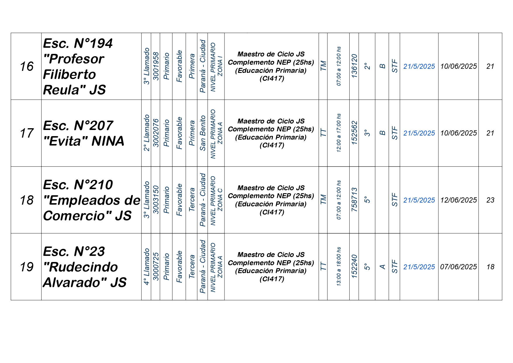 La Dirección Departamental de Escuelas Paraná Convoca a concurso presencial para el día MIERCOLES 21 de MAYO de 2025 a partir de las 08:00 hs, en las instalaciones de la Biblióteca Pedagógica, sita en calle Belgrano 165 – De la Ciudad de Paraná, para la cobertura de Cargos de Ascenso e Ingresao de Nivel Inicial – Primario y Modalidades. En el marco del Acuerdo Paritario /Reglamento de Concursos Resolución Ministerial Nº 783 M.T. (Res. 1000/13) – Resolución Nº 0691/21 CGE y sus modificatorias,- De Director, Resolución Nº 1200/22 C.G.E. y modificatorias – De Vicedirector, Resolución Nº 1200/22 C.G.E. y modificatorias – Listado de Suplencias vigentes: Listado de Suplencias de Ascenso Nº 188 y el Listado de Suplencias de Ingreso Nº 188. Resol. 3100-24-CGE-Autodesplazamiento.-