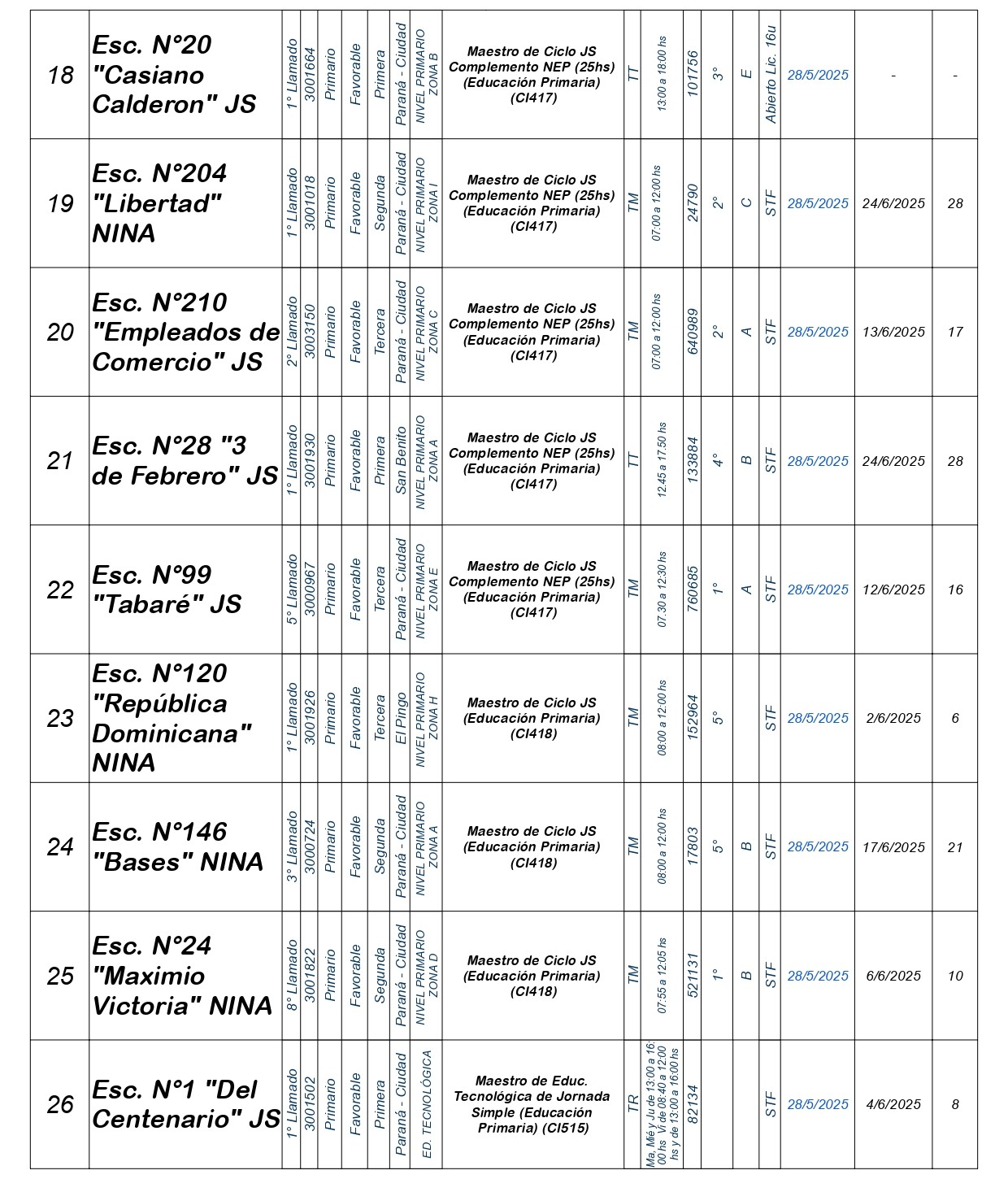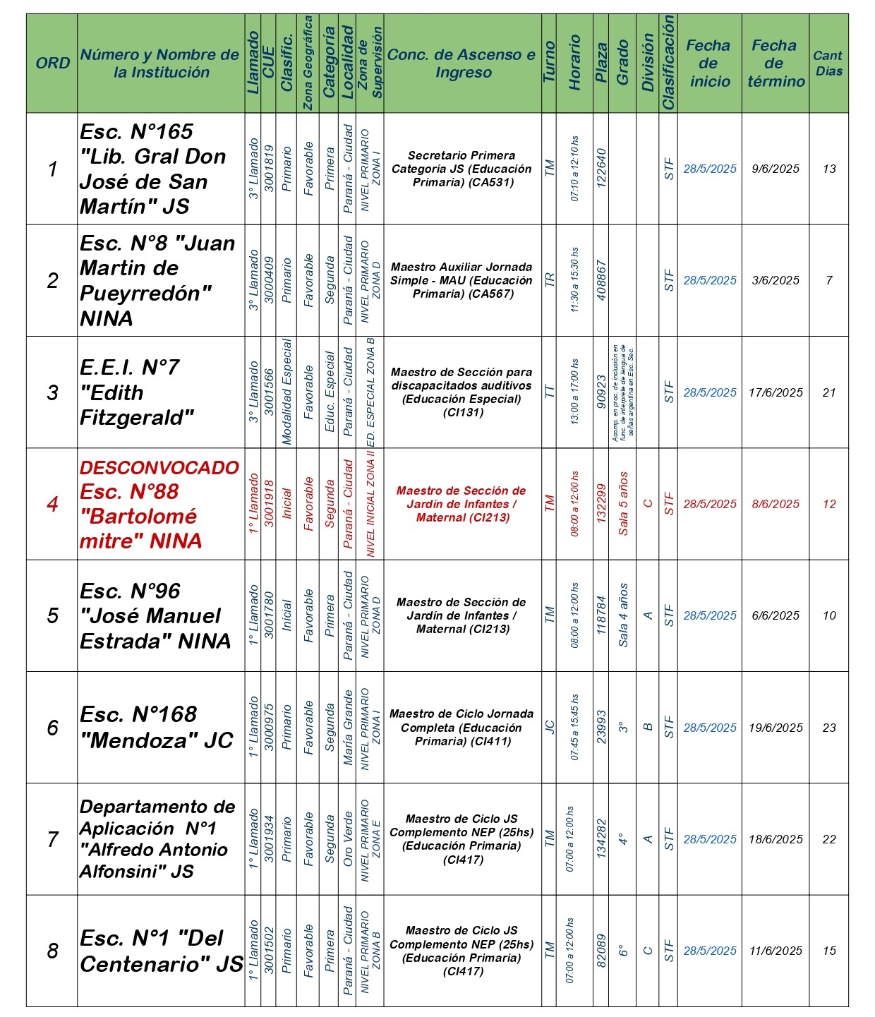 La Dirección Departamental de Escuelas Paraná Convoca a concurso presencial para el día MIERCOLES 28 de MAYO de 2025 a partir de las 08:00 hs, en las instalaciones de la Biblióteca Pedagógica, sita en calle Belgrano 165 – De la Ciudad de Paraná, para la cobertura de Cargos de Ascenso e Ingresao de Nivel Inicial – Primario y Modalidades. En el marco del Acuerdo Paritario /Reglamento de Concursos Resolución Ministerial Nº 783 M.T. (Res. 1000/13) – Resolución Nº 0691/21 CGE y sus modificatorias,- De Director, Resolución Nº 1200/22 C.G.E. y modificatorias – De Vicedirector, Resolución Nº 1200/22 C.G.E. y modificatorias – Listado de Suplencias vigentes: Listado de Suplencias de Ascenso Nº 188 y el Listado de Suplencias de Ingreso Nº 188. Resol. 3100-24-CGE-Autodesplazamiento.-