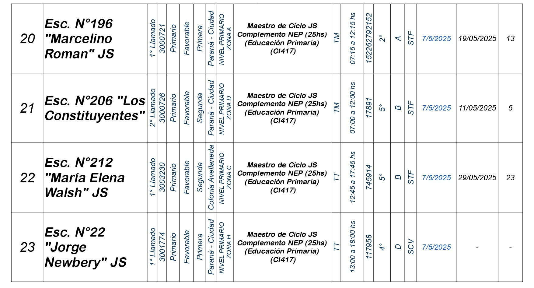 La Dirección Departamental de Escuelas Paraná Convoca a concurso presencial para el día MIERCOLES 7 de MAYO de 2025 a partir de las 08:00 hs, en las instalaciones de la Biblióteca Pedagógica, sita en calle Belgrano 165 – De la Ciudad de Paraná, para la cobertura de Cargos de Ascenso e Ingresao de Nivel Inicial – Primario y Modalidades. En el marco del Acuerdo Paritario /Reglamento de Concursos Resolución Ministerial Nº 783 M.T. (Res. 1000/13) – Resolución Nº 0691/21 CGE y sus modificatorias,- De Director, Resolución Nº 1200/22 C.G.E. y modificatorias – De Vicedirector, Resolución Nº 1200/22 C.G.E. y modificatorias – Listado de Suplencias vigentes: Listado de Suplencias de Ascenso Nº 188 y el Listado de Suplencias de Ingreso Nº 188. Resol. 3100-24-CGE-Autodesplazamiento.-