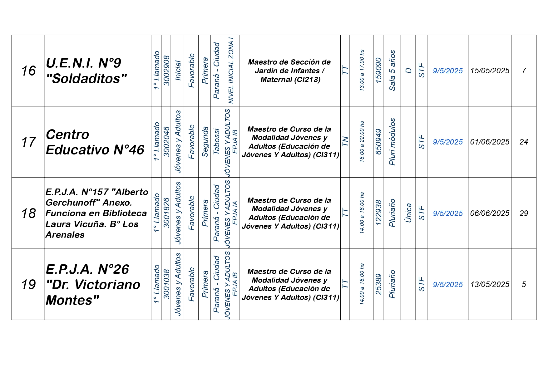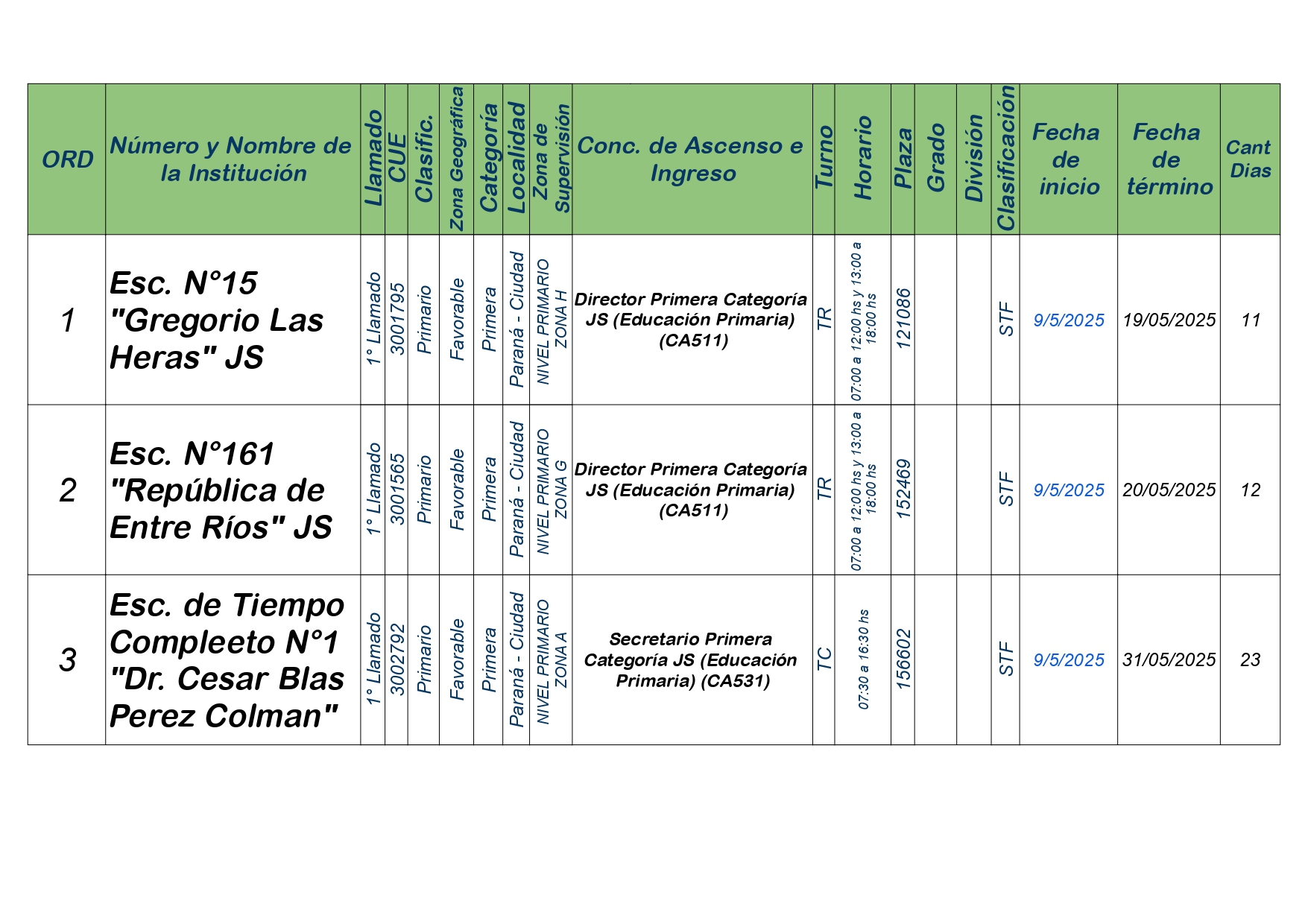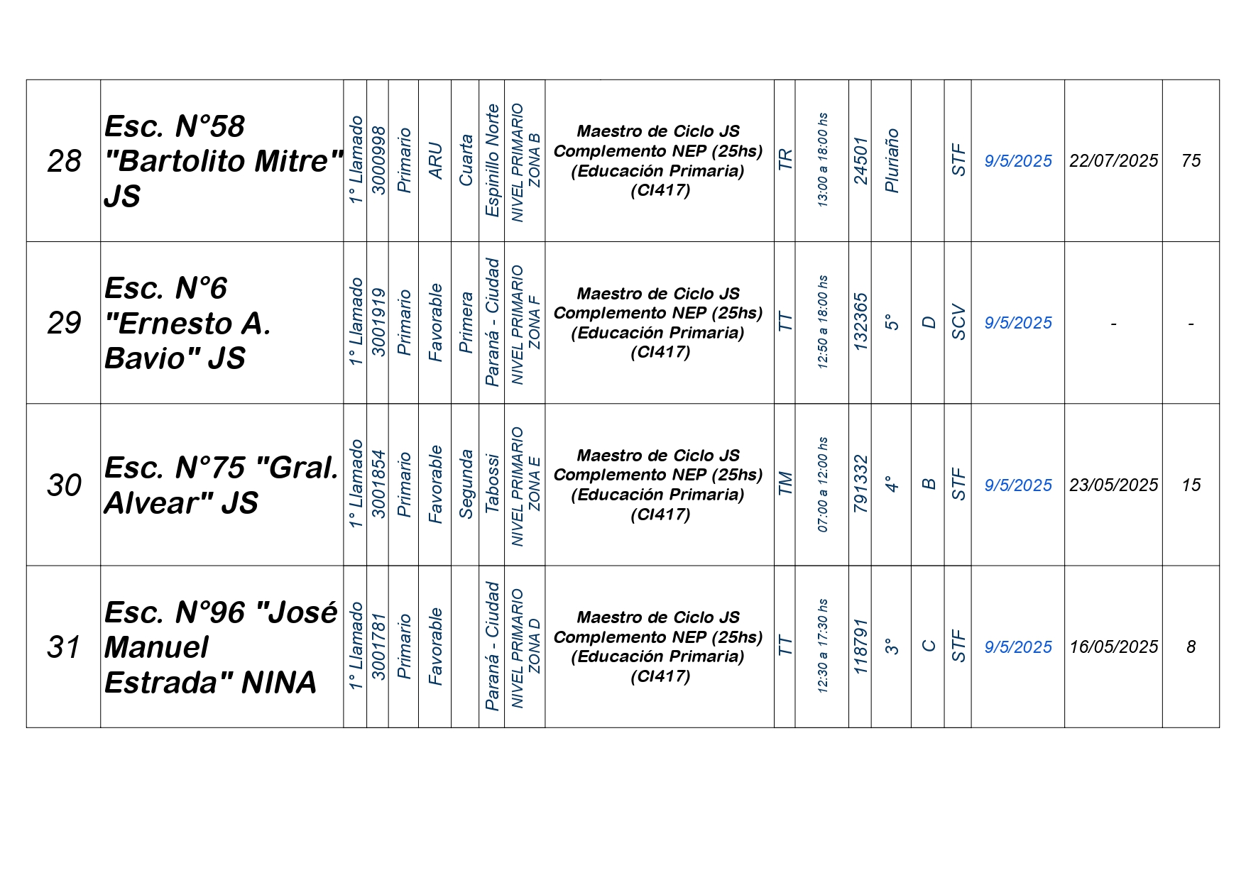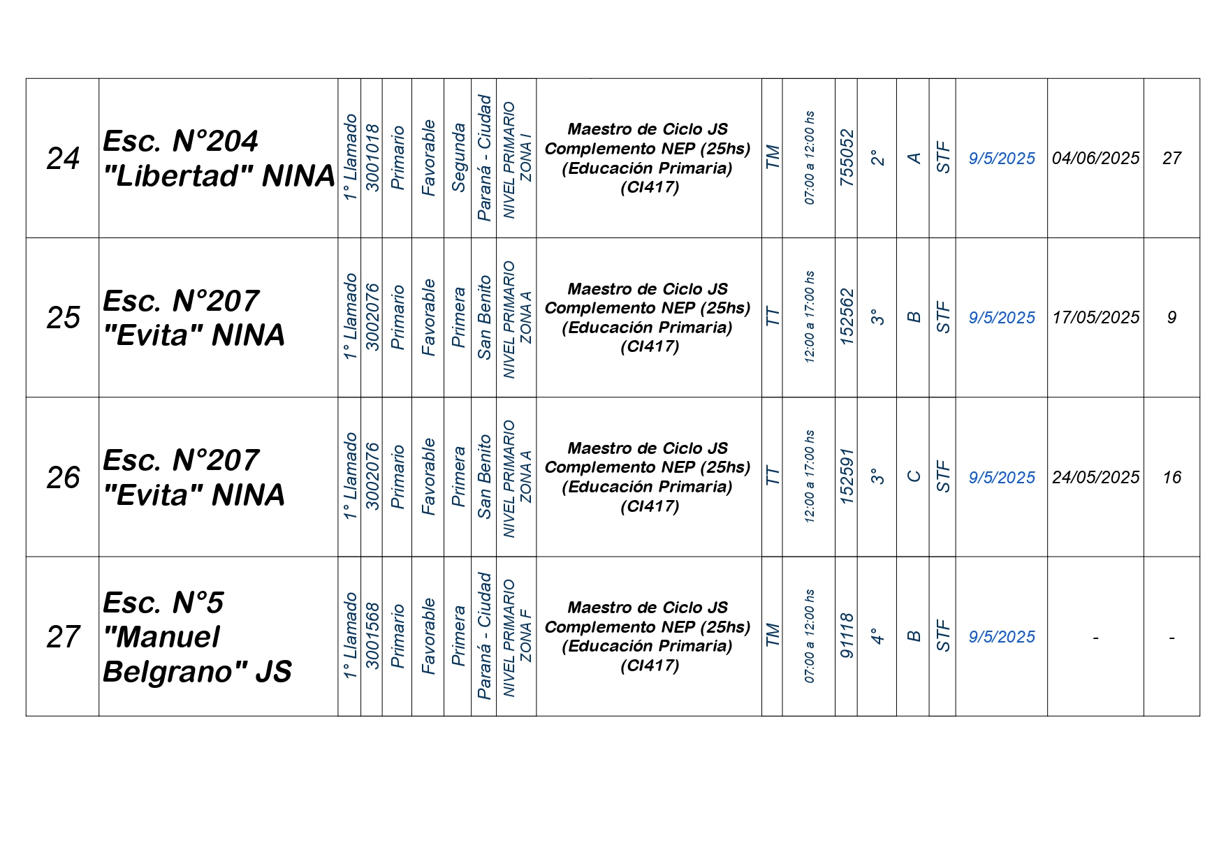 La Dirección Departamental de Escuelas Paraná Convoca a concurso presencial para el día VIERNES 9 de MAYO de 2025 a partir de las 08:00 hs, en las instalaciones de la Biblióteca Pedagógica, sita en calle Belgrano 165 – De la Ciudad de Paraná, para la cobertura de Cargos de Ascenso e Ingresao de Nivel Inicial – Primario y Modalidades. En el marco del Acuerdo Paritario /Reglamento de Concursos Resolución Ministerial Nº 783 M.T. (Res. 1000/13) – Resolución Nº 0691/21 CGE y sus modificatorias,- De Director, Resolución Nº 1200/22 C.G.E. y modificatorias – De Vicedirector, Resolución Nº 1200/22 C.G.E. y modificatorias – Listado de Suplencias vigentes: Listado de Suplencias de Ascenso Nº 188 y el Listado de Suplencias de Ingreso Nº 188. Resol. 3100-24-CGE-Autodesplazamiento.-