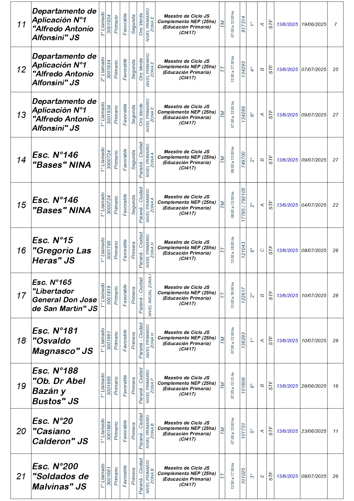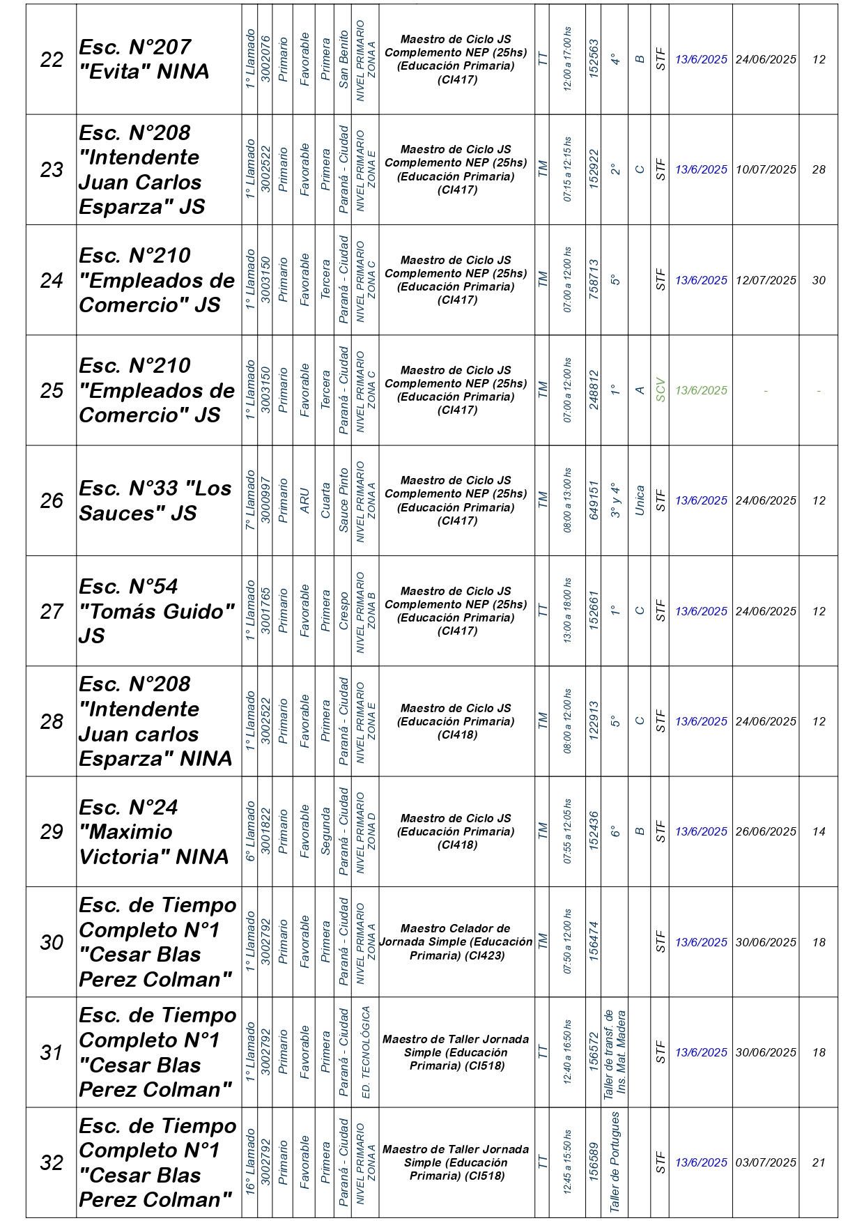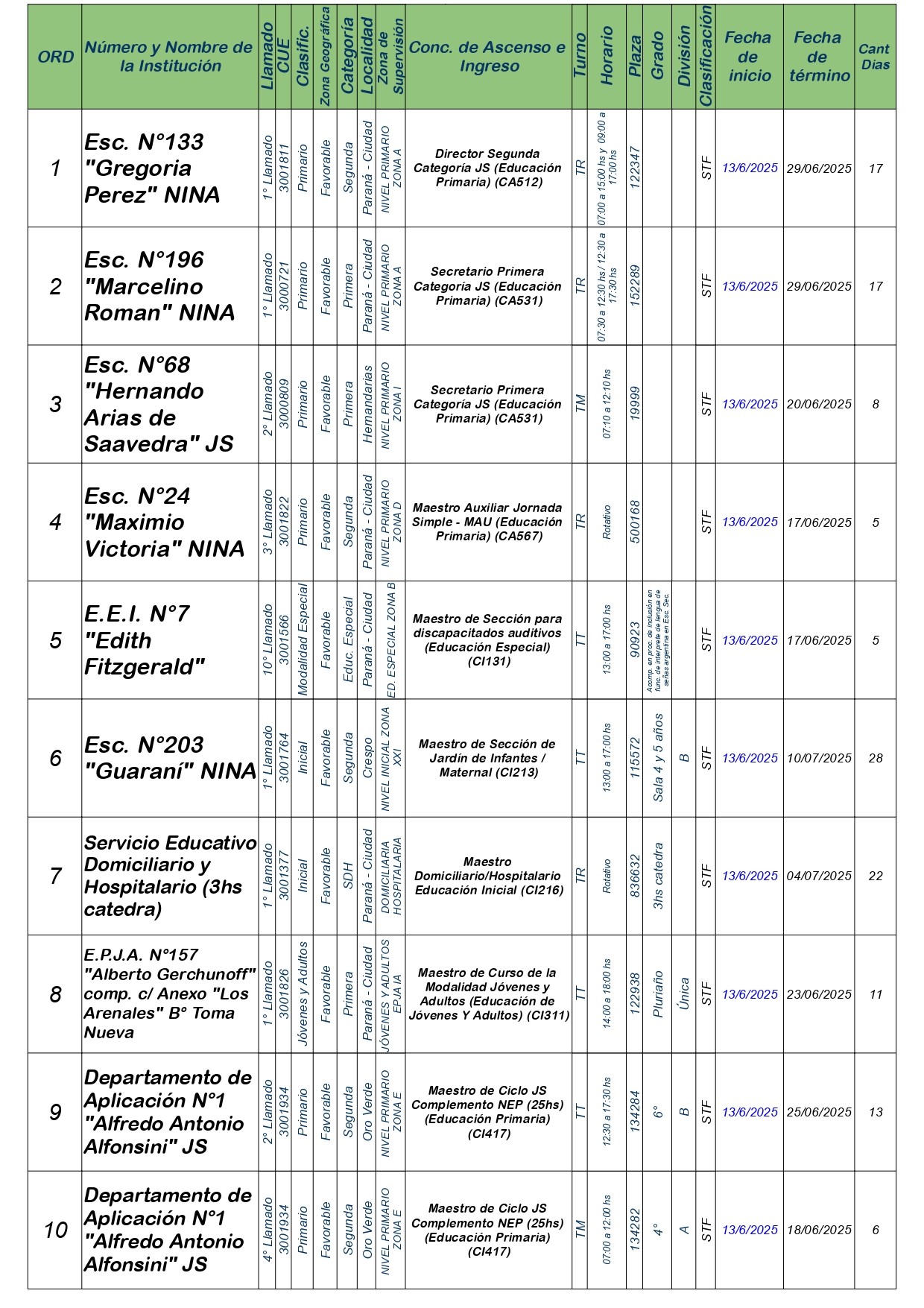 La Dirección Departamental de Escuelas Paraná Convoca a concurso presencial para el día VIERNES 13 de JUNIO de 2025 a partir de las 08:00 hs, en las instalaciones de la Biblióteca Pedagógica, sita en calle Belgrano 165 – De la Ciudad de Paraná, para la cobertura de Cargos de Ascenso e Ingresao de Nivel Inicial – Primario y Modalidades. En el marco del Acuerdo Paritario /Reglamento de Concursos Resolución Ministerial Nº 783 M.T. (Res. 1000/13) – Resolución Nº 0691/21 CGE y sus modificatorias,- De Director, Resolución Nº 1200/22 C.G.E. y modificatorias – De Vicedirector, Resolución Nº 1200/22 C.G.E. y modificatorias – Listado de Suplencias vigentes: Listado de Suplencias de Ascenso Nº 188 y el Listado de Suplencias de Ingreso Nº 188. Resol. 3100-24-CGE-Autodesplazamiento.-