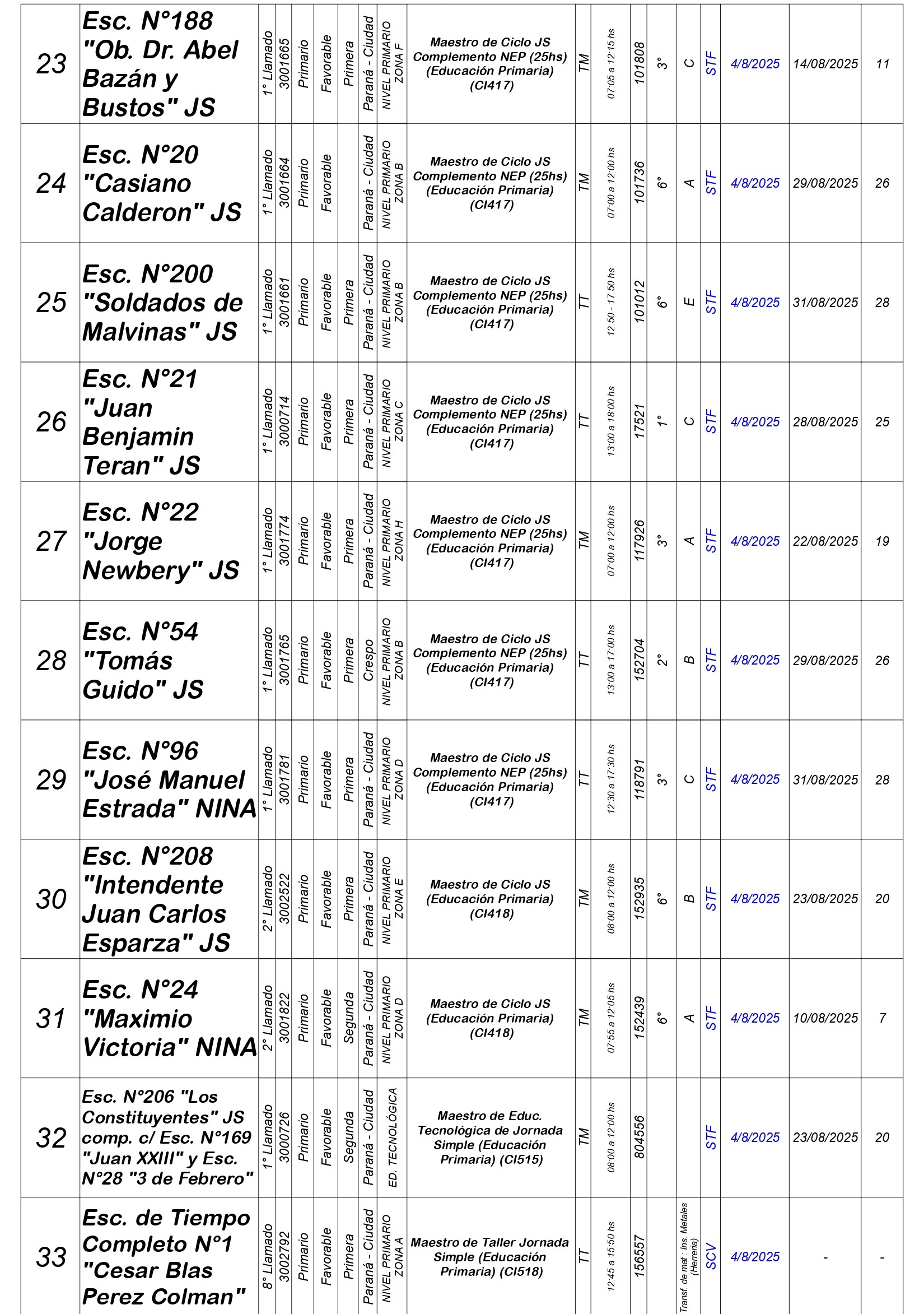 La Dirección Departamental de Escuelas Paraná Convoca a concurso presencial para el día LUNES 4 de AGOSTO de 2025 a partir de las 08:00 hs, en las instalaciones de la Biblióteca Pedagógica, sita en calle Belgrano 165 – De la Ciudad de Paraná, para la cobertura de Cargos de Ascenso e Ingresao de Nivel Inicial – Primario y Modalidades. En el marco del Acuerdo Paritario /Reglamento de Concursos Resolución Ministerial Nº 783 M.T. (Res. 1000/13) – Resolución Nº 0691/21 CGE y sus modificatorias,- De Director, Resolución Nº 1200/22 C.G.E. y modificatorias – De Vicedirector, Resolución Nº 1200/22 C.G.E. y modificatorias – Listado de Suplencias vigentes: Listado de Suplencias de Ascenso Nº 188 y el Listado de Suplencias de Ingreso Nº 188. Resol. 3100-24-CGE-Autodesplazamiento.-