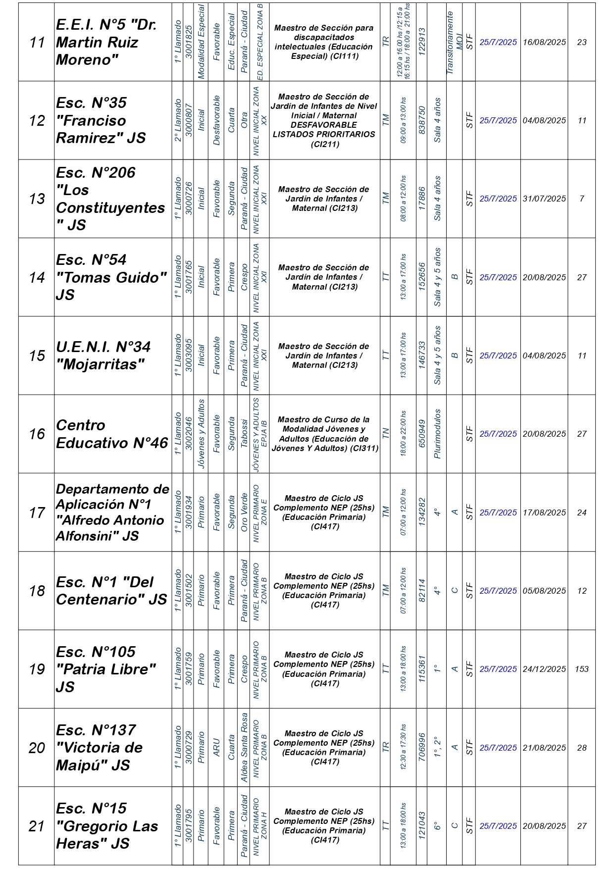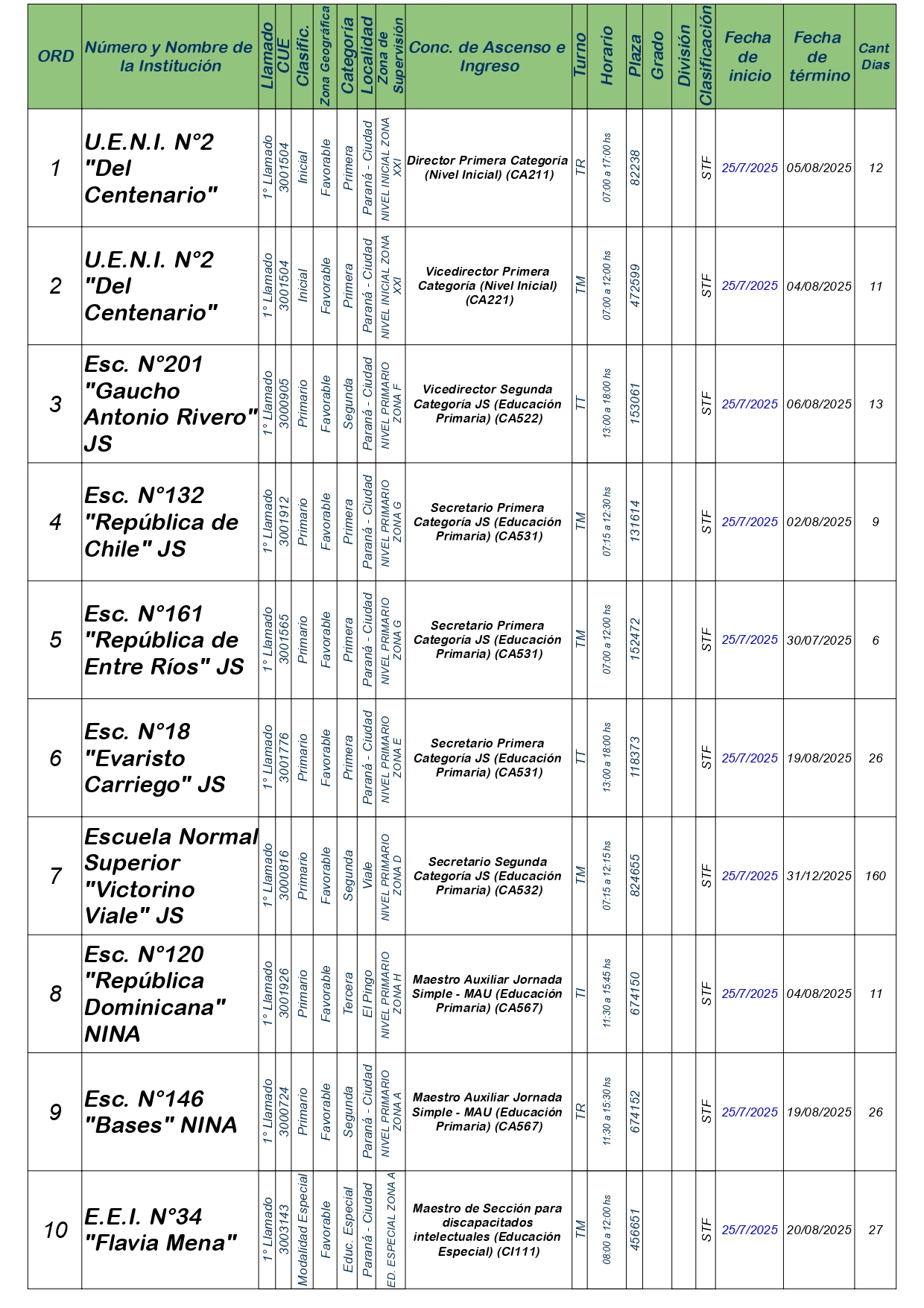 La Dirección Departamental de Escuelas Paraná Convoca a concurso presencial para el día VIERNES 25 de JULIO de 2025 a partir de las 08:00 hs, en las instalaciones de la Biblióteca Pedagógica, sita en calle Belgrano 165 – De la Ciudad de Paraná, para la cobertura de Cargos de Ascenso e Ingresao de Nivel Inicial – Primario y Modalidades. En el marco del Acuerdo Paritario /Reglamento de Concursos Resolución Ministerial Nº 783 M.T. (Res. 1000/13) – Resolución Nº 0691/21 CGE y sus modificatorias,- De Director, Resolución Nº 1200/22 C.G.E. y modificatorias – De Vicedirector, Resolución Nº 1200/22 C.G.E. y modificatorias – Listado de Suplencias vigentes: Listado de Suplencias de Ascenso Nº 188 y el Listado de Suplencias de Ingreso Nº 188. Resol. 3100-24-CGE-Autodesplazamiento.-