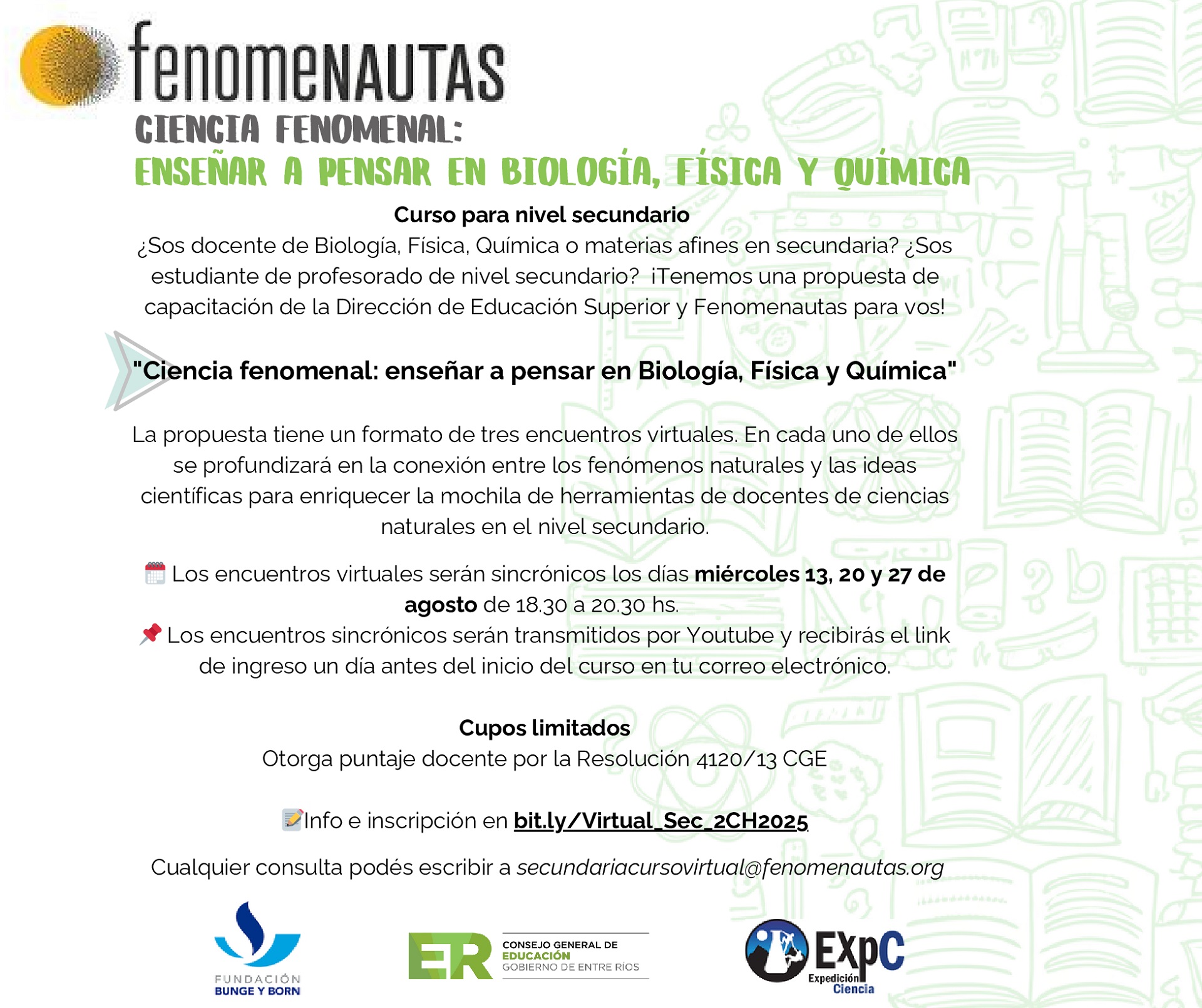 Se encuentra abierta la inscripción hasta el jueves 31 de julio para la capacitación docente continua Enseñar Ciencias Naturales en el Nivel Primario: de los fenómenos a las ideas y Ciencia Fenomenal en el Nivel Secundario: enseñar a pensar en Biología, Física y Química.