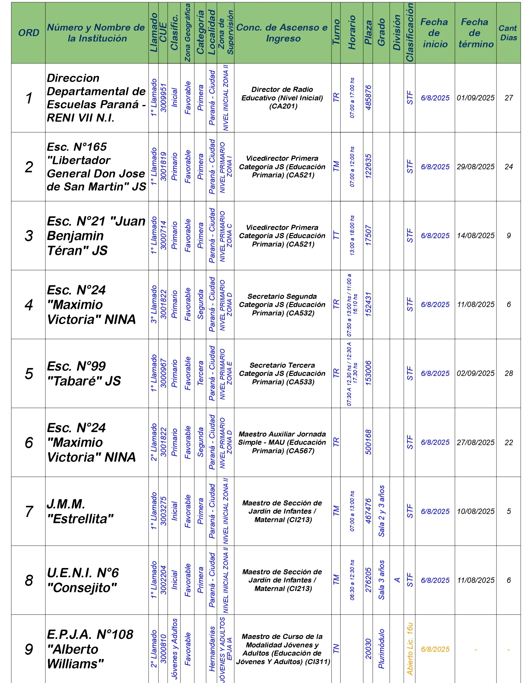 La Dirección Departamental de Escuelas Paraná Convoca a concurso presencial para el día MIERCOLES 6 de AGOSTO de 2025 a partir de las 08:00 hs, en las instalaciones de la Biblióteca Pedagógica, sita en calle Belgrano 165 – De la Ciudad de Paraná, para la cobertura de Cargos de Ascenso e Ingresao de Nivel Inicial – Primario y Modalidades. En el marco del Acuerdo Paritario /Reglamento de Concursos Resolución Ministerial Nº 783 M.T. (Res. 1000/13) – Resolución Nº 0691/21 CGE y sus modificatorias,- De Director, Resolución Nº 1200/22 C.G.E. y modificatorias – De Vicedirector, Resolución Nº 1200/22 C.G.E. y modificatorias – Listado de Suplencias vigentes: Listado de Suplencias de Ascenso Nº 188 y el Listado de Suplencias de Ingreso Nº 188. Resol. 3100-24-CGE-Autodesplazamiento.-
