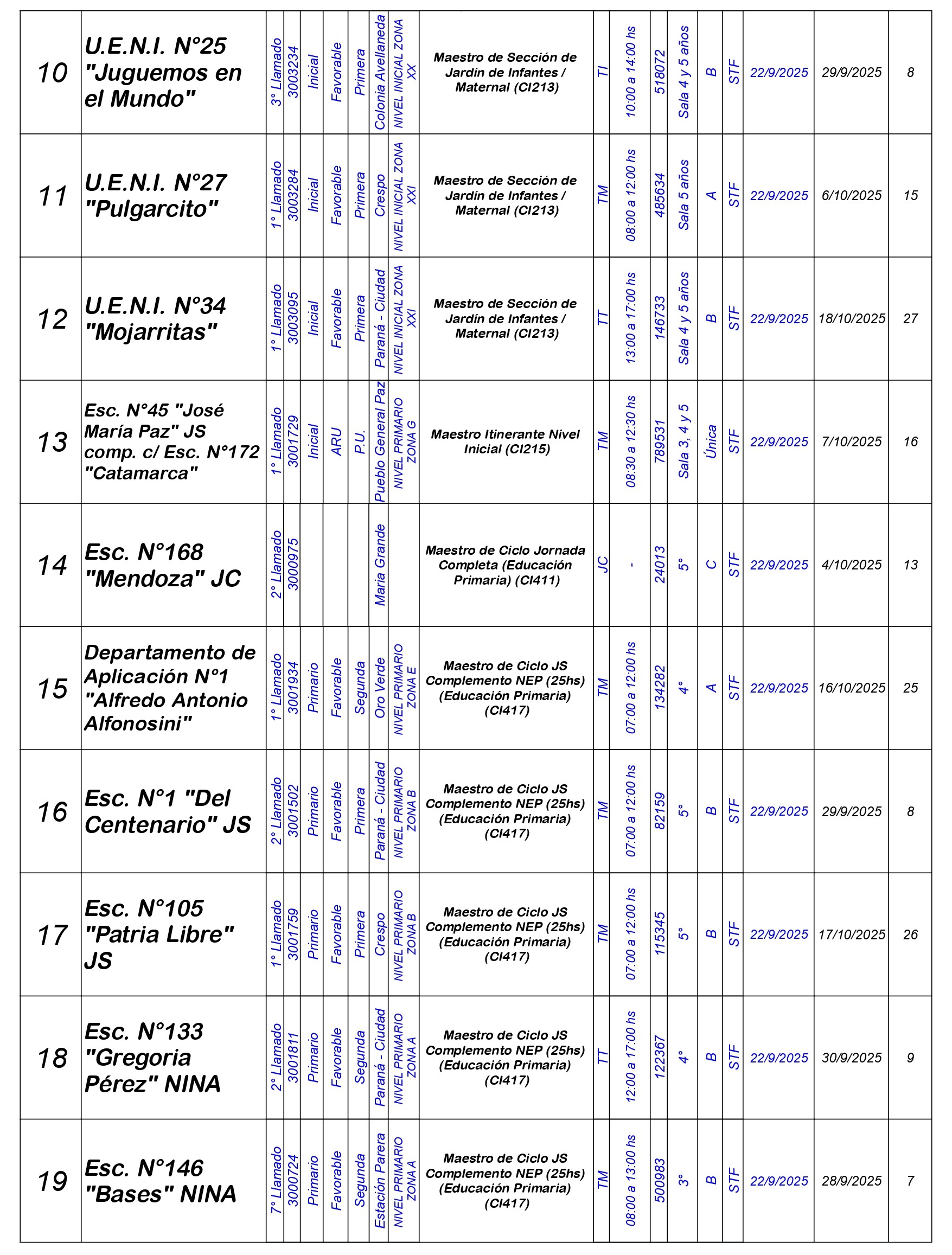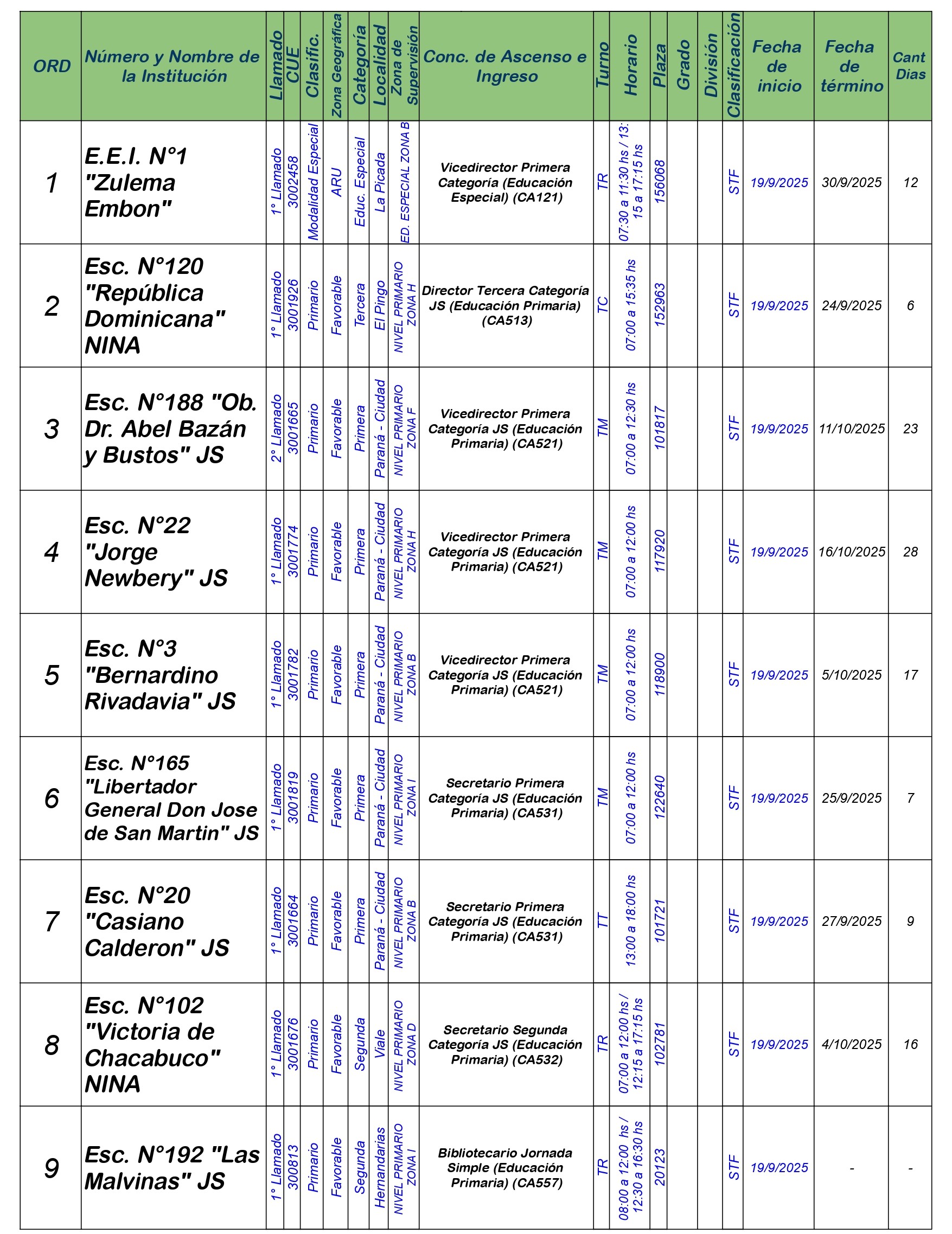 La Dirección Departamental de Escuelas Paraná Convoca a concurso presencial para el día LUNES 8 de SEPTIEMBRE de 2025 a partir de las 08:00hs, en las instalaciones de la Biblioteca Pedagógica, sita en calle Belgrano 165 – De la Ciudad de Paraná, para la cobertura de Cargos de Ascenso e Ingreso de Nivel Inicial – Primario y Modalidades. En el marco del Acuerdo Paritario /Reglamento de Concursos Resolución Ministerial N° 783 M.T. (Res. 1000/13) – Resolución N° 0691/21 CGE y sus modificatorias,- De Director, Resolución N° 1200/22 C.G.E. y modificatorias – De Vicedirector, Resolución N° 1200/22 C.G.E. y modificatorias – Listado de Suplencias vigentes: Listado de Suplencias de Ascenso N° 188 y el Listado de Suplencias de Ingreso N° 188. Resol. 3100-24-CGE-Autodesplazamiento.-