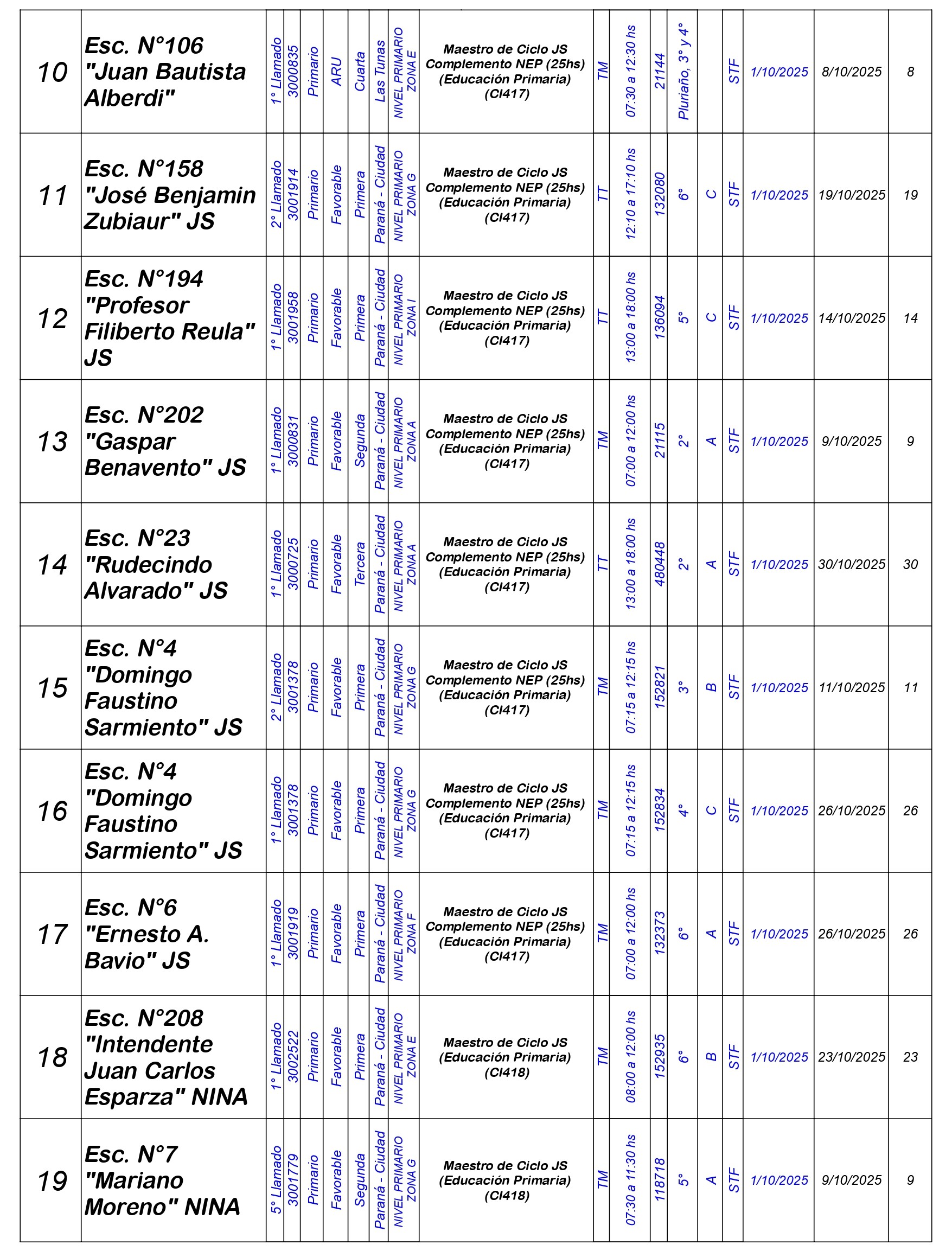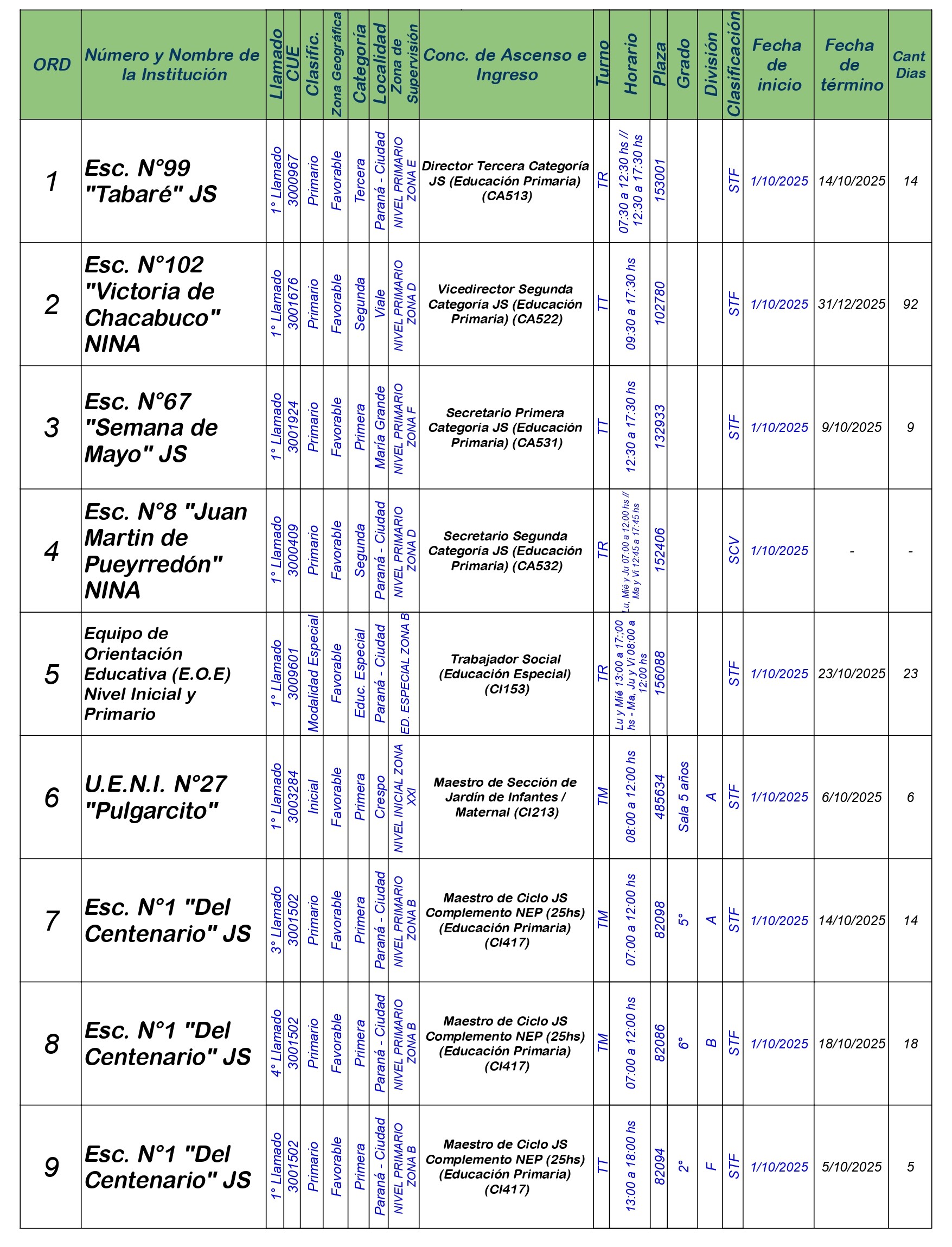 La Dirección Departamental de Escuelas Paraná Convoca a concurso presencial para el día MIÉRCOLES 1 de OCTUBRE de 2025 a partir de las 08:00 hs, en Salón de Concursos de la Dirección Departamental de Escuelas Paraná, sita en calle Don Bosco N°749 (Complejo “Eva Perón”) de la Ciudad de Paraná, para la cobertura de Cargos de Ascenso e Ingreso de Nivel Inicial – Primario y Modalidades. En el marco del Acuerdo Paritario /Reglamento de Concursos Resolución Ministerial N° 783 M.T. (Res. 1000/13) – Resolución N° 0691/21 CGE y sus modificatorias,- De Director, Resolución N° 1200/22 C.G.E. y modificatorias – De Vicedirector, Resolución N° 1200/22 C.G.E. y modificatorias – Listado de Suplencias vigentes: Listado de Suplencias de Ascenso N° 188 y el Listado de Suplencias de Ingreso N° 188. Están autorizados los autodesplazamientos en cargos de Ingreso según Resol. 3100-24-CGE-Autodesplazamiento.-