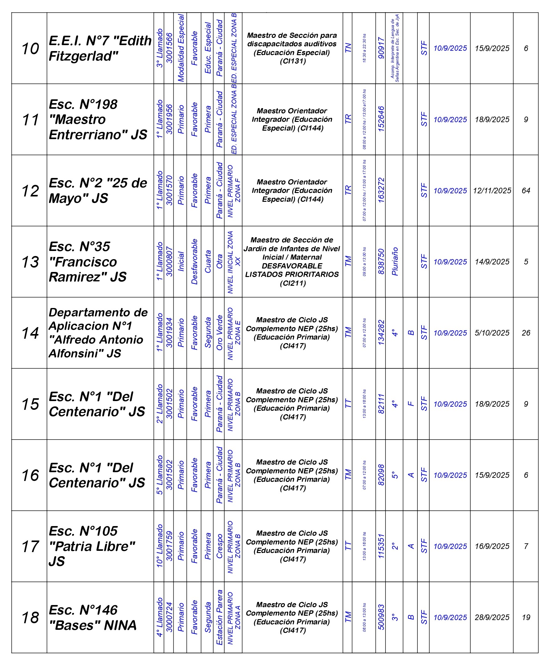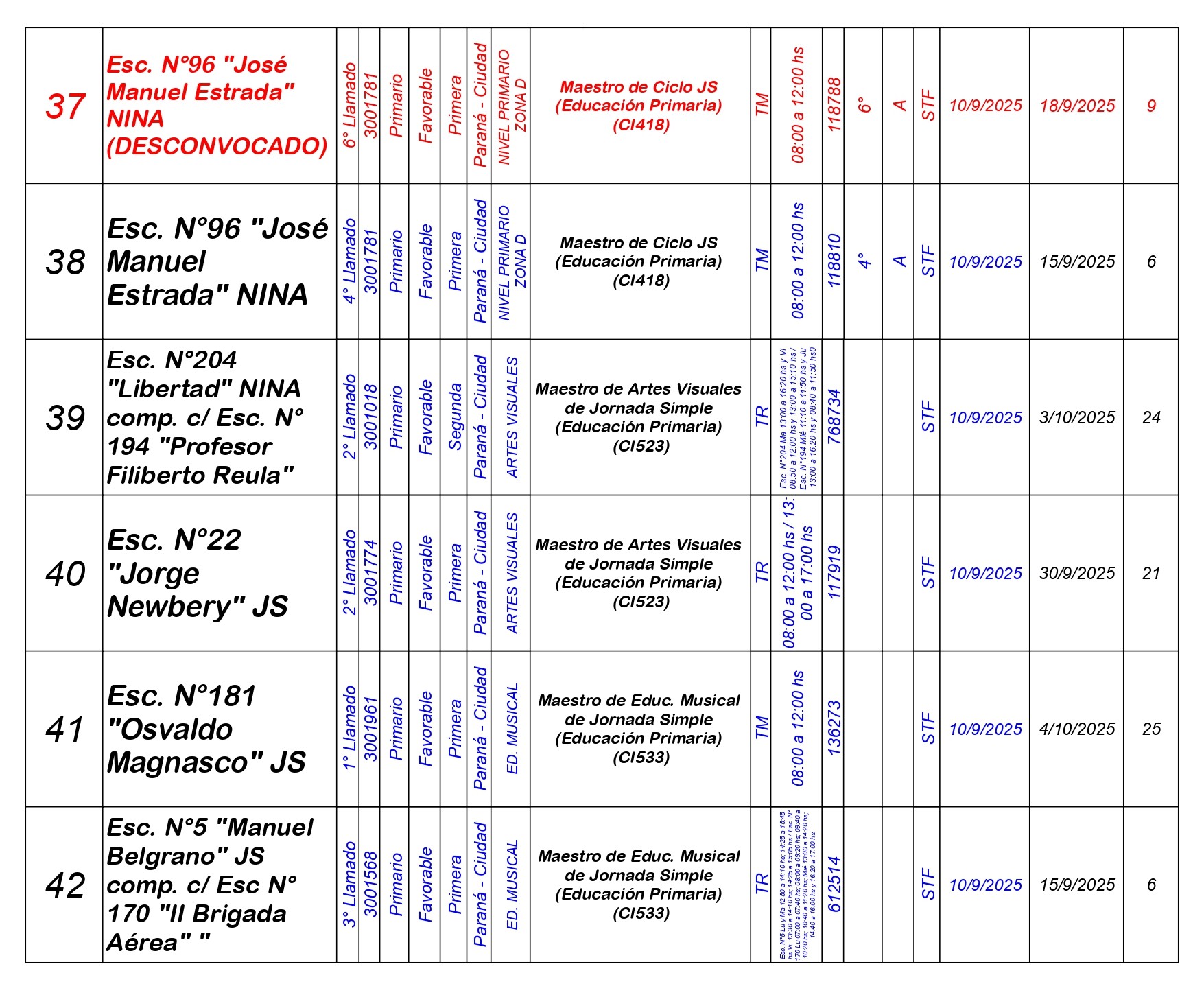 La Dirección Departamental de Escuelas Paraná Convoca a concurso presencial para el día MIERCOLES 10 de SEPTIEMBRE de 2025 a partir de las 08:00hs, en las instalaciones de la Biblioteca Pedagógica, sita en calle Belgrano 165 – De la Ciudad de Paraná, para la cobertura de Cargos de Ascenso e Ingreso de Nivel Inicial – Primario y Modalidades. En el marco del Acuerdo Paritario /Reglamento de Concursos Resolución Ministerial N° 783 M.T. (Res. 1000/13) – Resolución N° 0691/21 CGE y sus modificatorias,- De Director, Resolución N° 1200/22 C.G.E. y modificatorias – De Vicedirector, Resolución N° 1200/22 C.G.E. y modificatorias – Listado de Suplencias vigentes: Listado de Suplencias de Ascenso N° 188 y el Listado de Suplencias de Ingreso N° 188. Están autorizados los autodesplazamientos en cargos de Ingreso según Resol. 3100-24-CGE-Autodesplazamiento.-