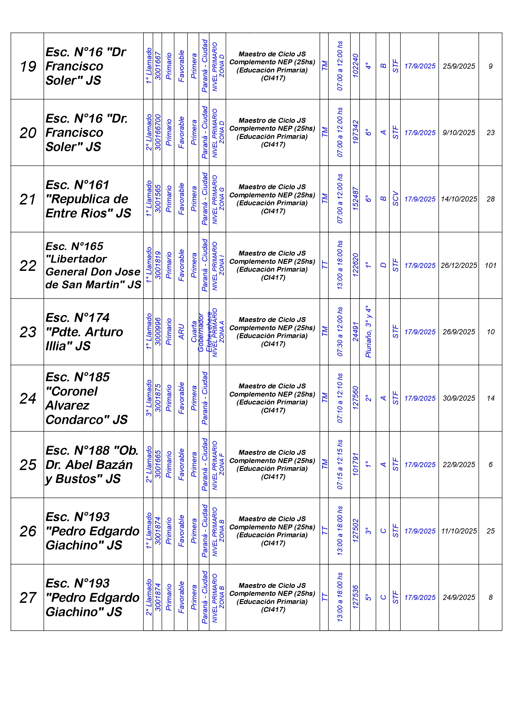 La Dirección Departamental de Escuelas Paraná Convoca a concurso presencial para el día MIERCOLES 17 de SEPTIEMBRE de 2025 a partir de las 08:00hs, en Salón de Concursos de la Dirección Departamental de Escuelas Paraná, sita en calle Don Bosco N°749 (Complejo “Eva Perón” de la Ciudad de Paraná, para la cobertura de Cargos de Ascenso e Ingreso de Nivel Inicial – Primario y Modalidades. En el marco del Acuerdo Paritario /Reglamento de Concursos Resolución Ministerial N° 783 M.T. (Res. 1000/13) – Resolución N° 0691/21 CGE y sus modificatorias,- De Director, Resolución N° 1200/22 C.G.E. y modificatorias – De Vicedirector, Resolución N° 1200/22 C.G.E. y modificatorias – Listado de Suplencias vigentes: Listado de Suplencias de Ascenso N° 188 y el Listado de Suplencias de Ingreso N° 188. Están autorizados los autodesplazamientos en cargos de Ingreso según Resol. 3100-24-CGE-Autodesplazamiento.-