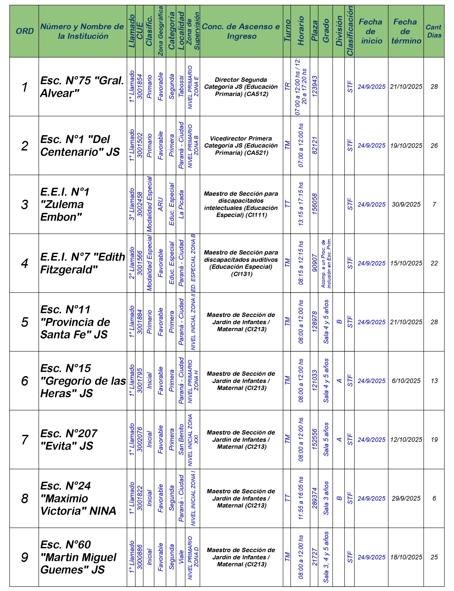 La Dirección Departamental de Escuelas Paraná Convoca a concurso presencial para el día MIÉRCOLES 24 de SEPTIEMBRE de 2025 a partir de las 08:00hs, en Salón de Concursos de la Dirección Departamental de Escuelas Paraná, sita en calle Don Bosco N°749 (Complejo “Eva Perón” de la Ciudad de Paraná, para la cobertura de Cargos de Ascenso e Ingreso de Nivel Inicial – Primario y Modalidades. En el marco del Acuerdo Paritario /Reglamento de Concursos Resolución Ministerial N° 783 M.T. (Res. 1000/13) – Resolución N° 0691/21 CGE y sus modificatorias,- De Director, Resolución N° 1200/22 C.G.E. y modificatorias – De Vicedirector, Resolución N° 1200/22 C.G.E. y modificatorias – Listado de Suplencias vigentes: Listado de Suplencias de Ascenso N° 188 y el Listado de Suplencias de Ingreso N° 188. Están autorizados los autodesplazamientos en cargos de Ingreso según Resol. 3100-24-CGE-Autodesplazamiento.-