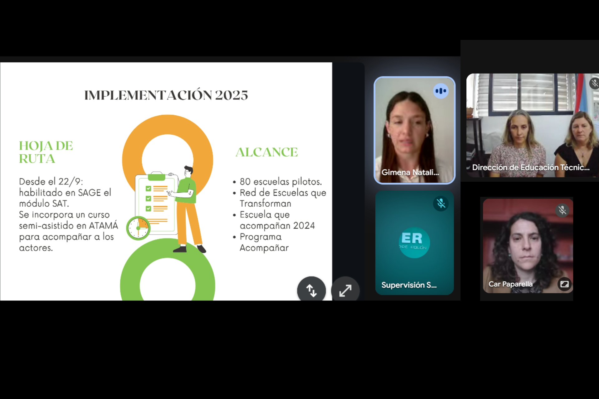 El relanzamiento virtual contó con la presencia de las vocales del CGE, Carla Duré y Elsa Chapuis; la directora de Educación Técnico Profesional, Natalia Sendra; la directora de Educación de Gestión Privada, Judith Trembecki; el coordinador de direcciones departamentales, Sebastián Benedetti; y los equipos técnicos y pedagógicos de los niveles.