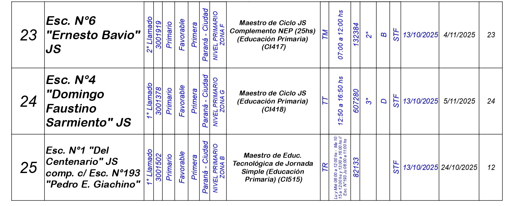 La Dirección Departamental de Escuelas Paraná Convoca a concurso presencial para el día LUNES 13 de OCTUBRE de 2025 a partir de las 08:00 hs, en Salón de Concursos de la Dirección Departamental de Escuelas Paraná, sita en calle Don Bosco N°749 (Complejo “Eva Perón”) de la Ciudad de Paraná, para la cobertura de Cargos de Ascenso e Ingreso de Nivel Inicial – Primario y Modalidades. En el marco del Acuerdo Paritario /Reglamento de Concursos Resolución Ministerial N° 783 M.T. (Res. 1000/13) – Resolución N° 0691/21 CGE y sus modificatorias,- De Director, Resolución N° 1200/22 C.G.E. y modificatorias – De Vicedirector, Resolución N° 1200/22 C.G.E. y modificatorias – Listado de Suplencias vigentes: Listado de Suplencias de Ascenso N° 188 y el Listado de Suplencias de Ingreso N° 188.