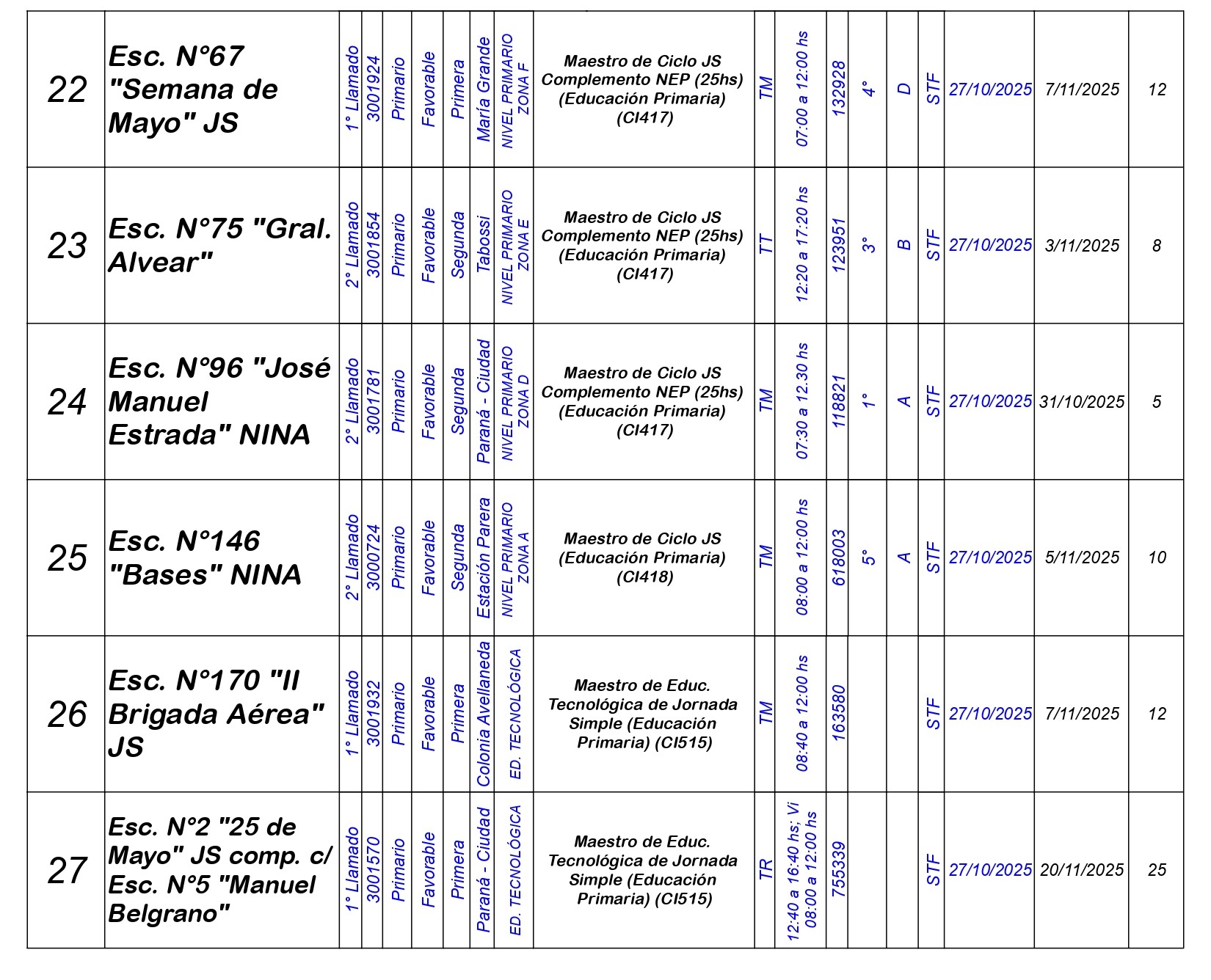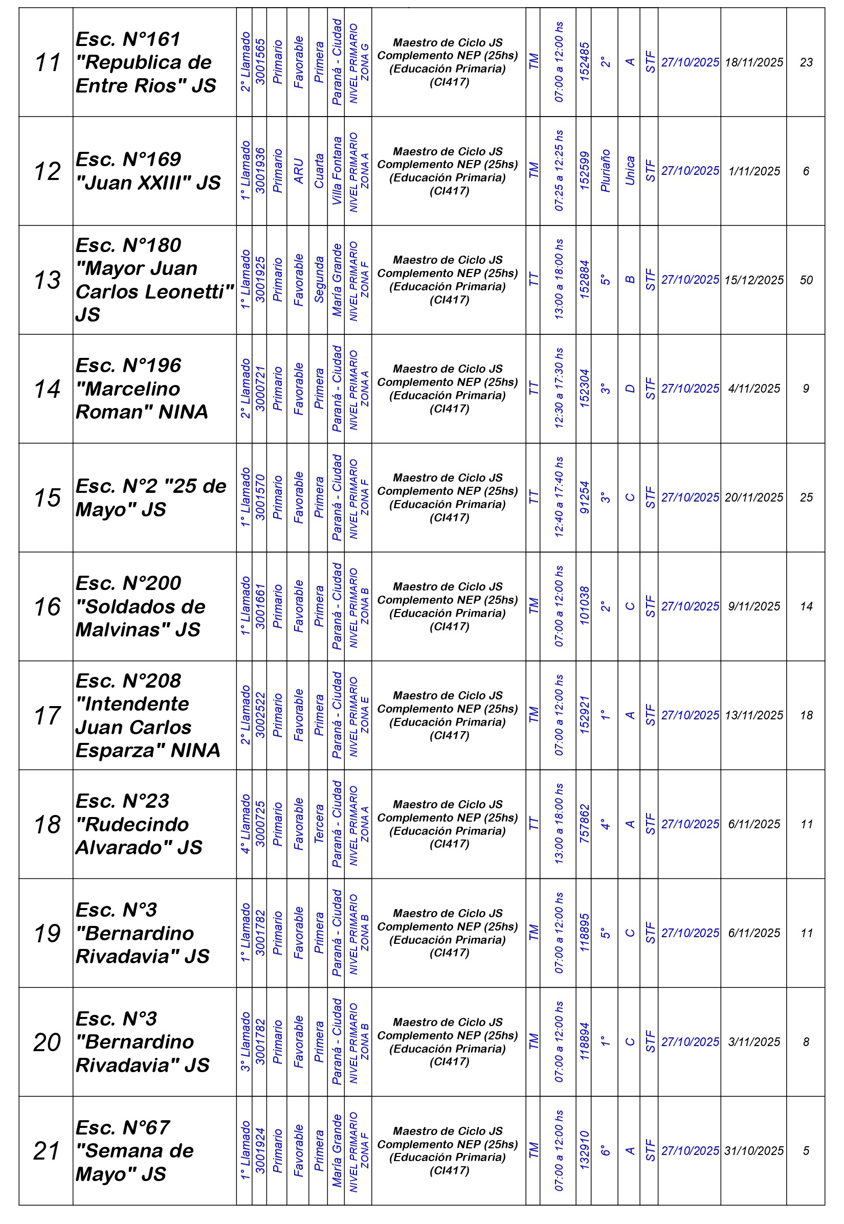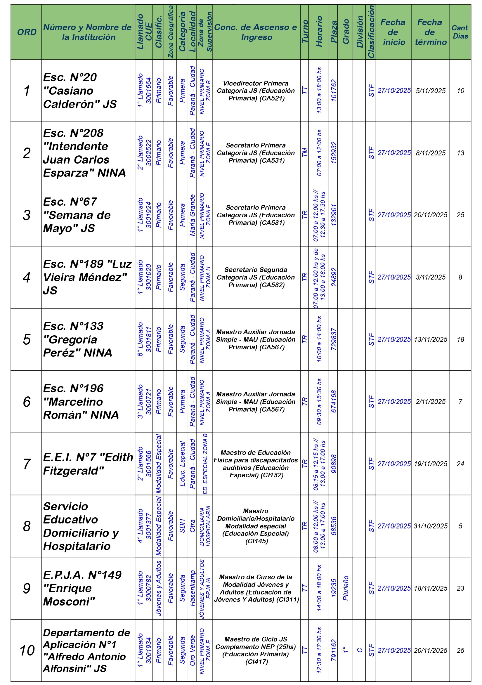 La Dirección Departamental de Escuelas Paraná Convoca a concurso presencial para el día LUNES 27 de OCTUBRE de 2025 a partir de las 08:00 hs, en Salón de Concursos de la Dirección Departamental de Escuelas Paraná, sita en calle Don Bosco N°749 (Complejo “Eva Perón”) de la Ciudad de Paraná, para la cobertura de Cargos de Ascenso e Ingreso de Nivel Inicial – Primario y Modalidades. En el marco del Acuerdo Paritario /Reglamento de Concursos Resolución Ministerial N° 783 M.T. (Res. 1000/13) – Resolución N° 0691/21 CGE y sus modificatorias,- De Director, Resolución N° 1200/22 C.G.E. y modificatorias – De Vicedirector, Resolución N° 1200/22 C.G.E. y modificatorias – Listado de Suplencias vigentes: Listado de Suplencias de Ascenso N° 188 y el Listado de Suplencias de Ingreso N° 188.