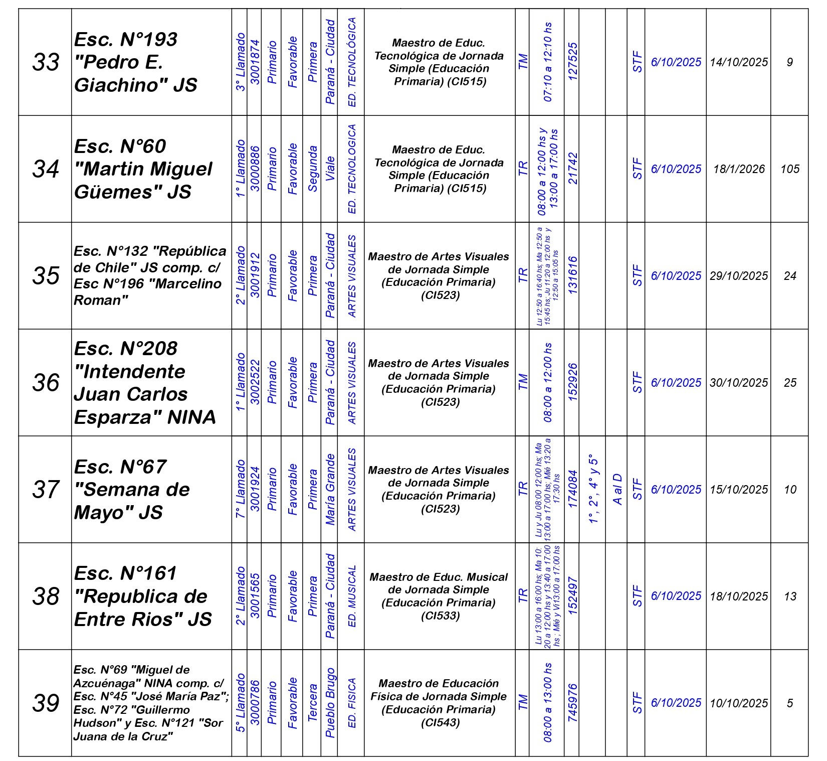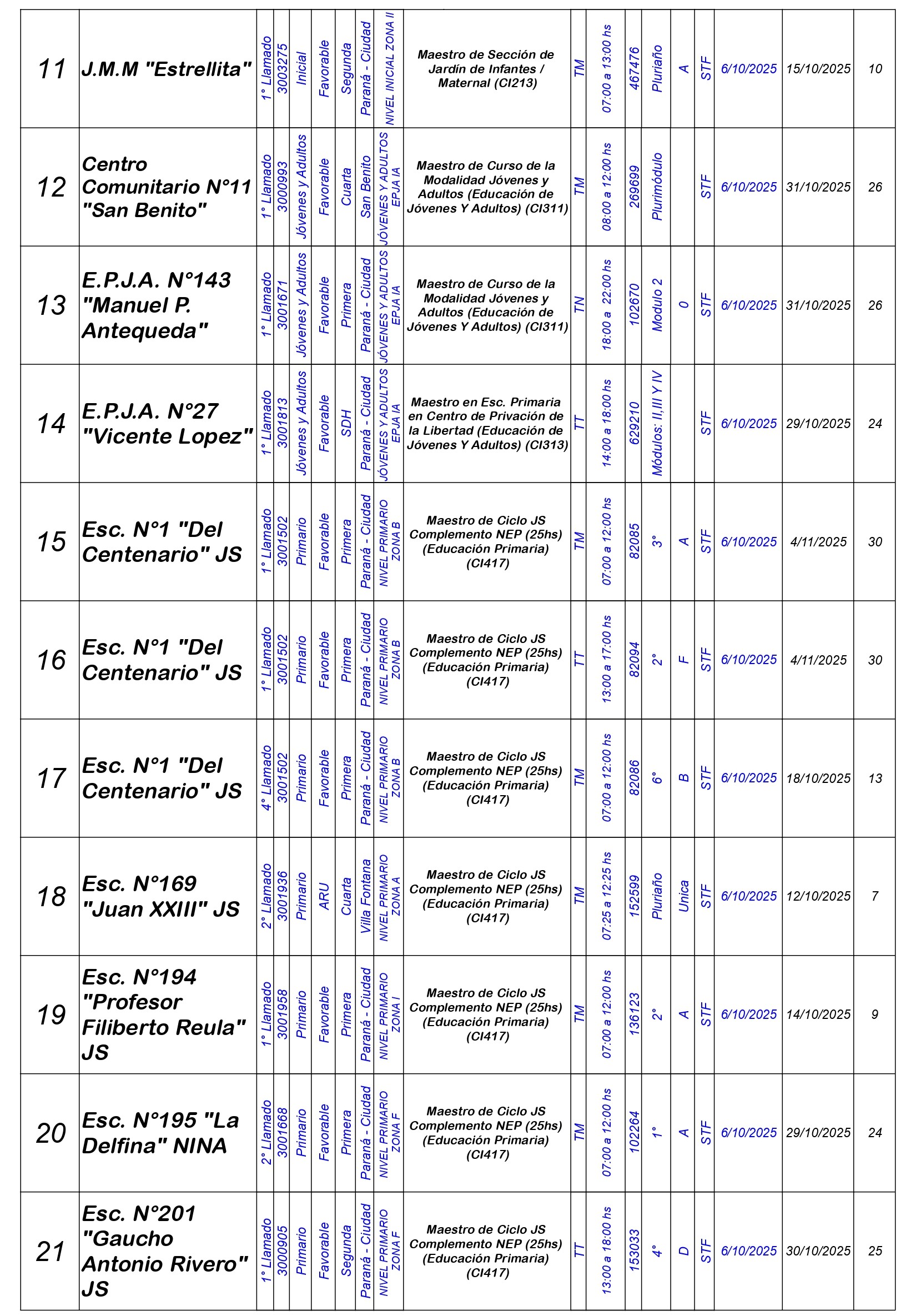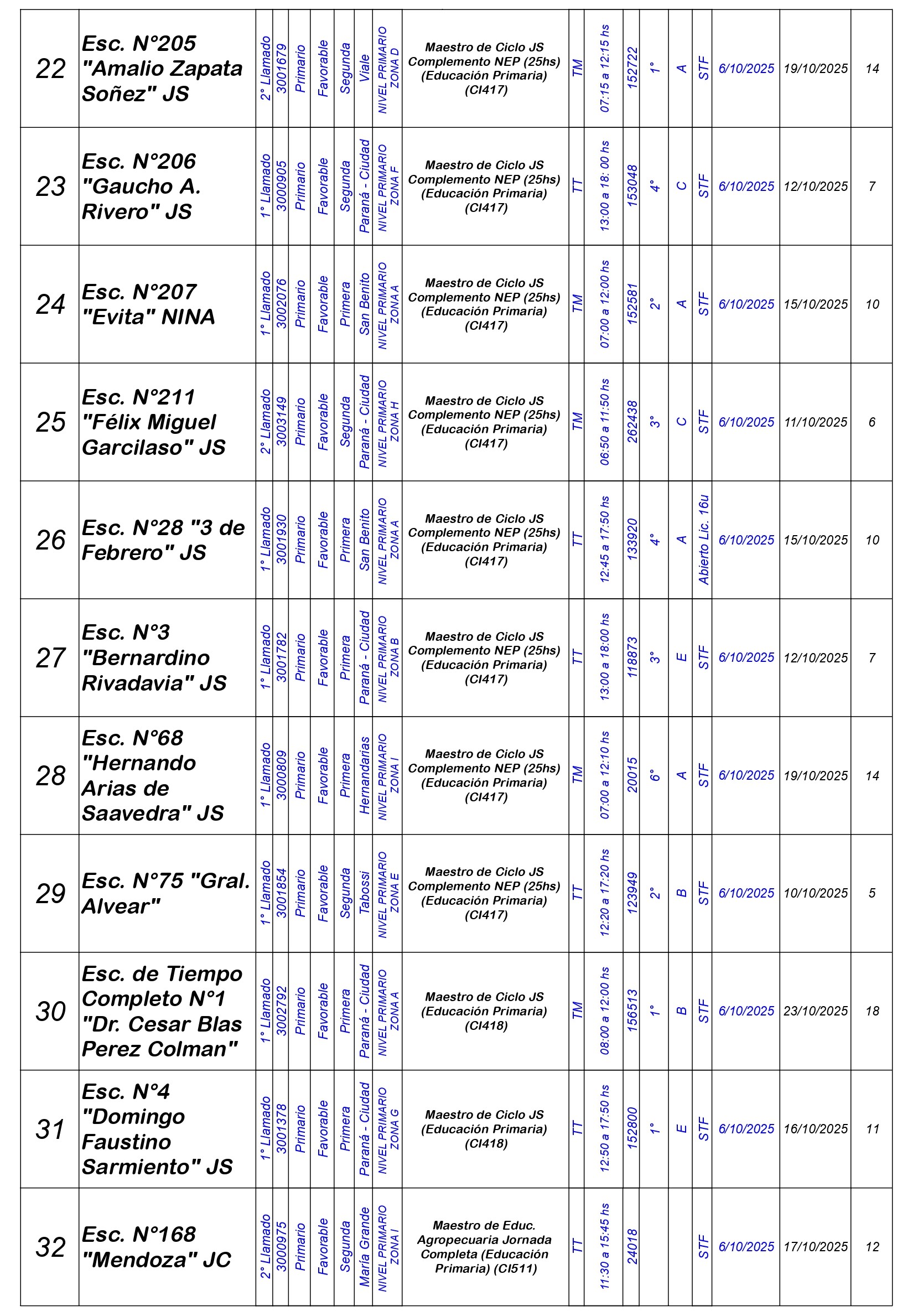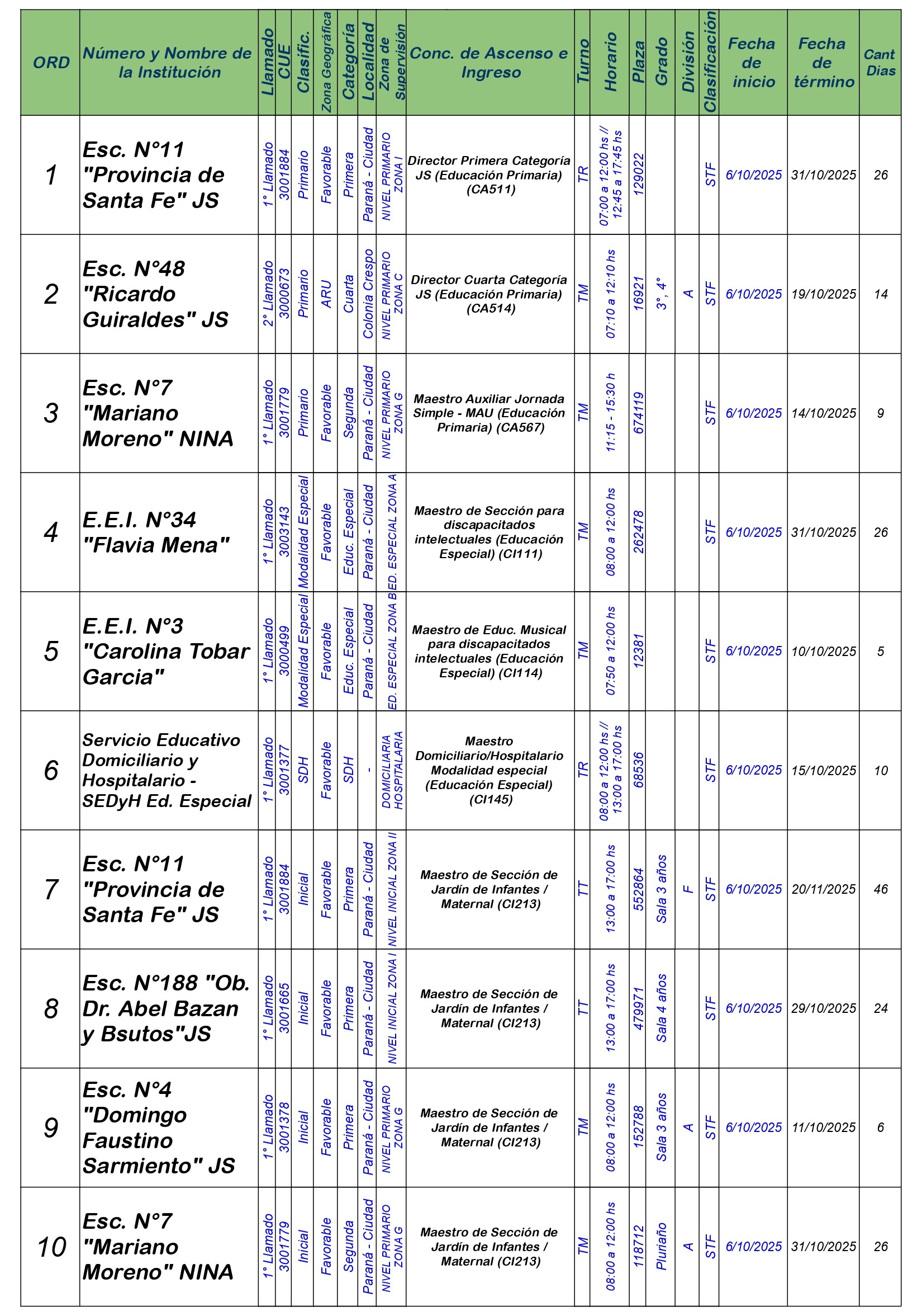 La Dirección Departamental de Escuelas Paraná Convoca a concurso presencial para el día LUNES 6 de OCTUBRE de 2025 a partir de las 08:00 hs, en Salón de Concursos de la Dirección Departamental de Escuelas Paraná, sita en calle Don Bosco N°749 (Complejo “Eva Perón”) de la Ciudad de Paraná, para la cobertura de Cargos de Ascenso e Ingreso de Nivel Inicial – Primario y Modalidades. En el marco del Acuerdo Paritario /Reglamento de Concursos Resolución Ministerial N° 783 M.T. (Res. 1000/13) – Resolución N° 0691/21 CGE y sus modificatorias,- De Director, Resolución N° 1200/22 C.G.E. y modificatorias – De Vicedirector, Resolución N° 1200/22 C.G.E. y modificatorias – Listado de Suplencias vigentes: Listado de Suplencias de Ascenso N° 188 y el Listado de Suplencias de Ingreso N° 188. Están autorizados los autodesplazamientos en cargos de Ingreso según Resol. 3100-24-CGE-Autodesplazamiento.-