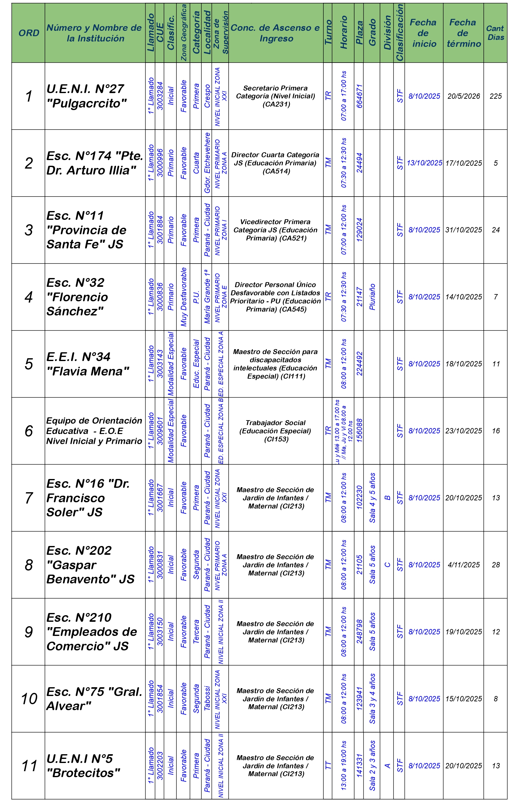 La Dirección Departamental de Escuelas Paraná Convoca a concurso presencial para el día MIÉRCOLES 8 de OCTUBRE de 2025 a partir de las 08:00 hs, en Salón de Concursos de la Dirección Departamental de Escuelas Paraná, sita en calle Don Bosco N°749 (Complejo “Eva Perón”) de la Ciudad de Paraná, para la cobertura de Cargos de Ascenso e Ingreso de Nivel Inicial – Primario y Modalidades. En el marco del Acuerdo Paritario /Reglamento de Concursos Resolución Ministerial N° 783 M.T. (Res. 1000/13) – Resolución N° 0691/21 CGE y sus modificatorias,- De Director, Resolución N° 1200/22 C.G.E. y modificatorias – De Vicedirector, Resolución N° 1200/22 C.G.E. y modificatorias – Listado de Suplencias vigentes: Listado de Suplencias de Ascenso N° 188 y el Listado de Suplencias de Ingreso N° 188. Están autorizados los autodesplazamientos en cargos de Ingreso según Resol. 3100-24-CGE-Autodesplazamiento.-