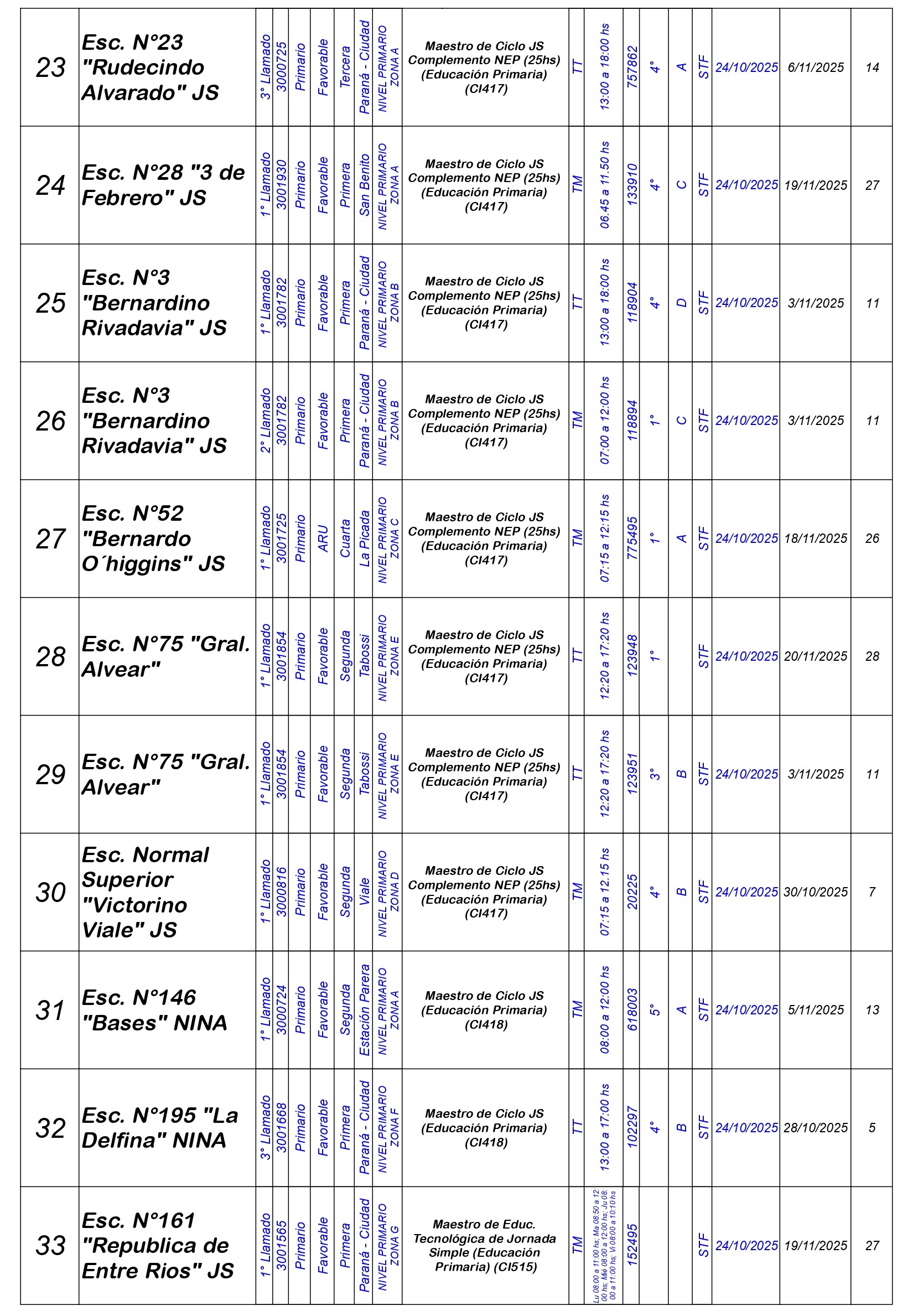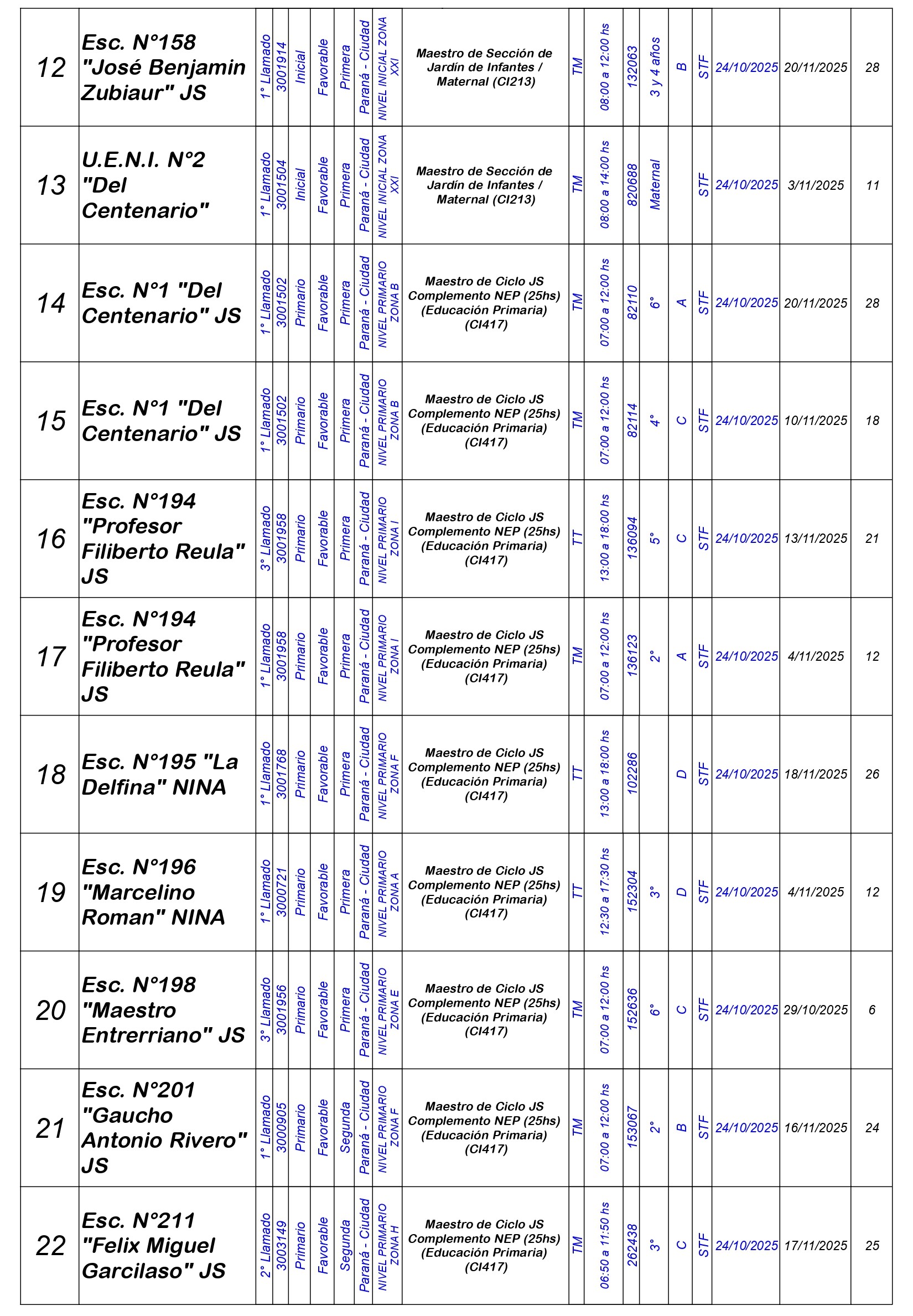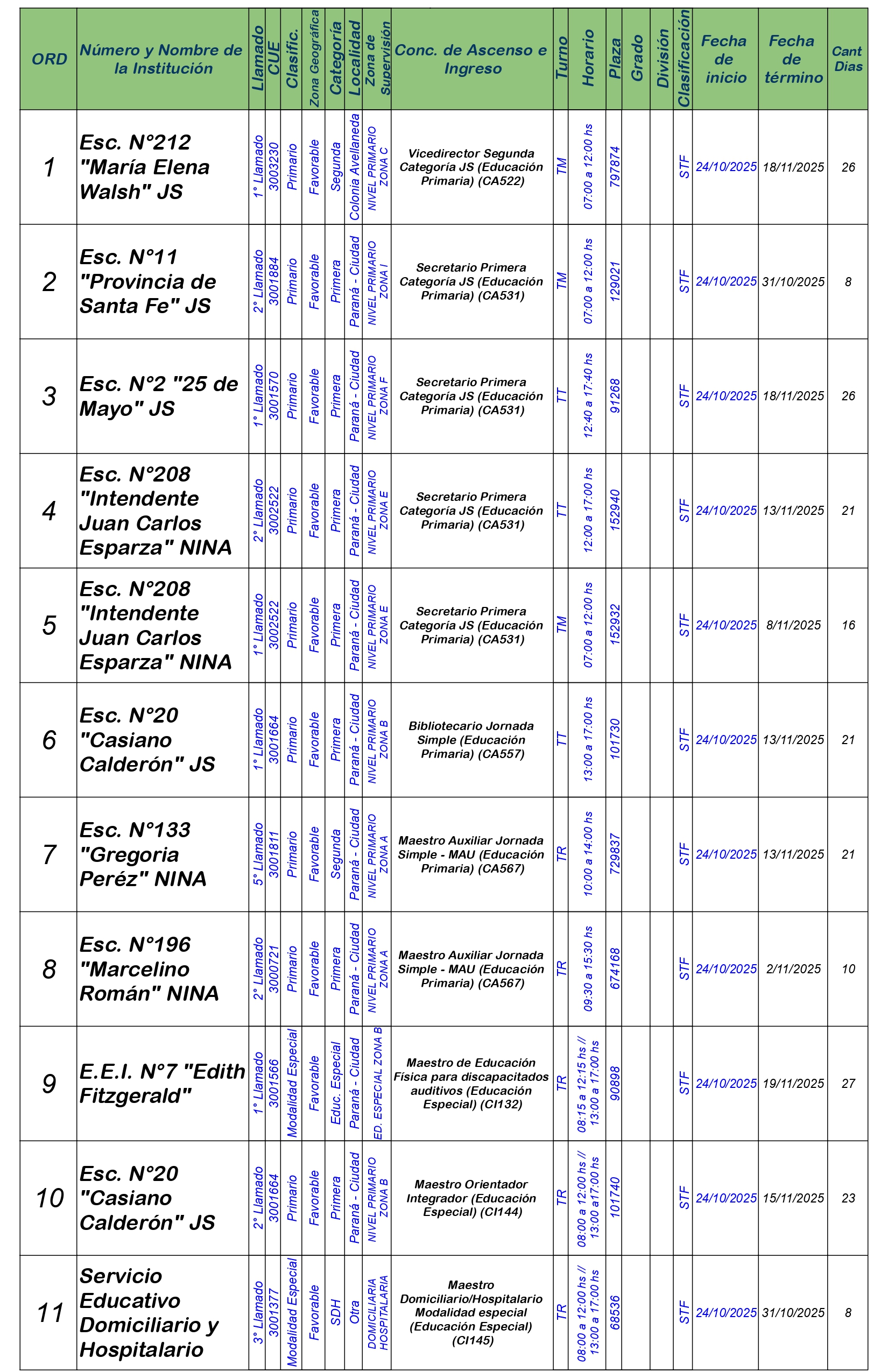 La Dirección Departamental de Escuelas Paraná Convoca a concurso presencial para el día Viernes 24 de OCTUBRE de 2025 a partir de las 08:00 hs, en Salón de Concursos de la Dirección Departamental de Escuelas Paraná, sita en calle Don Bosco N°749 (Complejo “Eva Perón”) de la Ciudad de Paraná, para la cobertura de Cargos de Ascenso e Ingreso de Nivel Inicial – Primario y Modalidades. En el marco del Acuerdo Paritario /Reglamento de Concursos Resolución Ministerial N° 783 M.T. (Res. 1000/13) – Resolución N° 0691/21 CGE y sus modificatorias,- De Director, Resolución N° 1200/22 C.G.E. y modificatorias – De Vicedirector, Resolución N° 1200/22 C.G.E. y modificatorias – Listado de Suplencias vigentes: Listado de Suplencias de Ascenso N° 188 y el Listado de Suplencias de Ingreso N° 188.