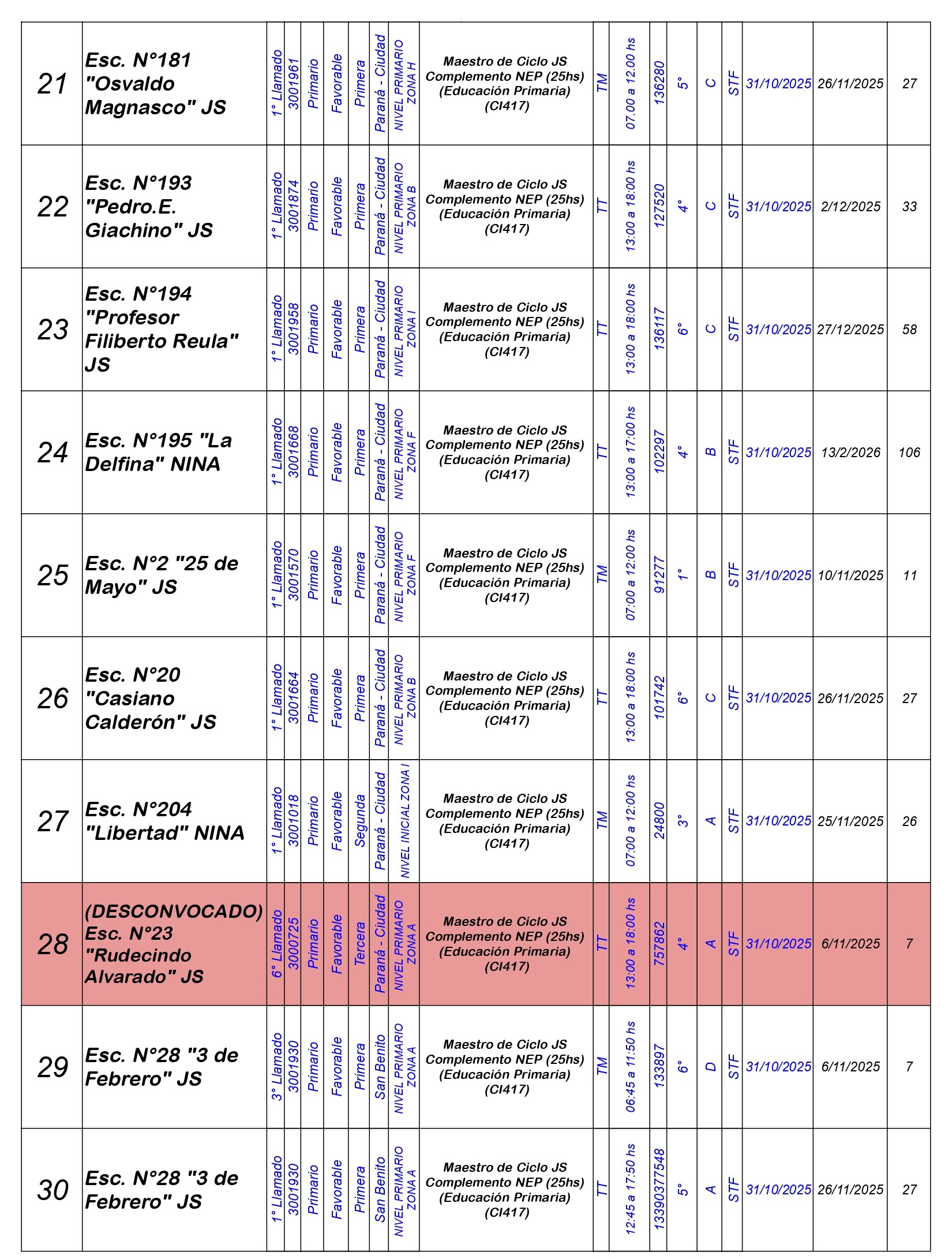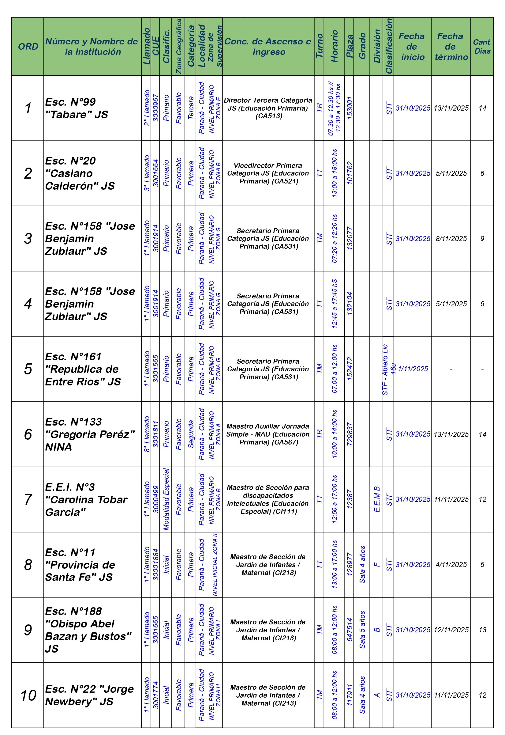 La Dirección Departamental de Escuelas Paraná Convoca a concurso presencial para el día VIERNES 31 de OCTUBRE de 2025 a partir de las 08:00 hs, en Salón de Concursos de la Dirección Departamental de Escuelas Paraná, sita en calle Don Bosco N°749 (Complejo “Eva Perón”) de la Ciudad de Paraná, para la cobertura de Cargos de Ascenso e Ingreso de Nivel Inicial – Primario y Modalidades. En el marco del Acuerdo Paritario /Reglamento de Concursos Resolución Ministerial N° 783 M.T. (Res. 1000/13) – Resolución N° 0691/21 CGE y sus modificatorias,- De Director, Resolución N° 1200/22 C.G.E. y modificatorias – De Vicedirector, Resolución N° 1200/22 C.G.E. y modificatorias – Listado de Suplencias vigentes: Listado de Suplencias de Ascenso N° 188 y el Listado de Suplencias de Ingreso N° 188.