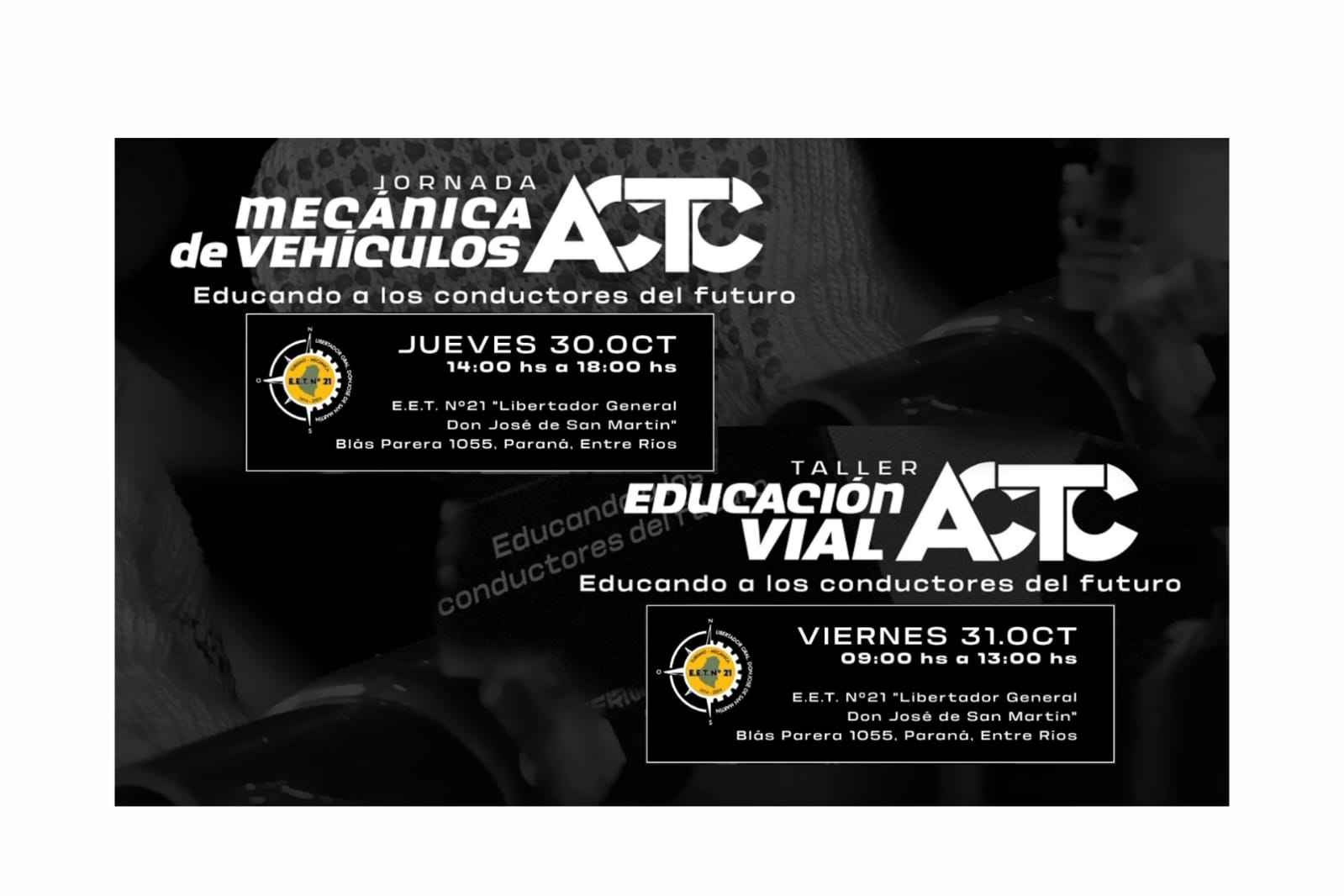 El viernes 31 de octubre se realizará el Taller de Educación Vial, de 9 a 13, también en la EET N° 21. La jornada estará dirigida por los instructores Diego Garay y Claudio Alonso, y contará nuevamente con la presencia de un piloto de Turismo Carretera.