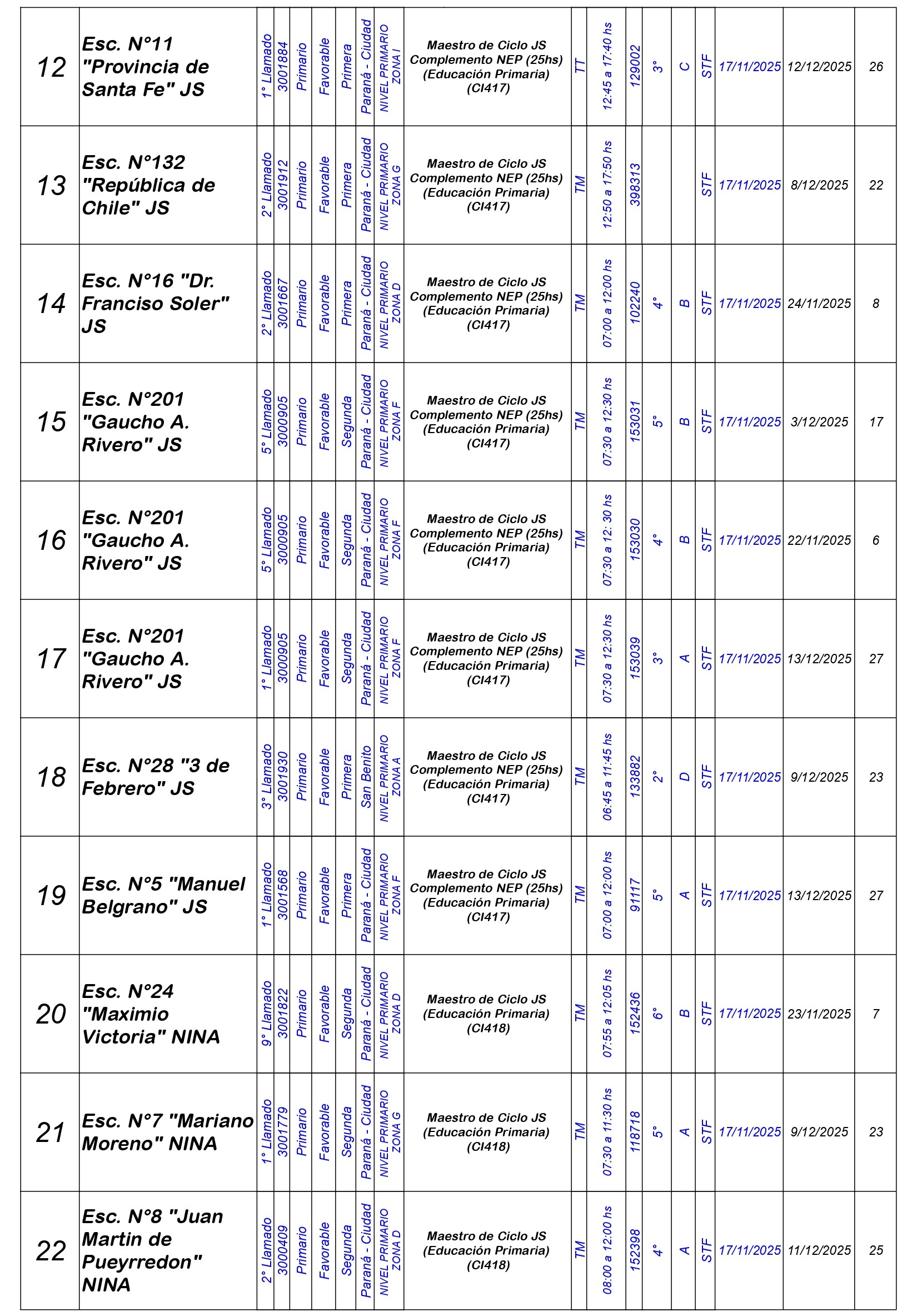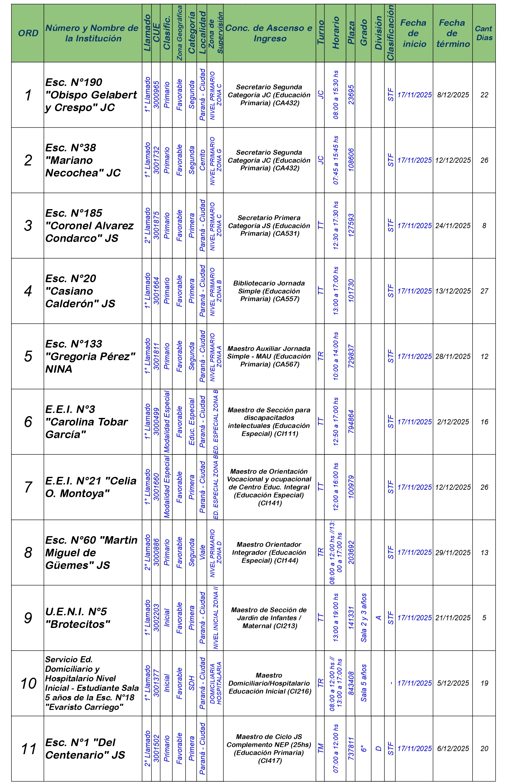 La Dirección Departamental de Escuelas Paraná Convoca a concurso presencial para el día LUNES 17 de NOVIEMBRE de 2025 a partir de las 08:00 hs, en Salón de Concursos de la Dirección Departamental de Escuelas Paraná, sita en calle Don Bosco N°749 (Complejo “Eva Perón”) de la Ciudad de Paraná, para la cobertura de Cargos de Ascenso e Ingreso de Nivel Inicial – Primario y Modalidades. En el marco del Acuerdo Paritario /Reglamento de Concursos Resolución Ministerial N° 783 M.T. (Res. 1000/13) – Resolución N° 0691/21 CGE y sus modificatorias,- De Director, Resolución N° 1200/22 C.G.E. y modificatorias – De Vicedirector, Resolución N° 1200/22 C.G.E. y modificatorias – Listado de Suplencias vigentes: Listado de Suplencias de Ascenso N° 188 y el Listado de Suplencias de Ingreso N° 188.