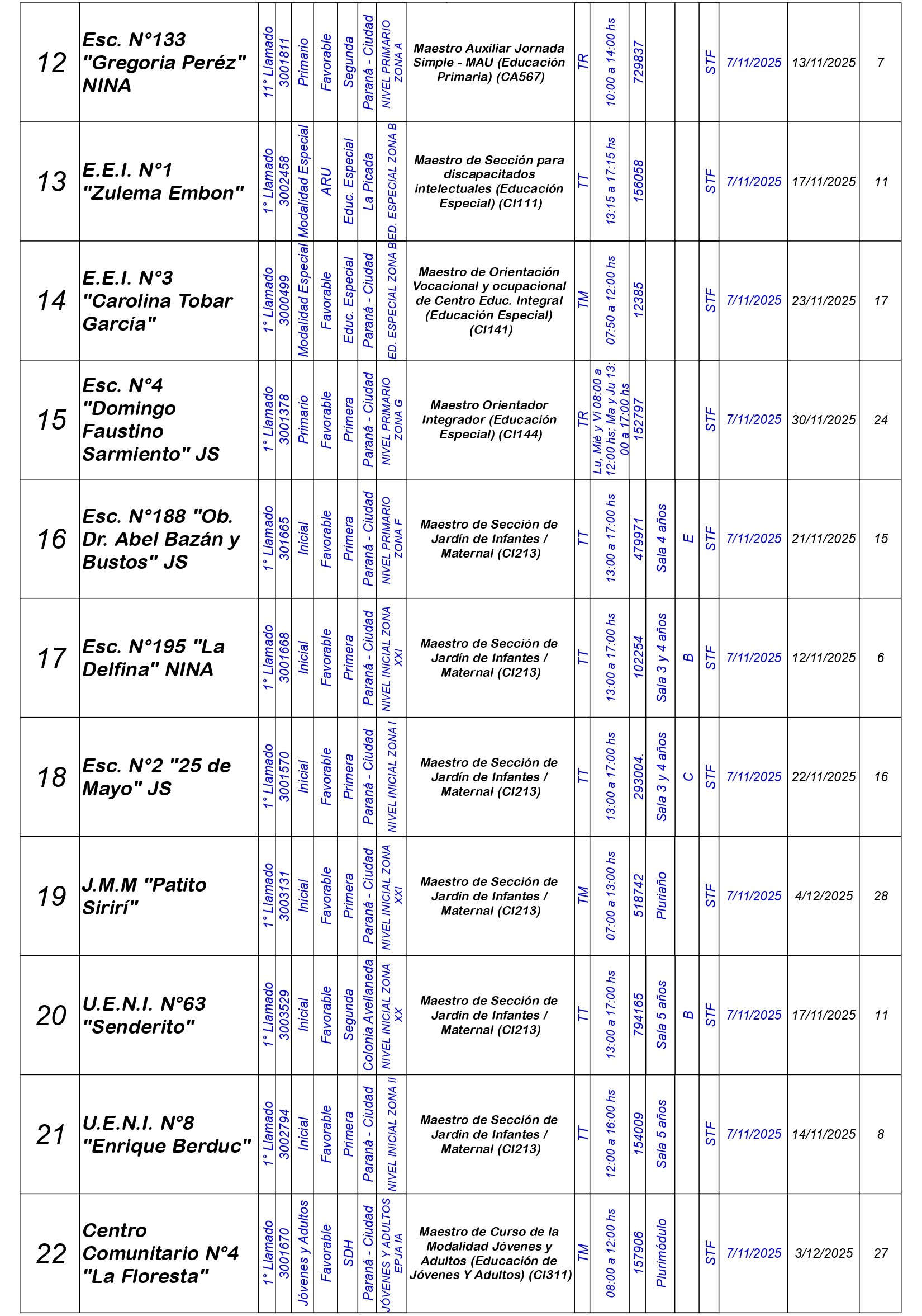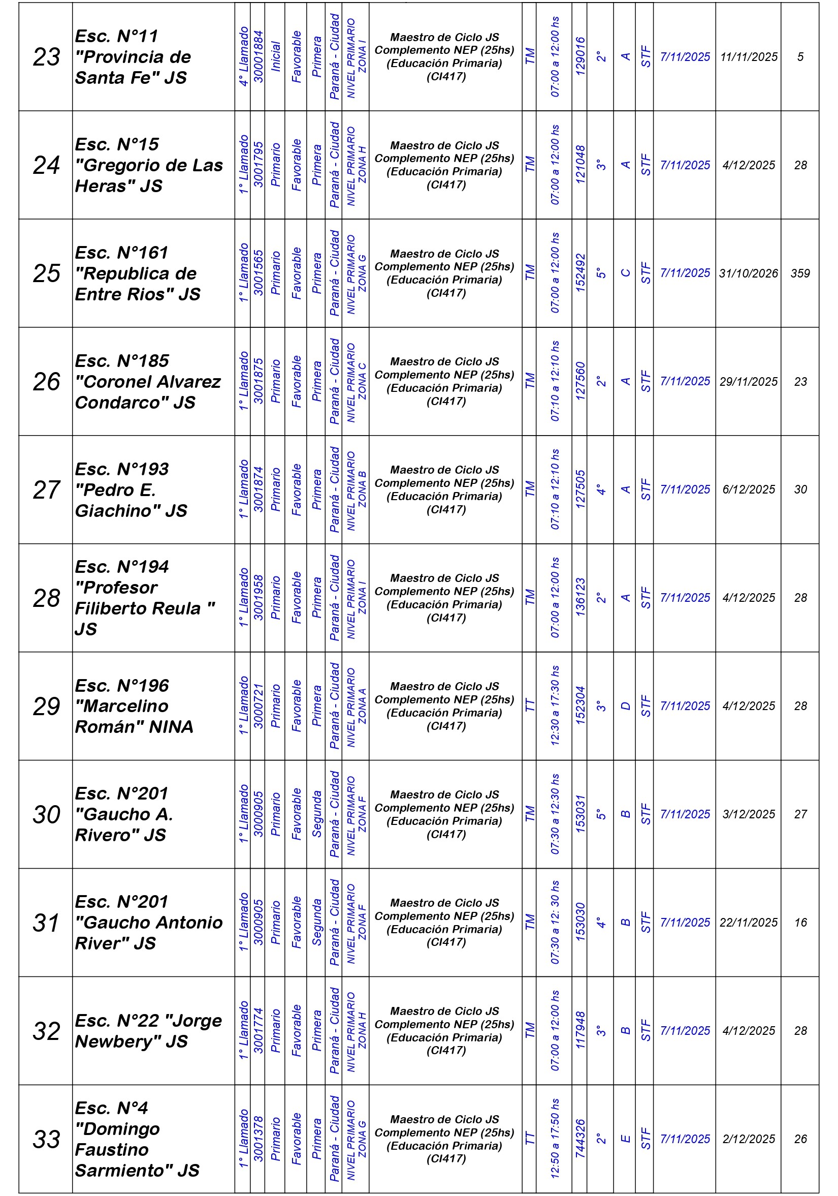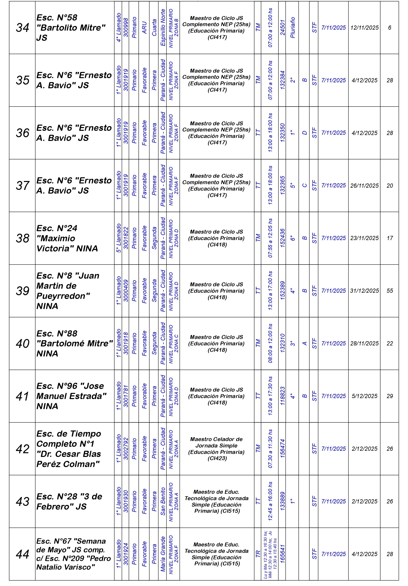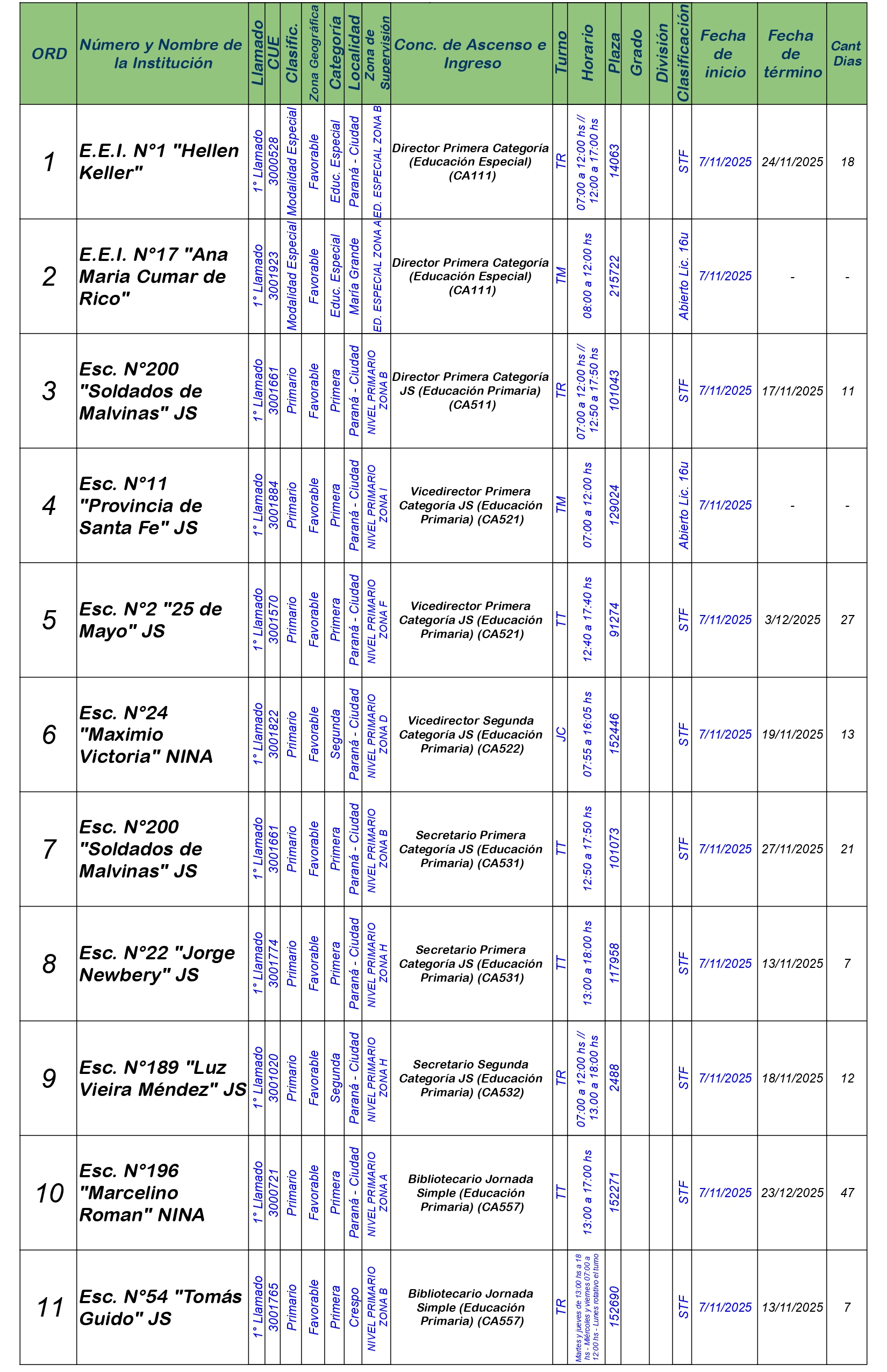 La Dirección Departamental de Escuelas Paraná Convoca a concurso presencial para el día VIERNES 7 de NOVIEMBRE de 2025 a partir de las 08:00 hs, en Salón de Concursos de la Dirección Departamental de Escuelas Paraná, sita en calle Don Bosco N°749 (Complejo “Eva Perón”) de la Ciudad de Paraná, para la cobertura de Cargos de Ascenso e Ingreso de Nivel Inicial – Primario y Modalidades. En el marco del Acuerdo Paritario /Reglamento de Concursos Resolución Ministerial N° 783 M.T. (Res. 1000/13) – Resolución N° 0691/21 CGE y sus modificatorias,- De Director, Resolución N° 1200/22 C.G.E. y modificatorias – De Vicedirector, Resolución N° 1200/22 C.G.E. y modificatorias – Listado de Suplencias vigentes: Listado de Suplencias de Ascenso N° 188 y el Listado de Suplencias de Ingreso N° 188.