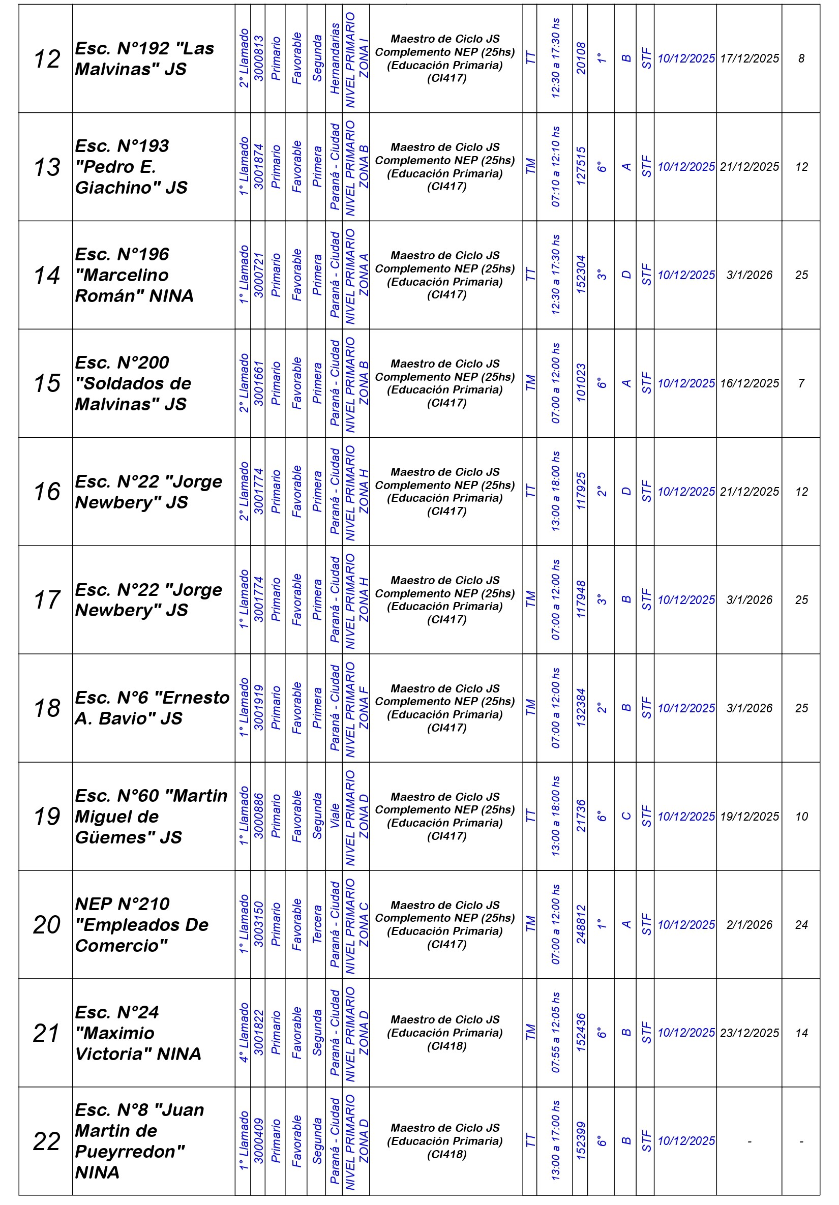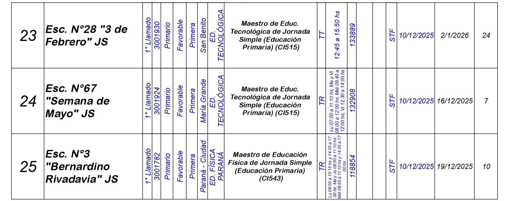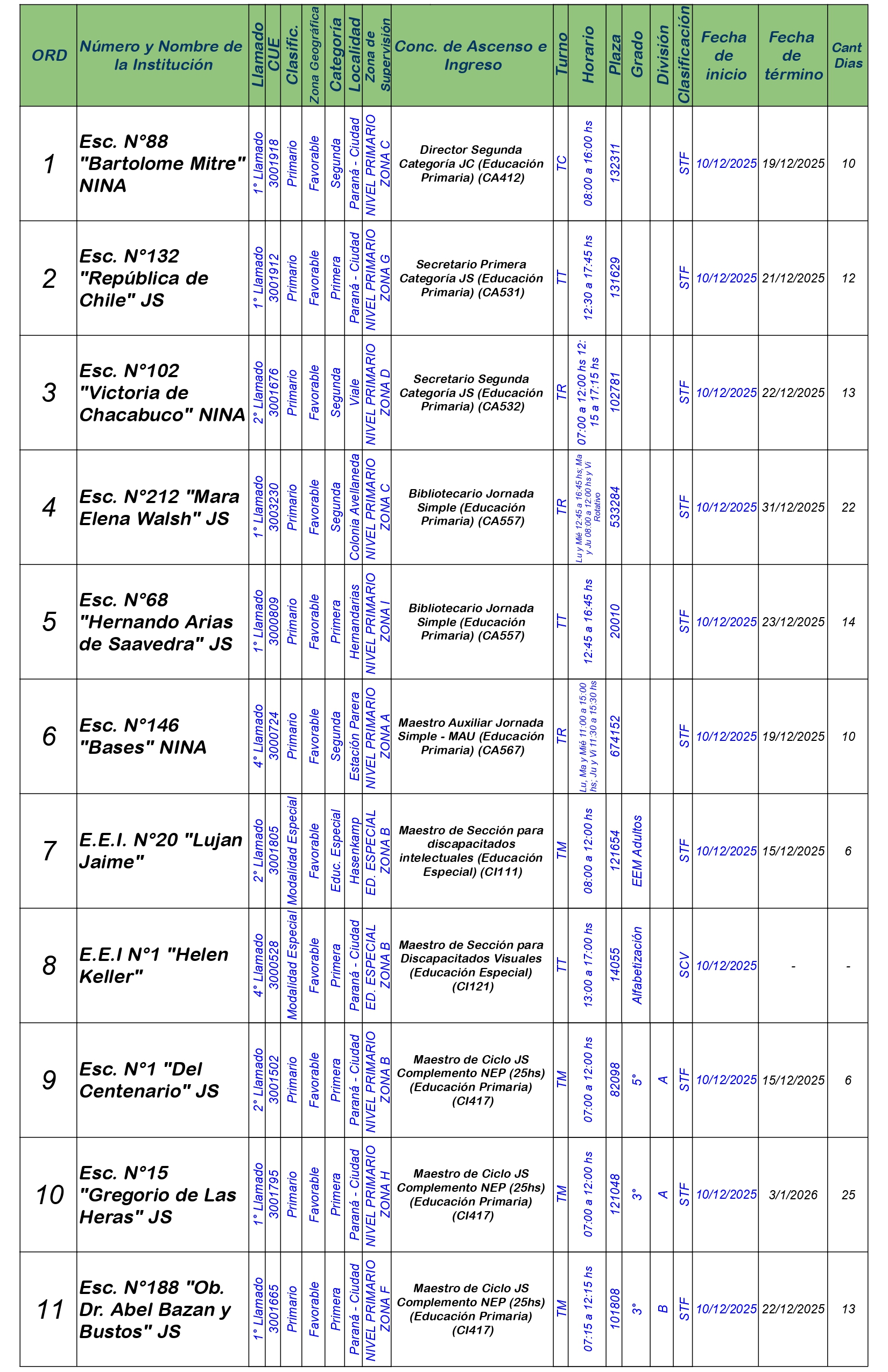 La Dirección Departamental de Escuelas Paraná Convoca a concurso presencial para el día MIÉRCOLES 10 de DICIEMBRE de 2025 a partir de las 08:00 hs, en Salón de Concursos de la Dirección Departamental de Escuelas Paraná, sita en calle Don Bosco N°749 (Complejo “Eva Perón”) de la Ciudad de Paraná, para la cobertura de Cargos de Ascenso e Ingreso de Nivel Inicial – Primario y Modalidades. En el marco del Acuerdo Paritario /Reglamento de Concursos Resolución Ministerial N° 783 M.T. (Res. 1000/13) – Resolución N° 0691/21 CGE y sus modificatorias,- De Director, Resolución N° 1200/22 C.G.E. y modificatorias – De Vicedirector, Resolución N° 1200/22 C.G.E. y modificatorias – Listado de Suplencias vigentes: Listado de Suplencias de Ascenso N° 188 y el Listado de Suplencias de Ingreso N° 188.