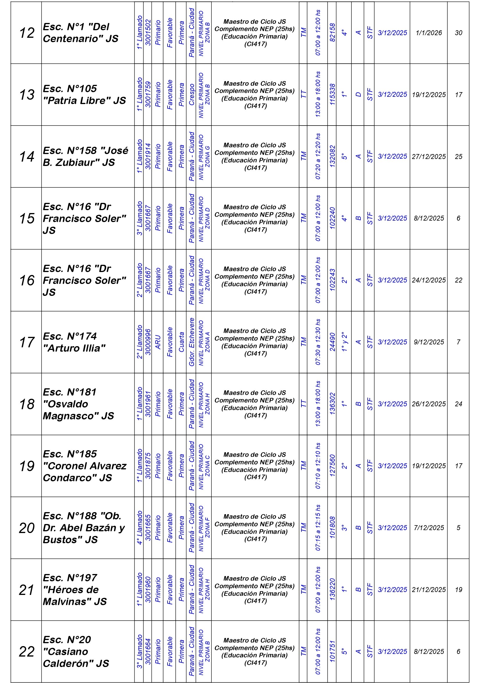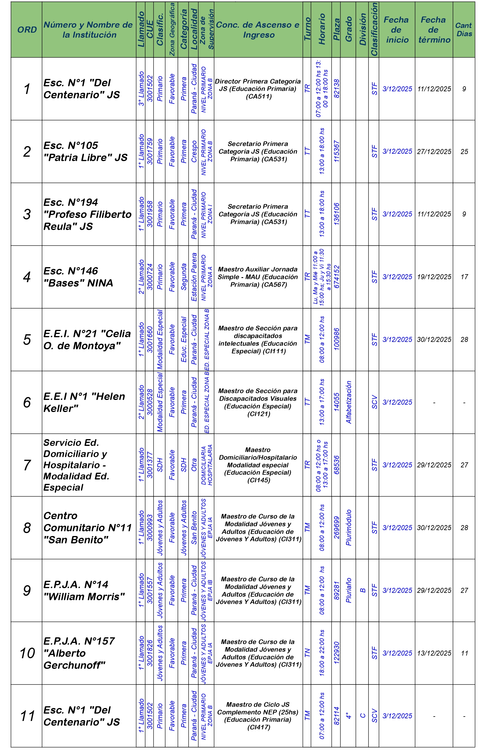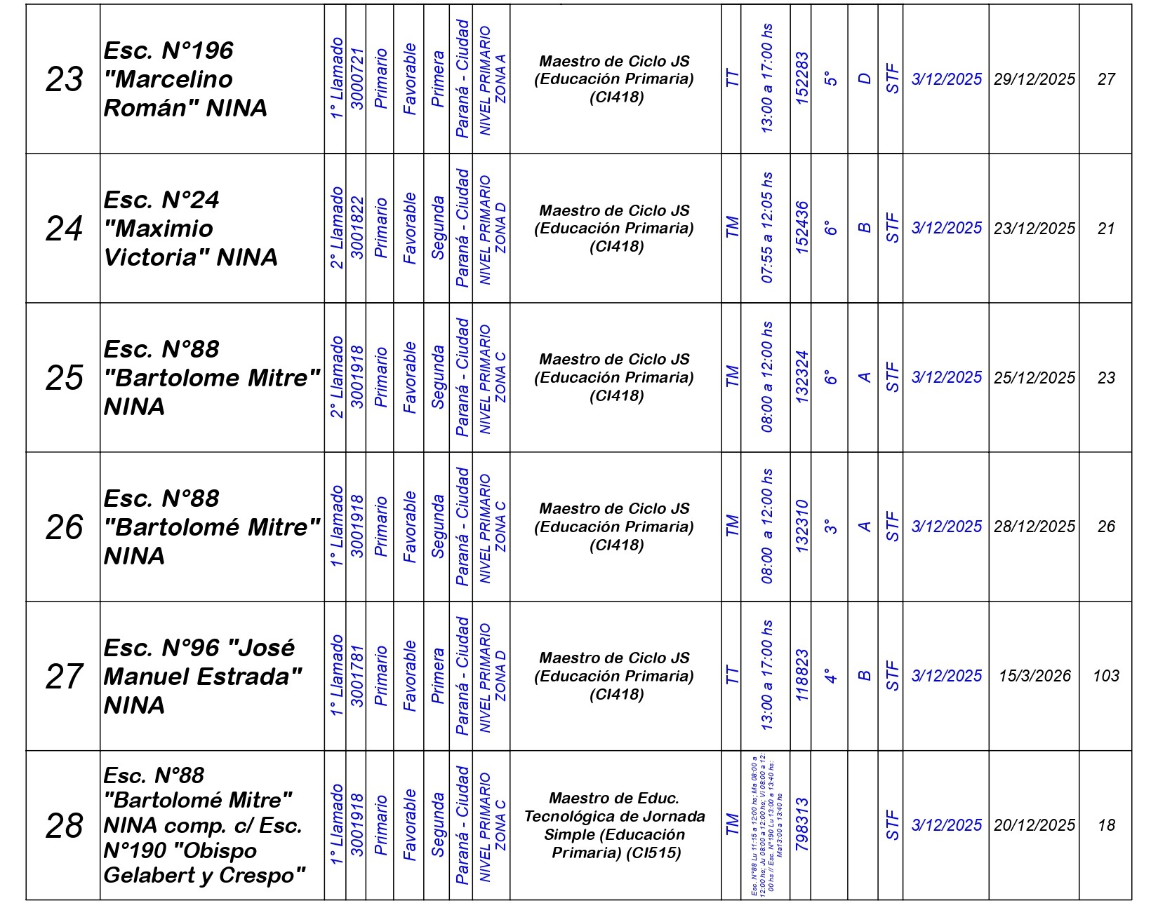La Dirección Departamental de Escuelas Paraná Convoca a concurso presencial para el día MIÉRCOLES 3 de DICIEMBRE de 2025 a partir de las 08:00 hs, en Salón de Concursos de la Dirección Departamental de Escuelas Paraná, sita en calle Don Bosco N°749 (Complejo “Eva Perón”) de la Ciudad de Paraná, para la cobertura de Cargos de Ascenso e Ingreso de Nivel Inicial – Primario y Modalidades. En el marco del Acuerdo Paritario /Reglamento de Concursos Resolución Ministerial N° 783 M.T. (Res. 1000/13) – Resolución N° 0691/21 CGE y sus modificatorias,- De Director, Resolución N° 1200/22 C.G.E. y modificatorias – De Vicedirector, Resolución N° 1200/22 C.G.E. y modificatorias – Listado de Suplencias vigentes: Listado de Suplencias de Ascenso N° 188 y el Listado de Suplencias de Ingreso N° 188.