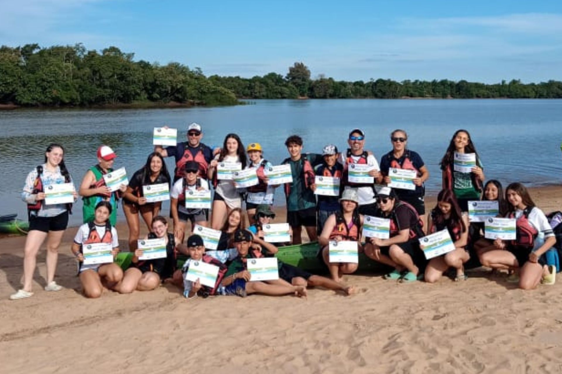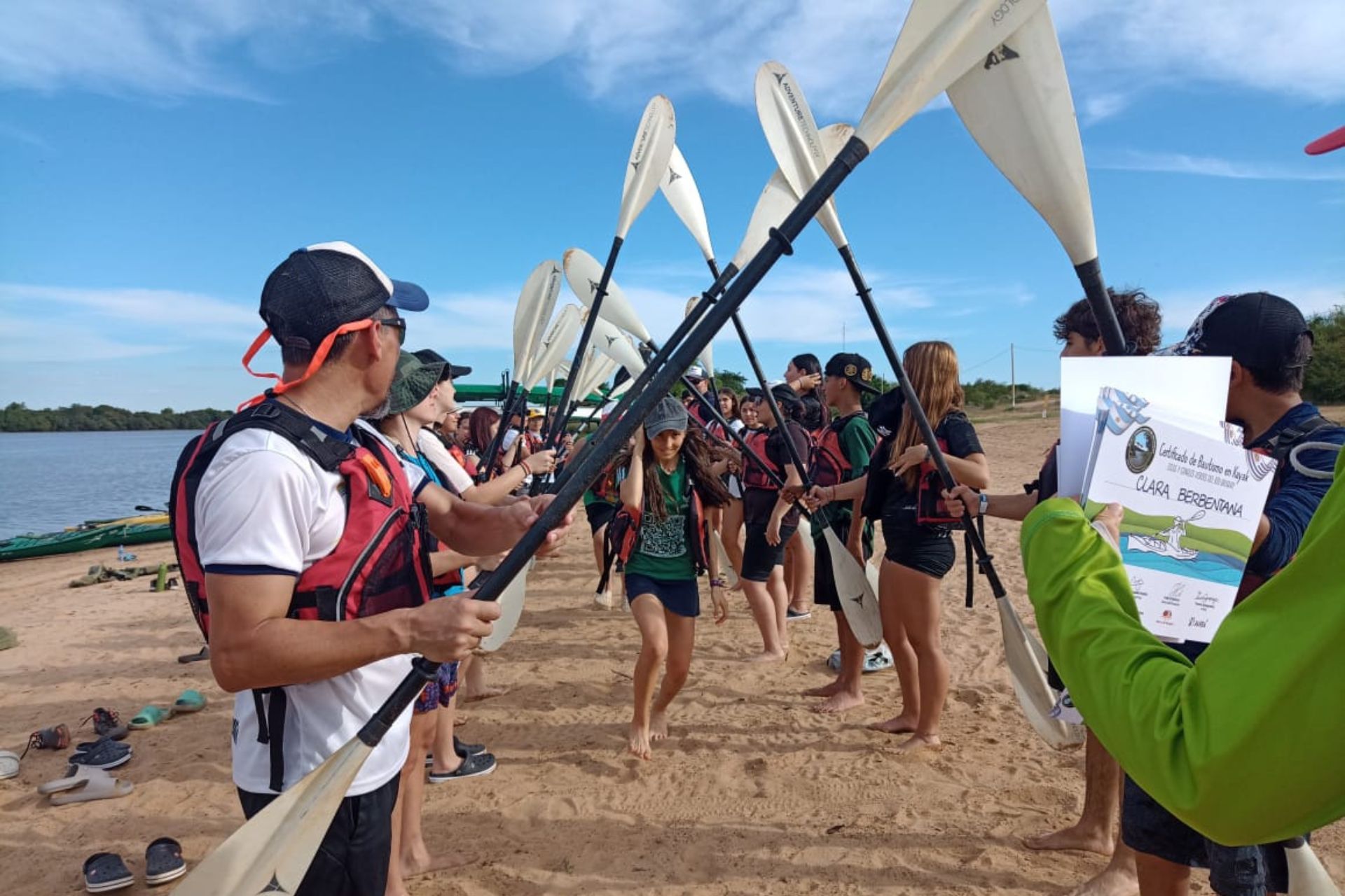 Al regresar a la costa, los estudiantes participaron en una ceremonia simbólica conocida como el “bautismo de kayak”, donde caminaron por un túnel de remos formado por sus compañeros y recibieron un certificado otorgado por la Fundación Banco de Bosques, que lleva las banderas de Argentina y Uruguay, ya que el programa también se implementa del lado uruguayo.